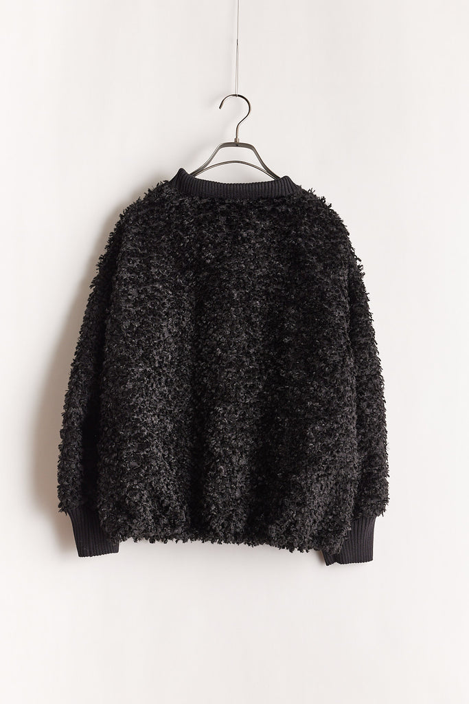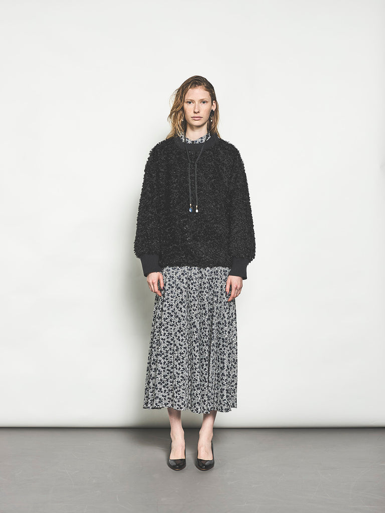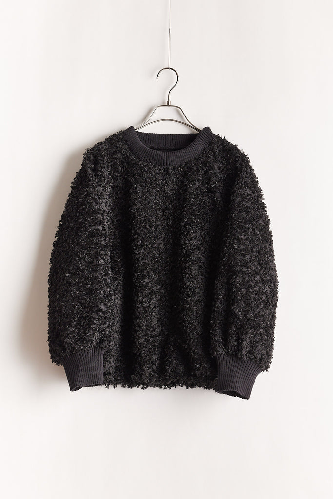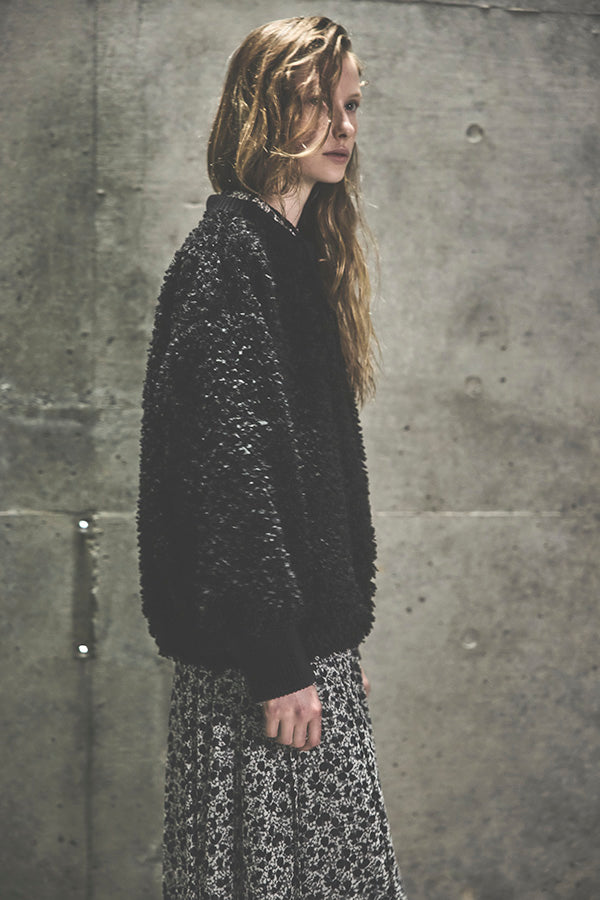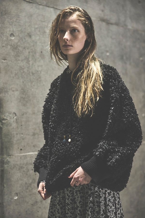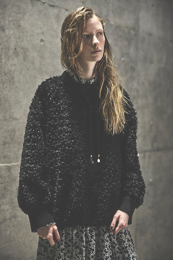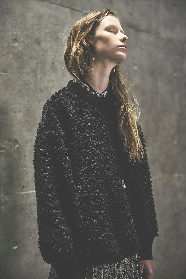 プードルのようにくるくるとした毛足が特徴的な、中肉厚のカットジャガード 。エアリーで膨らみあふれるボリューム感がありながらも、軽い着心地の素材です。 。