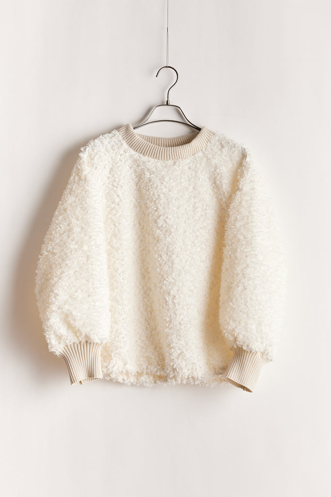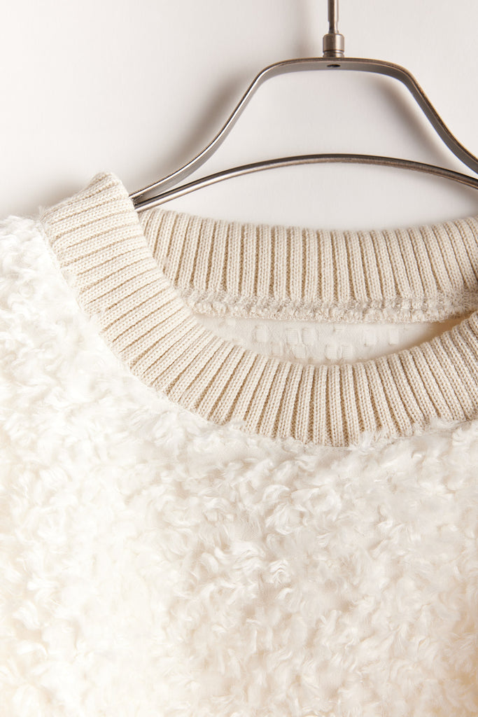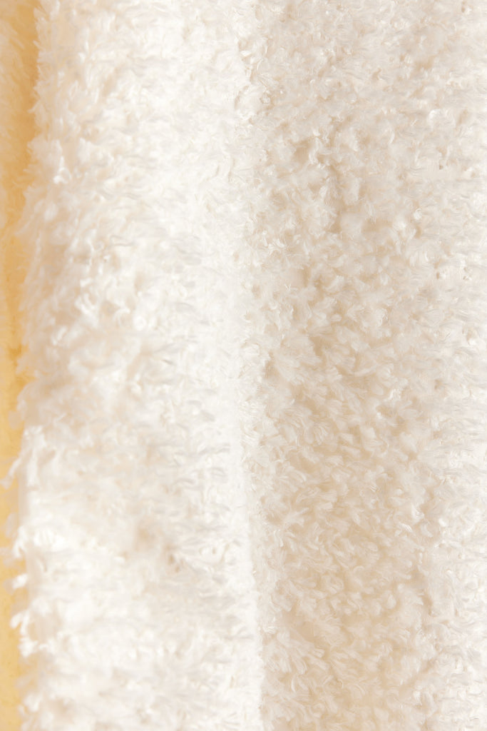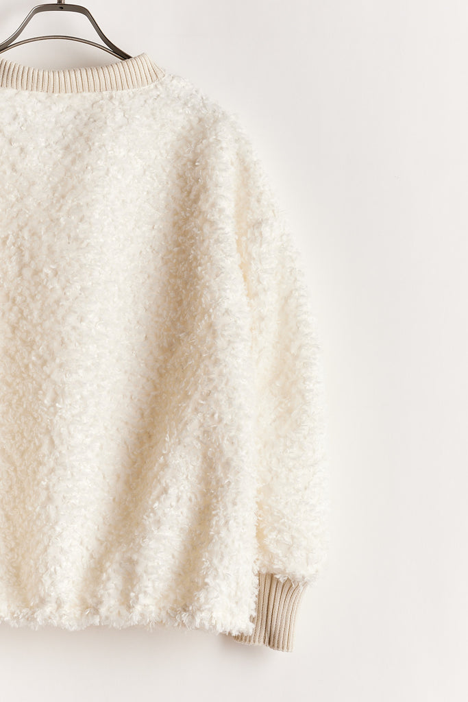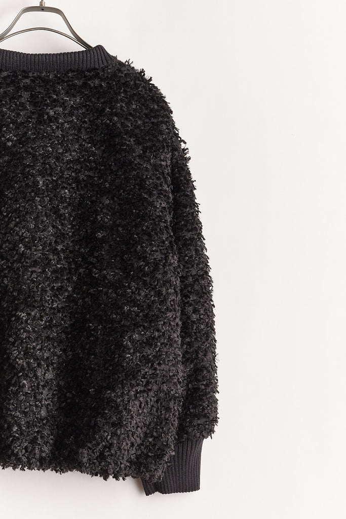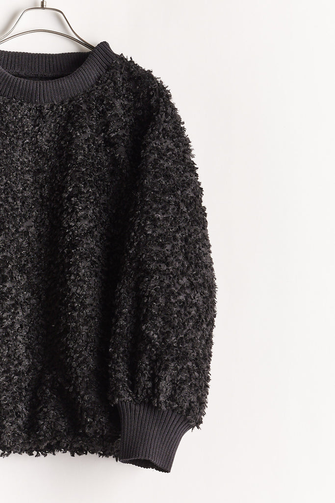 プードルのようにくるくるとした毛足が特徴的な、中肉厚のカットジャガード 。エアリーで膨らみあふれるボリューム感がありながらも、軽い着心地の素材です。 。