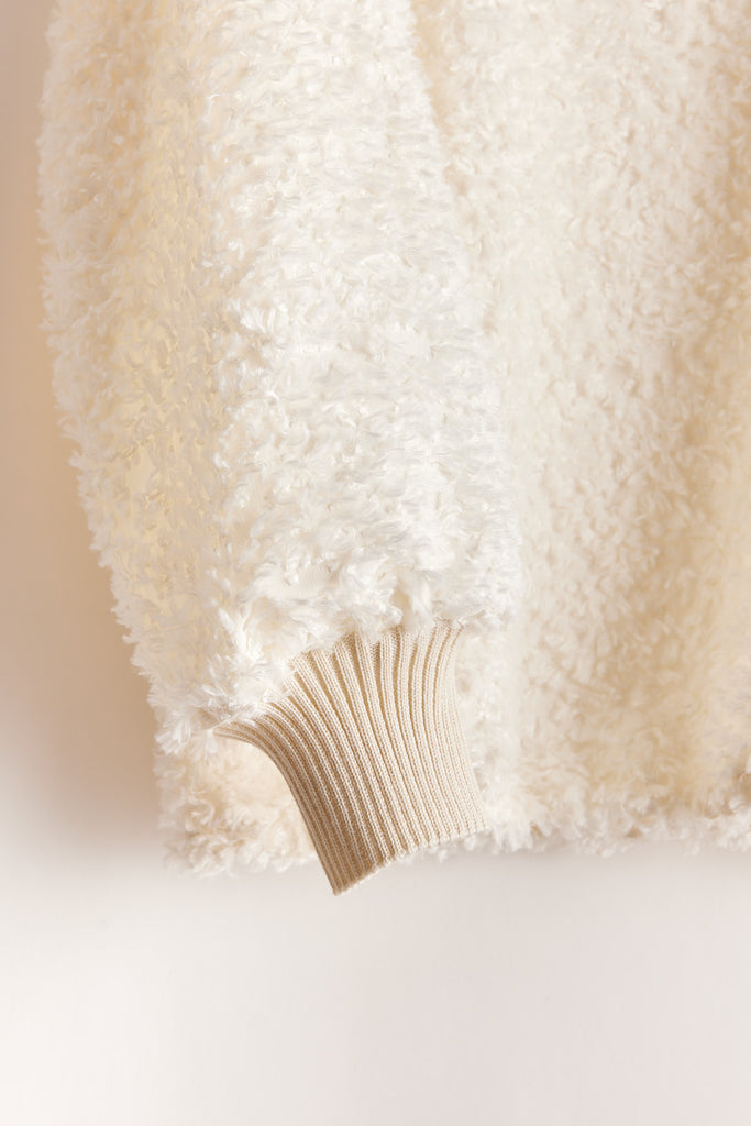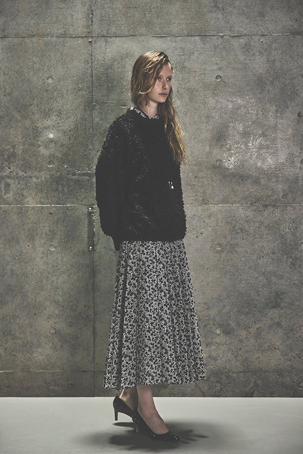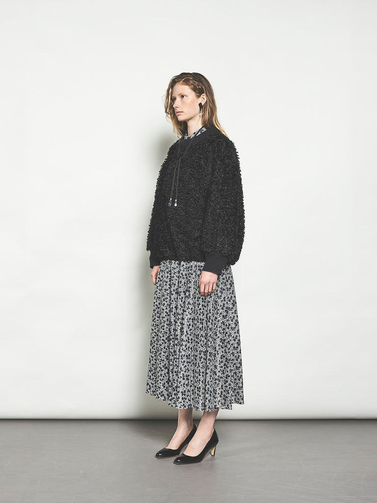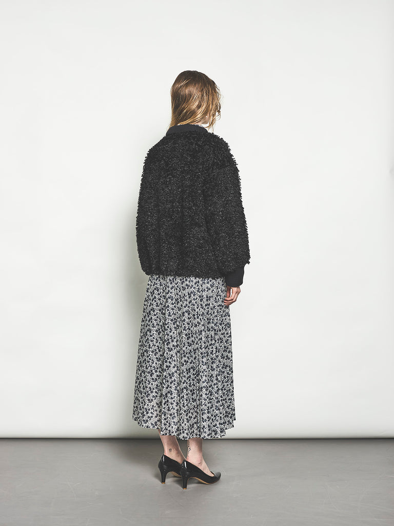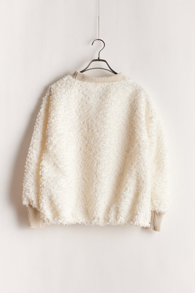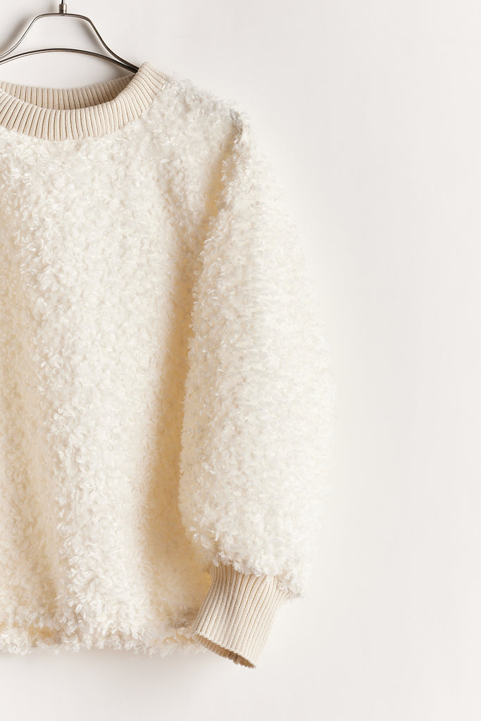 プードルのようにくるくるとした毛足が特徴的な、中肉厚のカットジャガード 。エアリーで膨らみあふれるボリューム感がありながらも、軽い着心地の素材です。 。