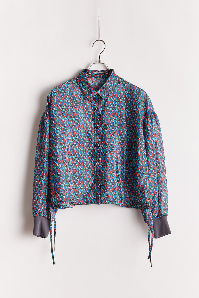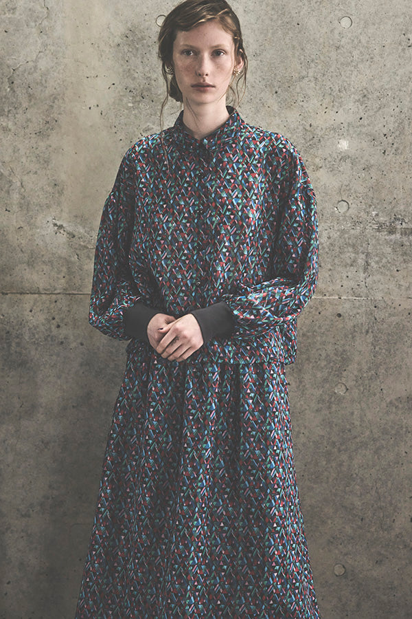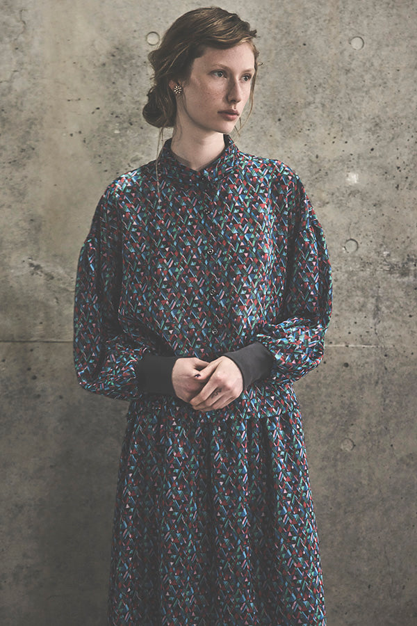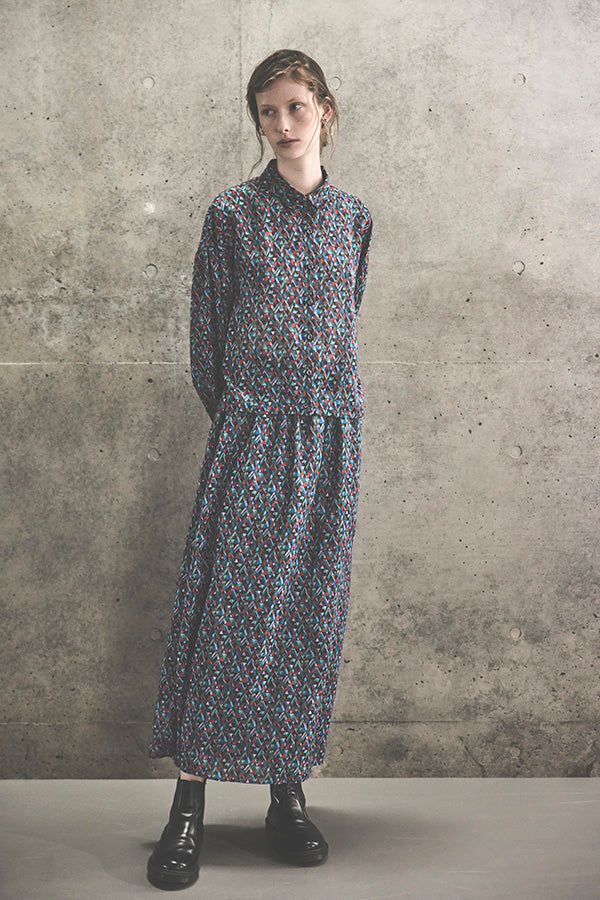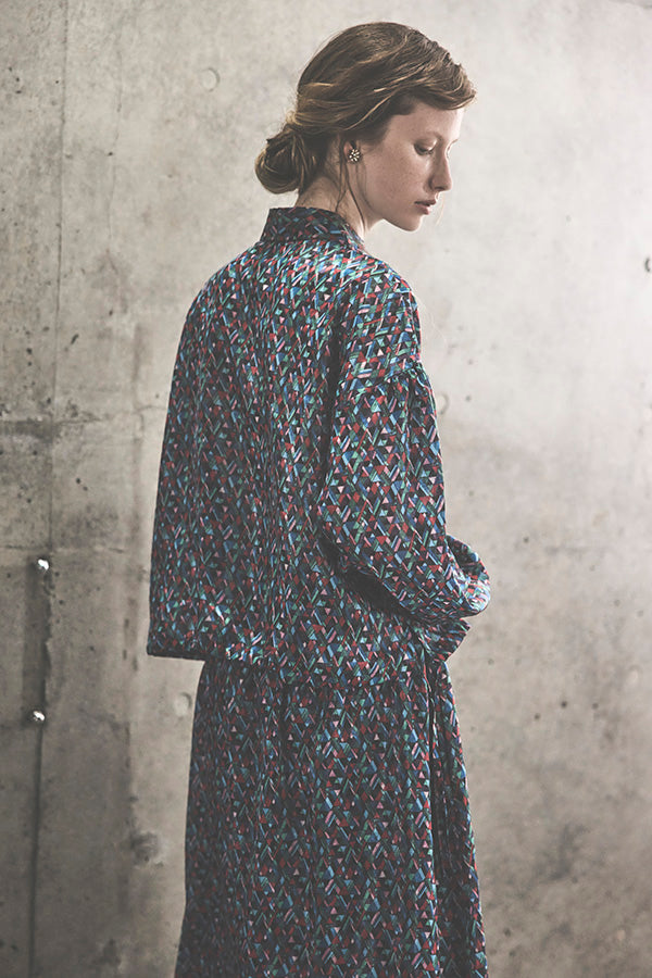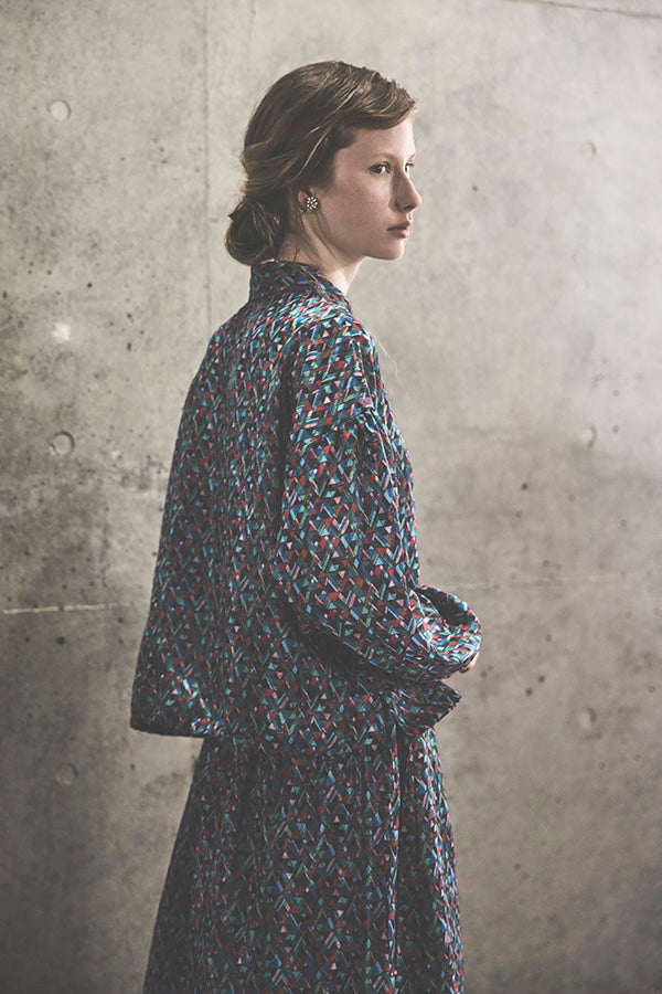 2025-26AWのSTELLA CIFFON オリジナルプリントです。 動きのある幾何学図形をタイルのように並べたグラフィカルなデザインです。 手描きタッチにすることでどこか柔らかく女性らしい雰囲気に仕上げました。 さらりとしたタッチと上品な光沢感があるスパークシフォンにのせました。 キラキラした軽いシフォンでプリントがのるとさらに華やぎます。 ポリエステル100%でシワになりにくくイージーケアな素材です。