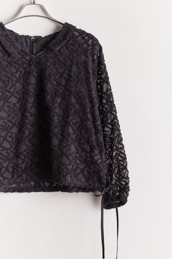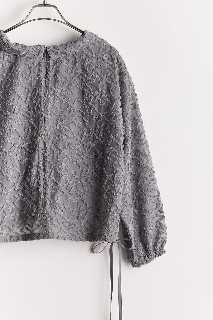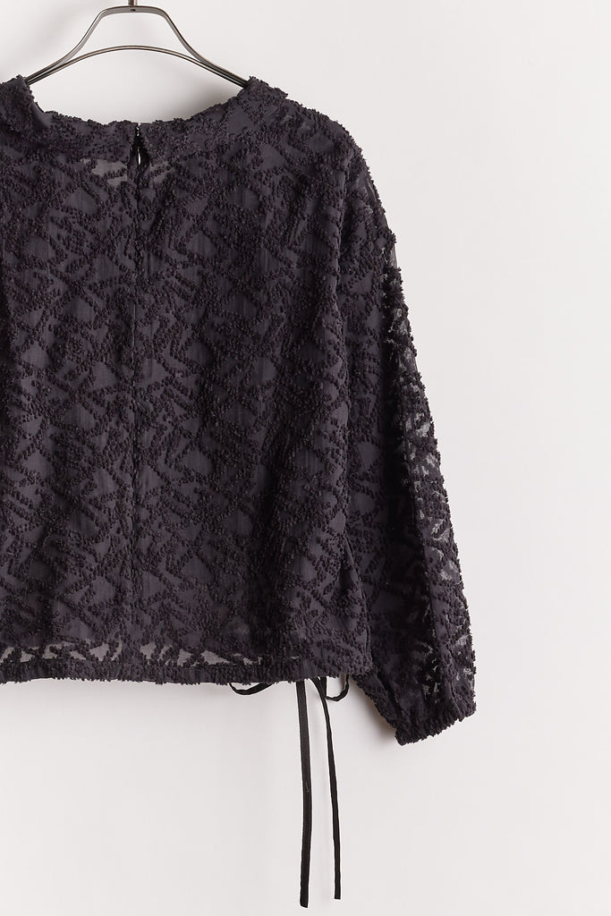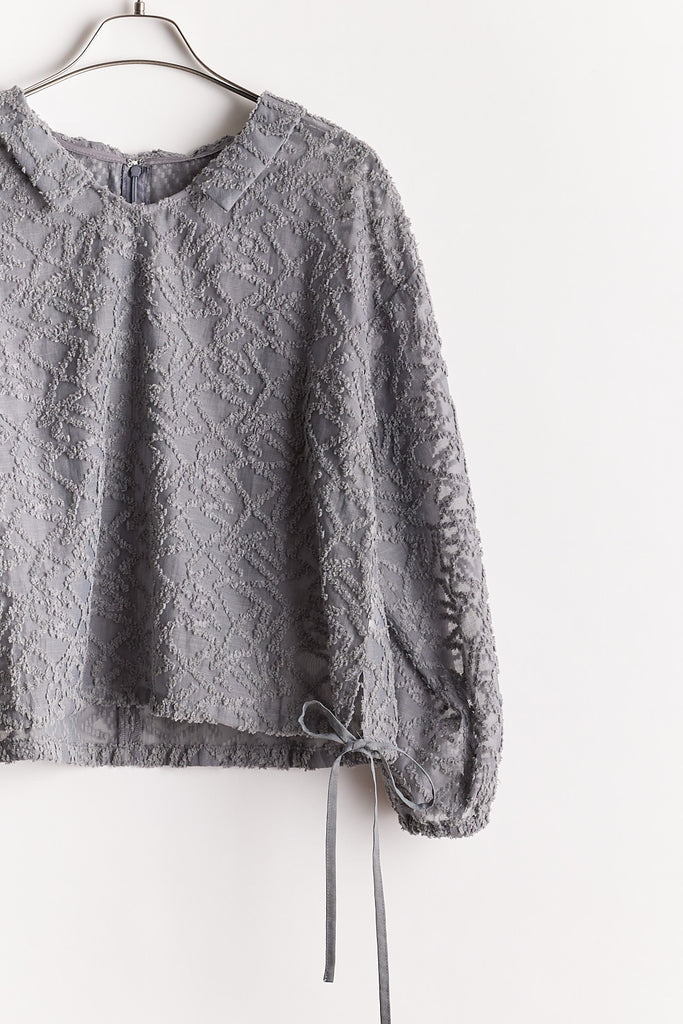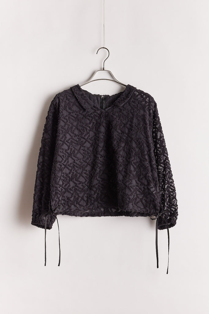 甘くなり過ぎない上品なフラットカラーブラウス。首元は浅目のVネックで小さめの襟がポイントです。 袖口にはゴムを入れており、たくし上げて更にボリュームを出しても◎。 短めの着丈に設定しているので、ボリュームのあるボトムスともバランス良く合わせられます。 裾に通されたリボンを絞ることで、シルエットに変化をつけてお楽しみいただけます。 同素材のスカートとSETUPでお楽しみいただけます。 透け感のある素材は春夏のイメージが強いですが、近年では合わせるアイテム次第で 秋冬スタイルとして提案されることも多くなってきた旬顔アイテム。 是非ワードローブに取り入れていただきたい一枚です。