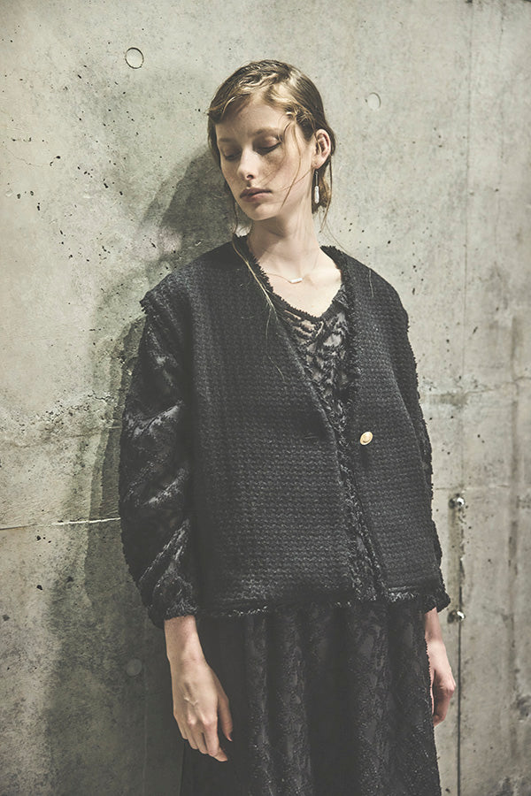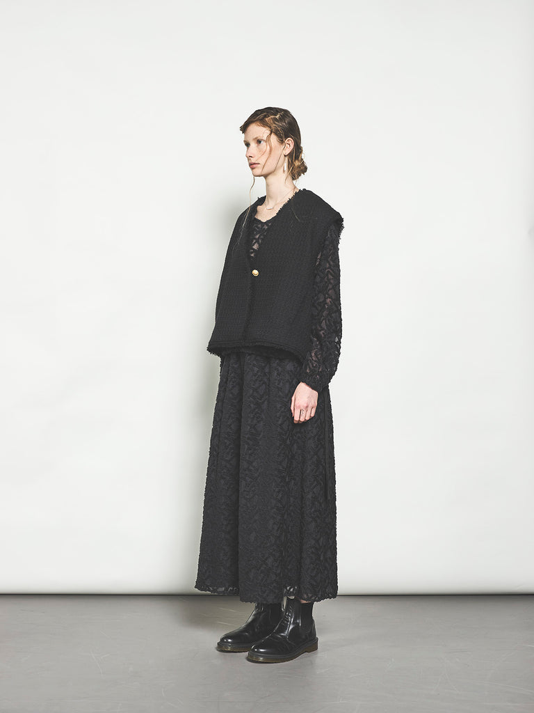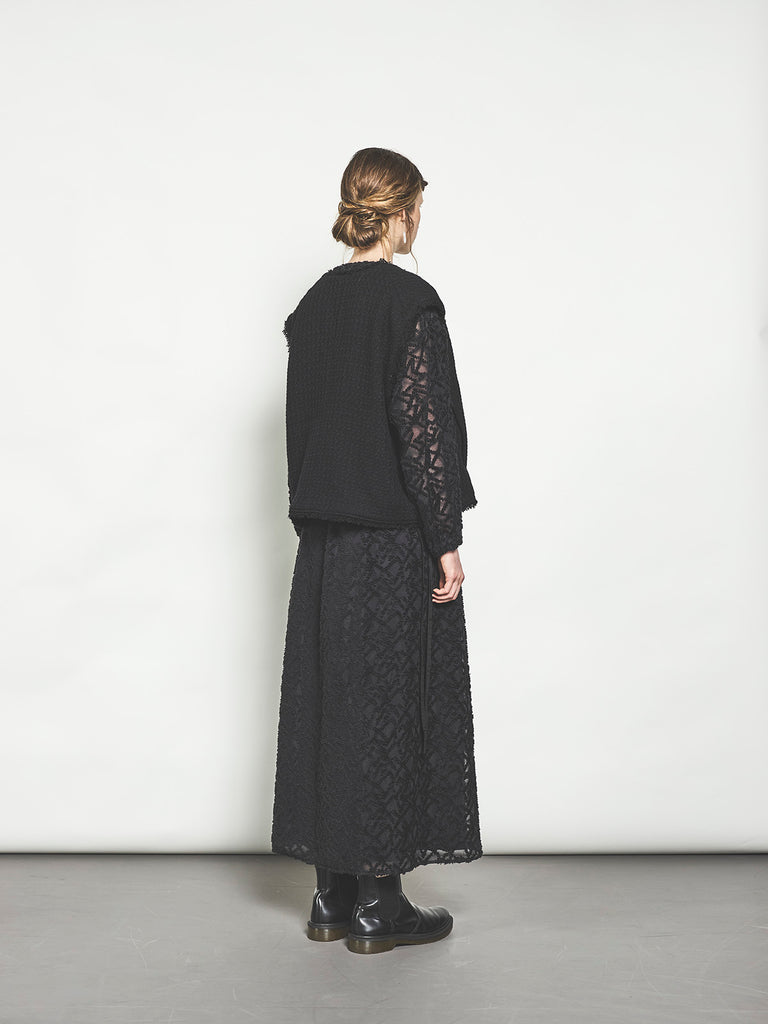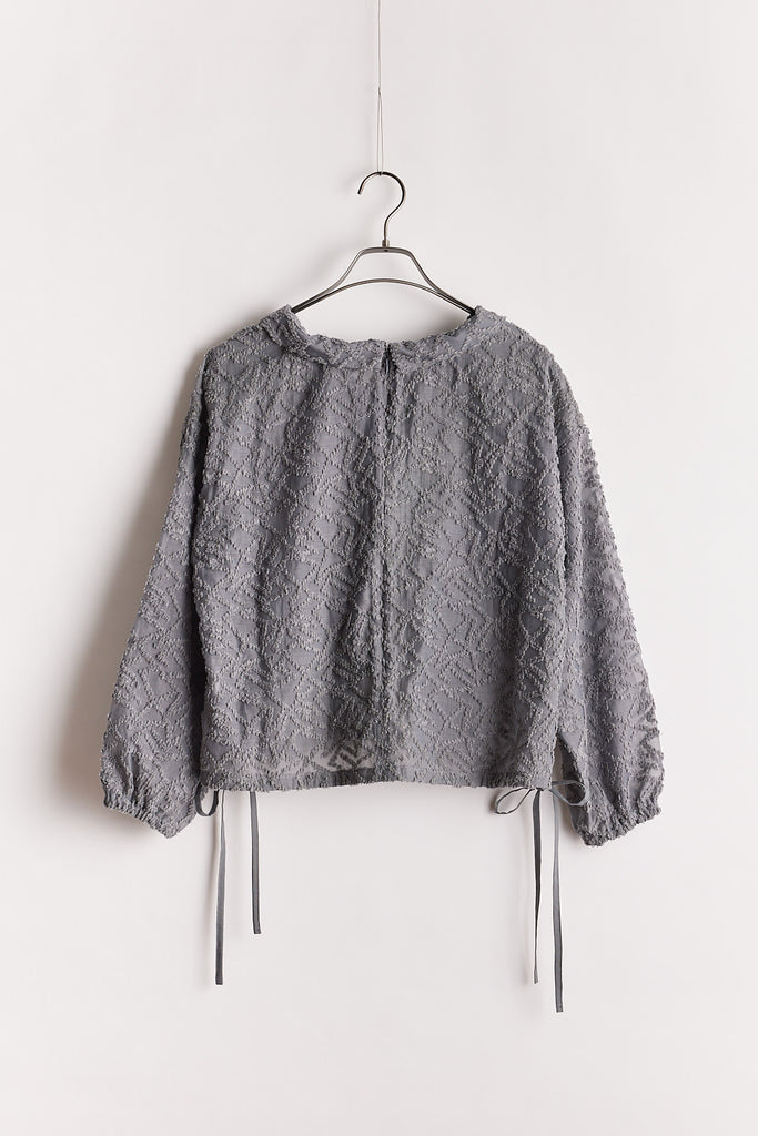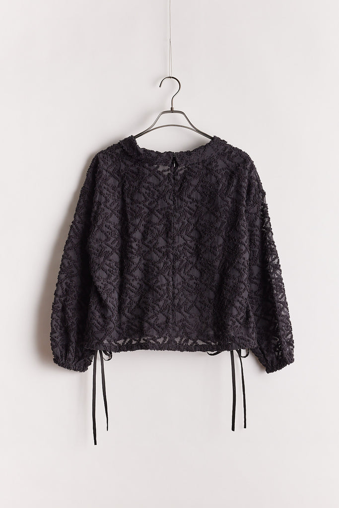 甘くなり過ぎない上品なフラットカラーブラウス。首元は浅目のVネックで小さめの襟がポイントです。 袖口にはゴムを入れており、たくし上げて更にボリュームを出しても◎。 短めの着丈に設定しているので、ボリュームのあるボトムスともバランス良く合わせられます。 裾に通されたリボンを絞ることで、シルエットに変化をつけてお楽しみいただけます。 同素材のスカートとSETUPでお楽しみいただけます。 透け感のある素材は春夏のイメージが強いですが、近年では合わせるアイテム次第で 秋冬スタイルとして提案されることも多くなってきた旬顔アイテム。 是非ワードローブに取り入れていただきたい一枚です。
