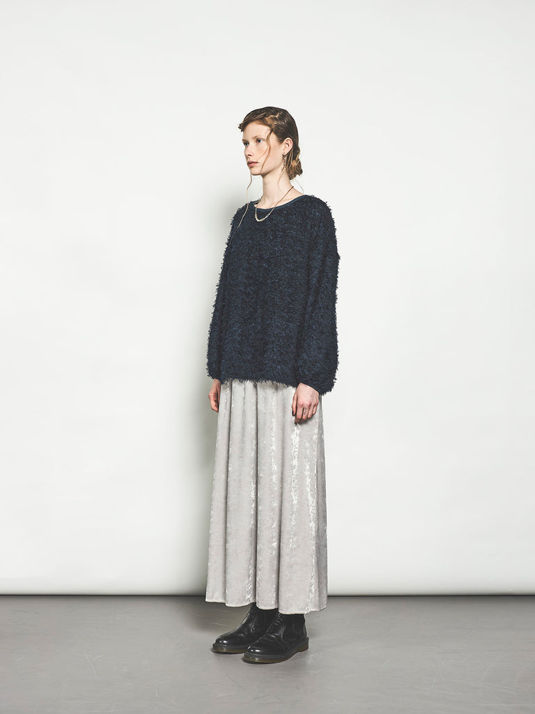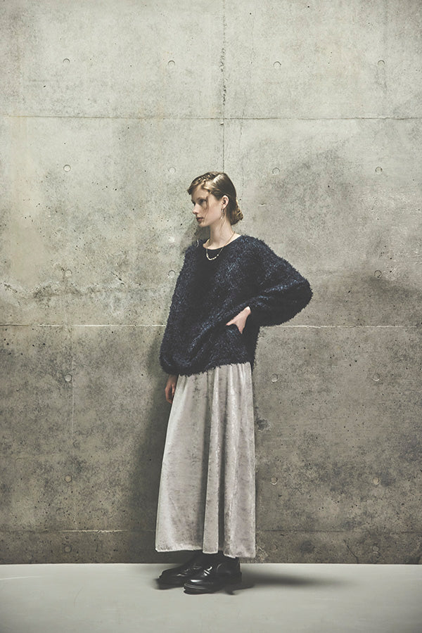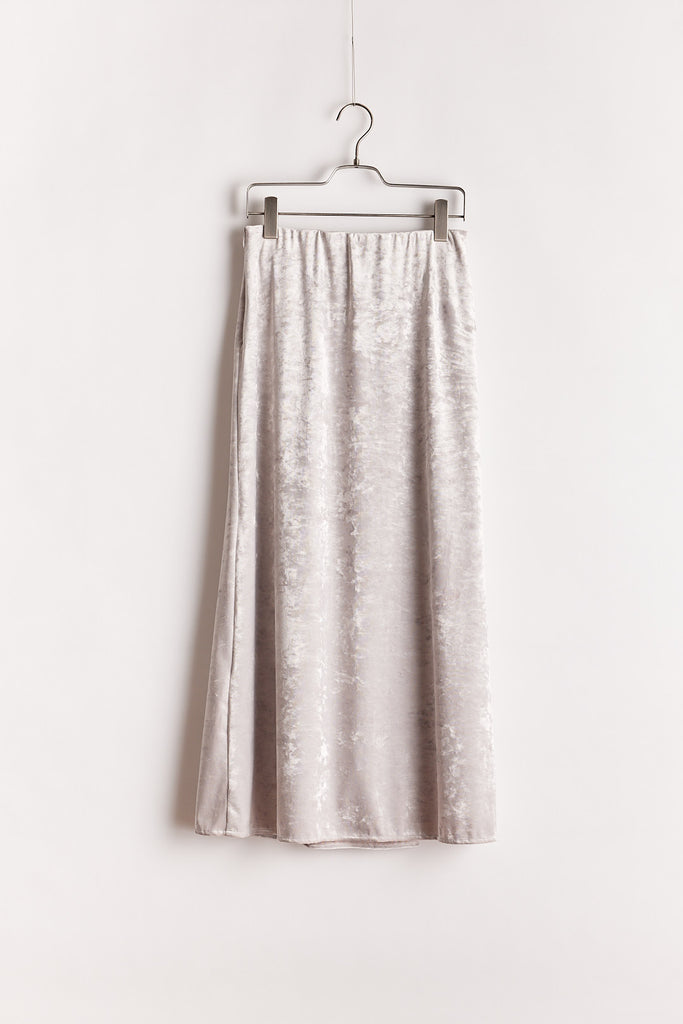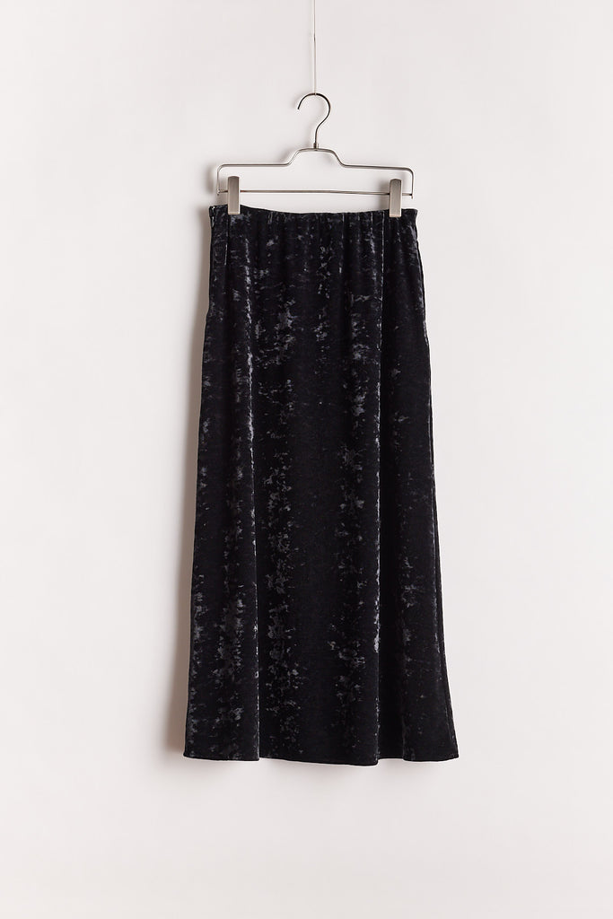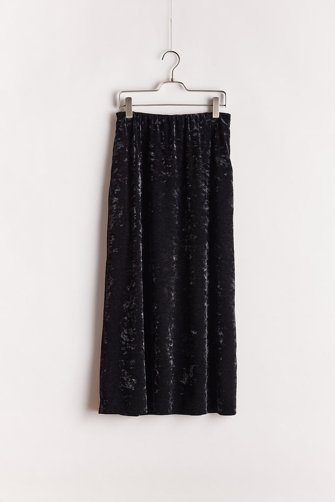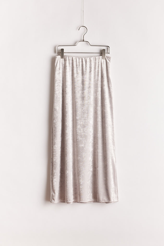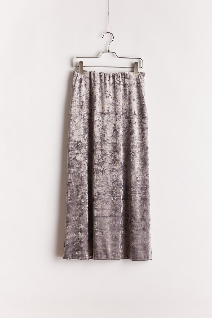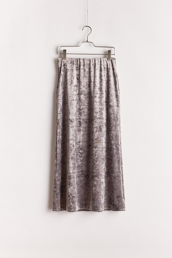 トレンドのクラッシュベロアを使用したロングスカート。ウエストから腰くらいまでのラインをタイトに仕上げ、裾にややフレアを入れシルエットに拘りました。美しい光沢と繊細な表情感が、カジュアルになりすぎず上品な印象です。ウエストインのスマートな装いや、ゆったりめのニットを合わせたラフなスタイリングもおすすめ。シンプルなTシャツを合わせて、冬を先取りするコーディネートをぜひ