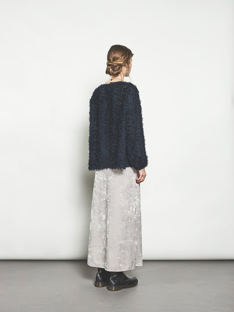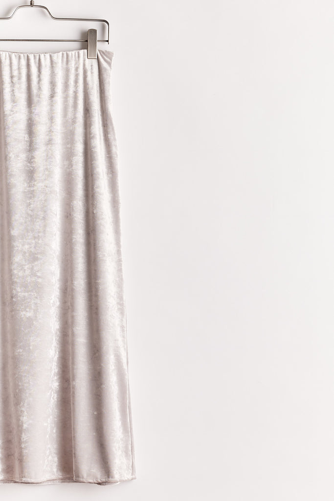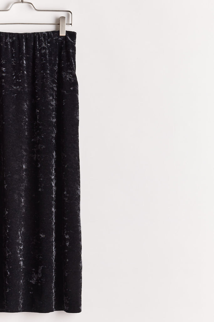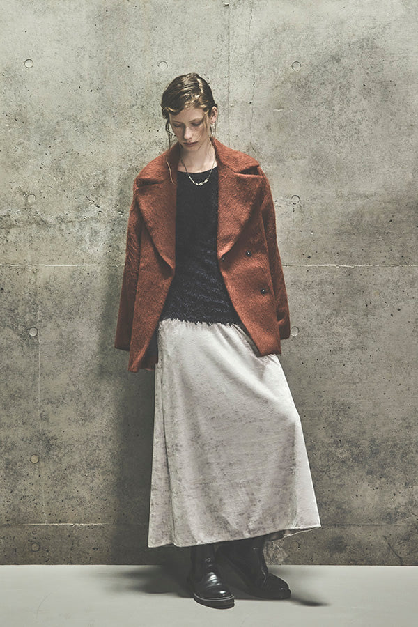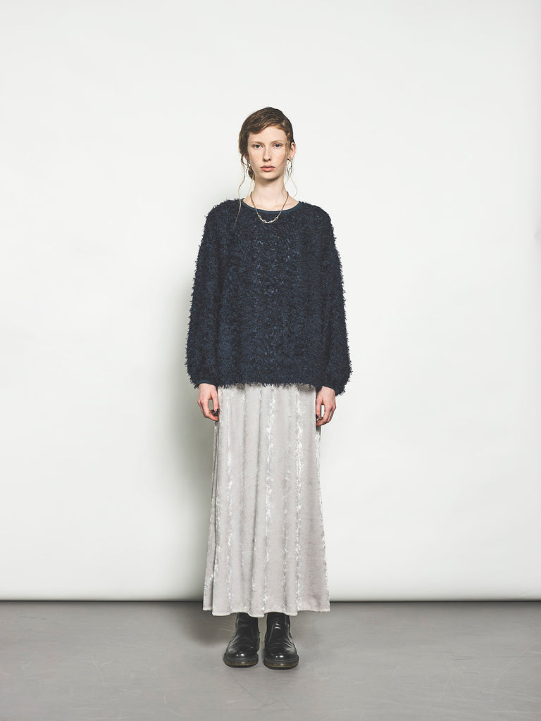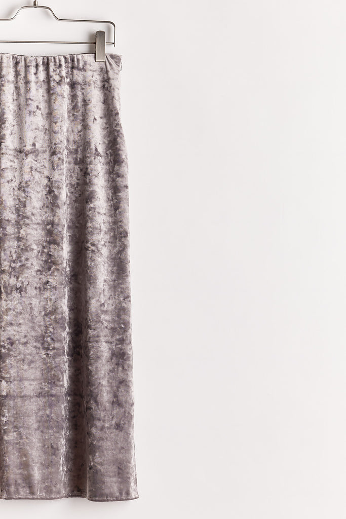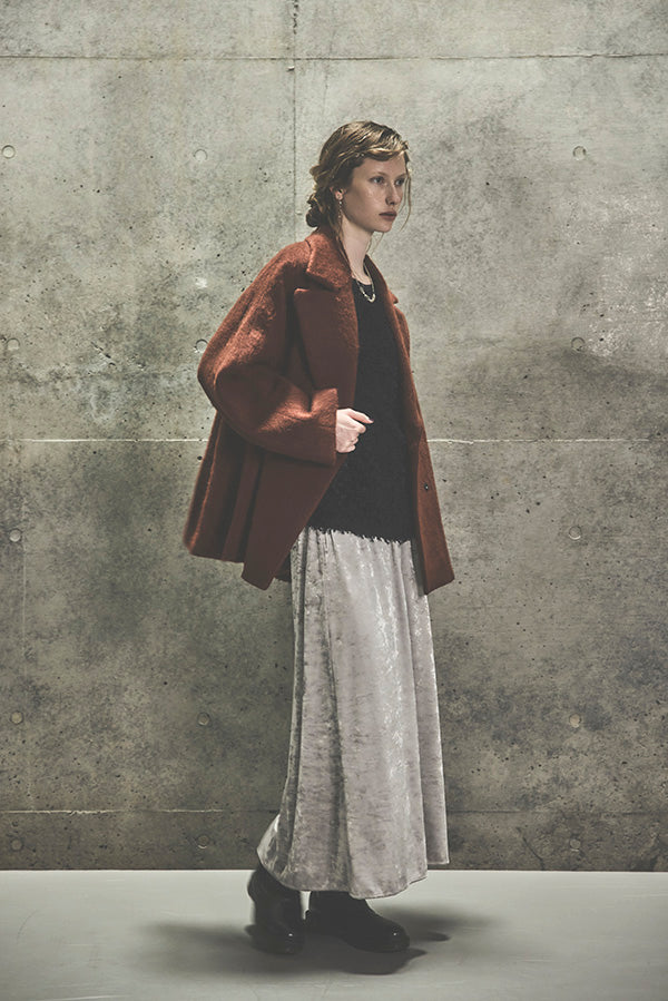 トレンドのクラッシュベロアを使用したロングスカート。ウエストから腰くらいまでのラインをタイトに仕上げ、裾にややフレアを入れシルエットに拘りました。美しい光沢と繊細な表情感が、カジュアルになりすぎず上品な印象です。ウエストインのスマートな装いや、ゆったりめのニットを合わせたラフなスタイリングもおすすめ。シンプルなTシャツを合わせて、冬を先取りするコーディネートをぜひ