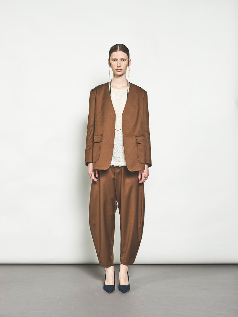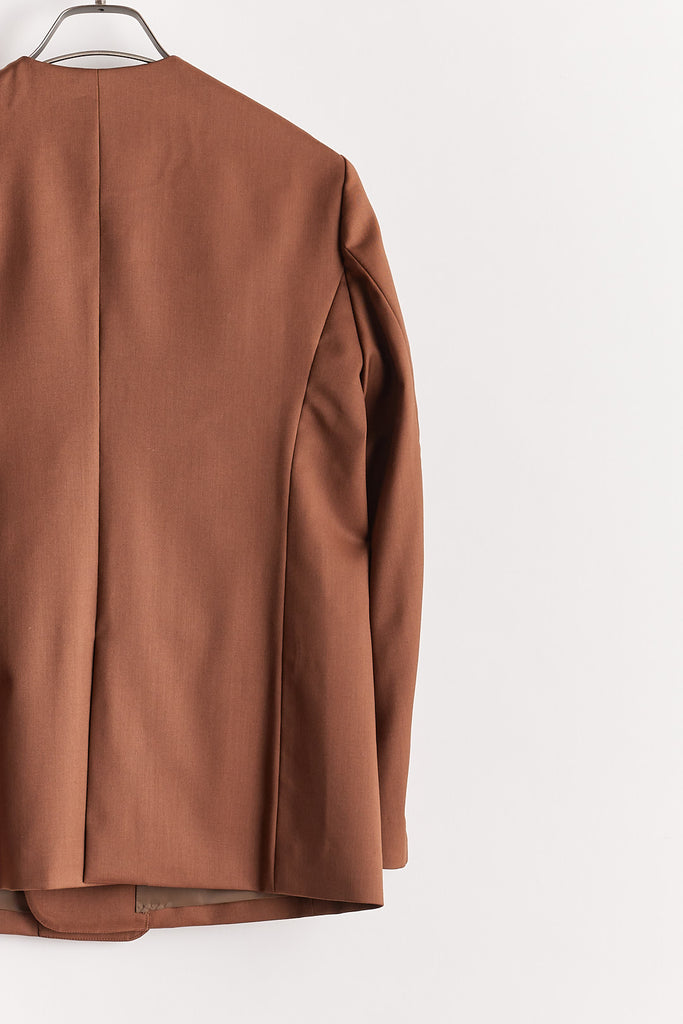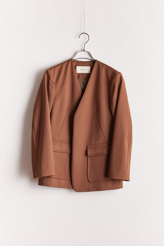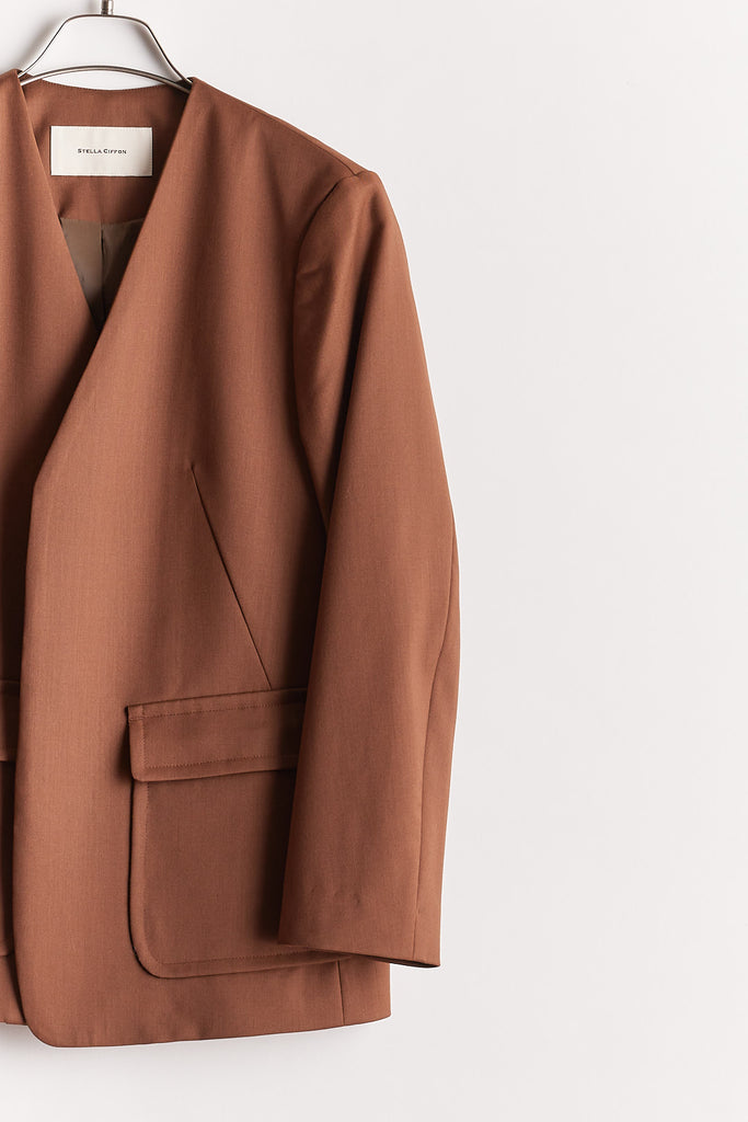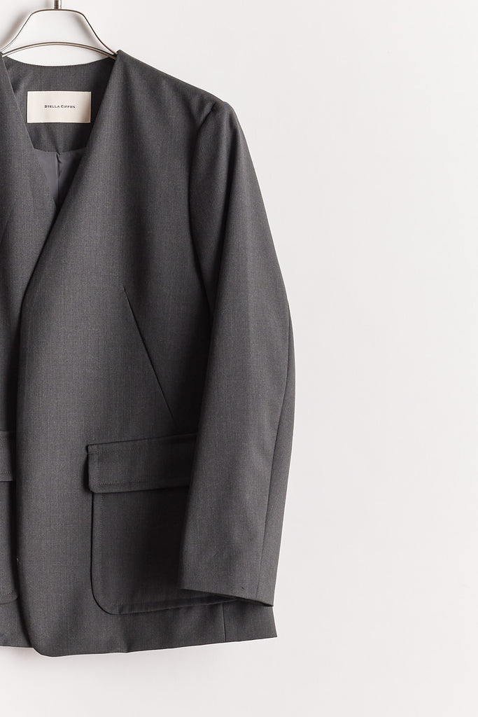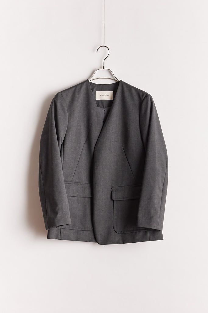 深めのVあきがシャープな印象、程よくシェイプされたウエストラインで女性らしいバランスで仕上げた ノーカラージャケット。カラーレスなデザインがインナーを選ばず様々なスタイリングを楽しめます。トレンド感のあるウエストの大きめダブルポケットがポイント。セットアップのパンツと合わせれば、オフィスからオケージョンまで幅広く活躍するアイテムですパンツだけでなくワンピースとの合わせも素敵です。