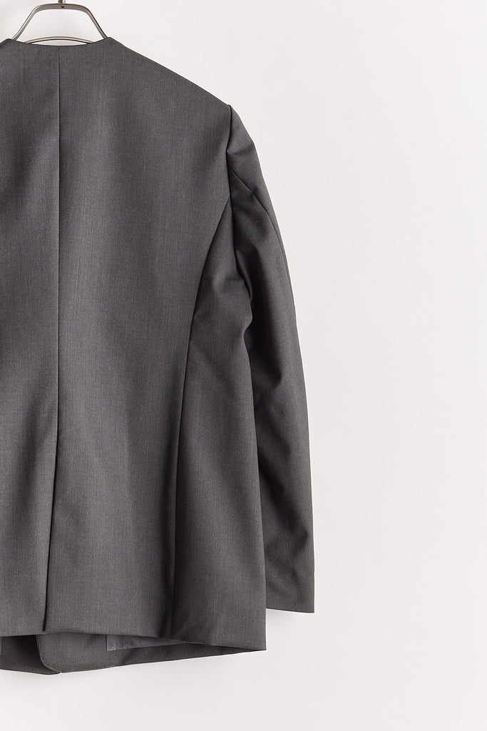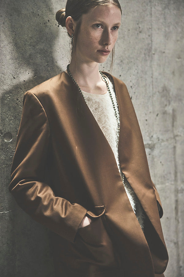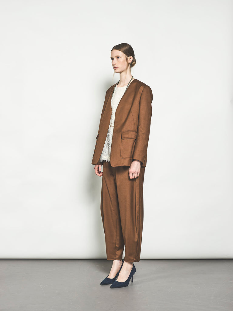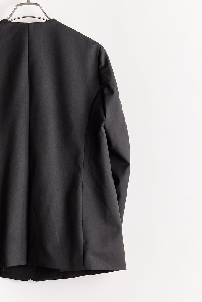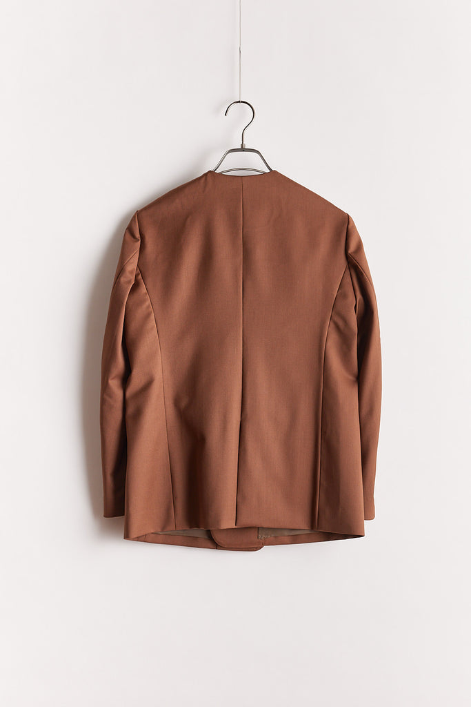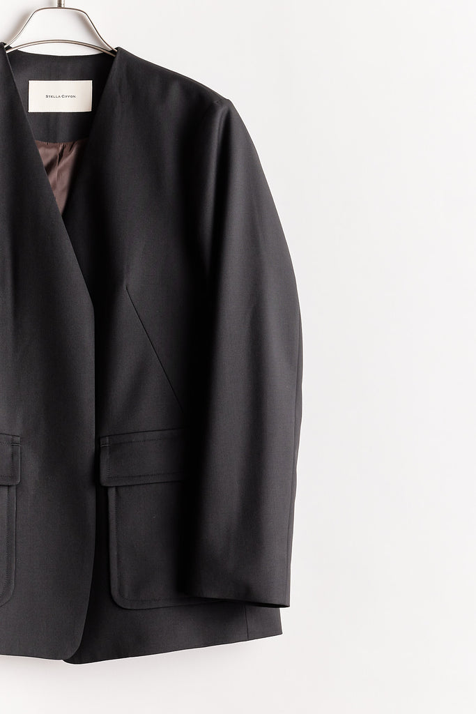 深めのVあきがシャープな印象、程よくシェイプされたウエストラインで女性らしいバランスで仕上げた ノーカラージャケット。カラーレスなデザインがインナーを選ばず様々なスタイリングを楽しめます。トレンド感のあるウエストの大きめダブルポケットがポイント。セットアップのパンツと合わせれば、オフィスからオケージョンまで幅広く活躍するアイテムですパンツだけでなくワンピースとの合わせも素敵です。