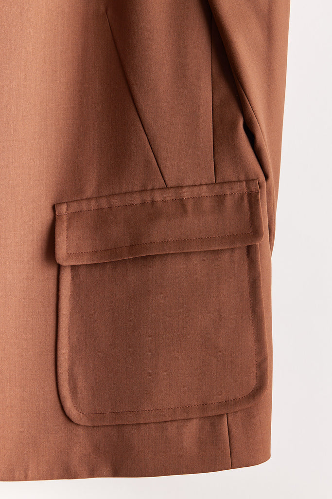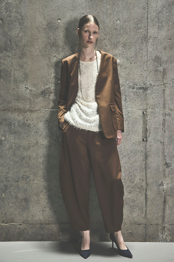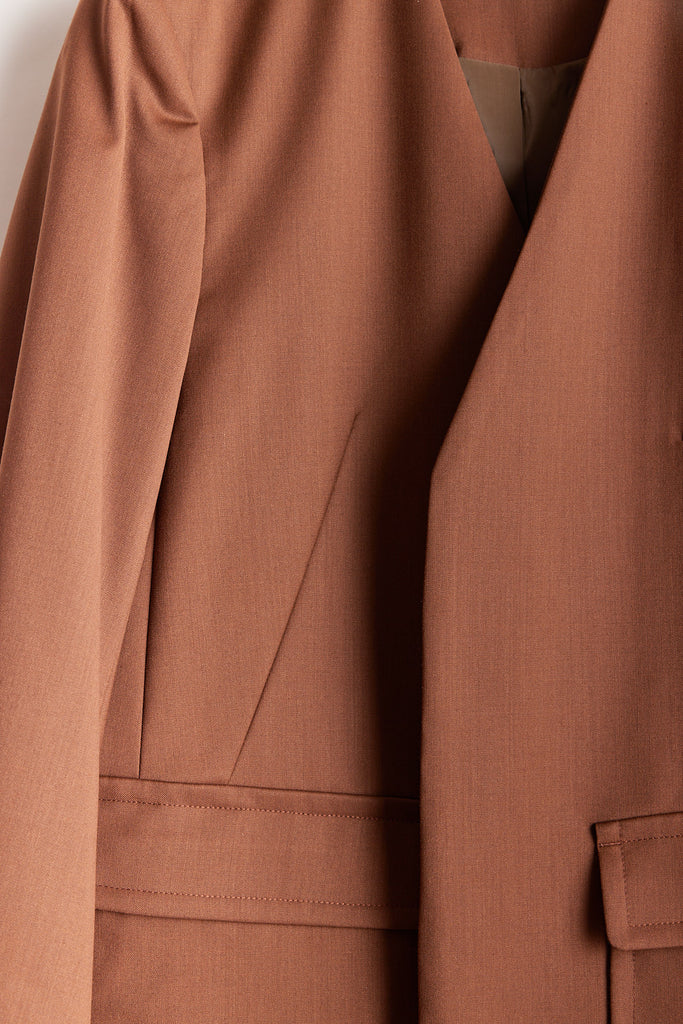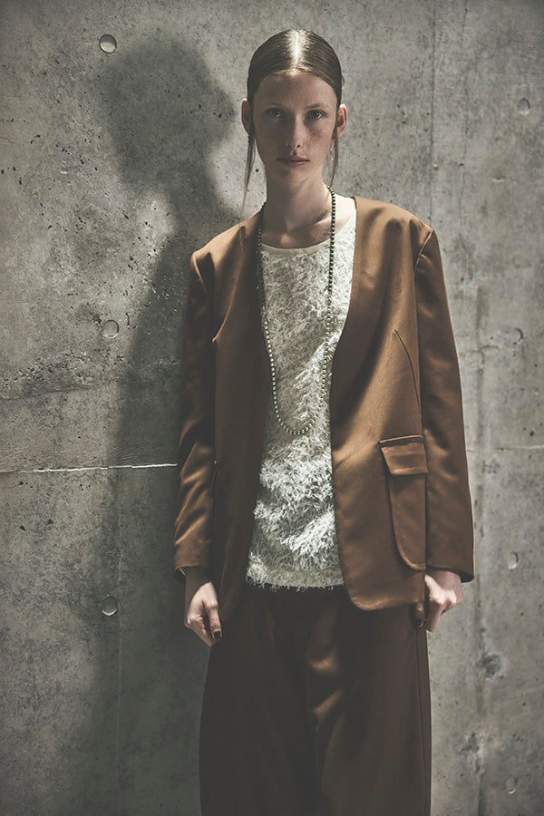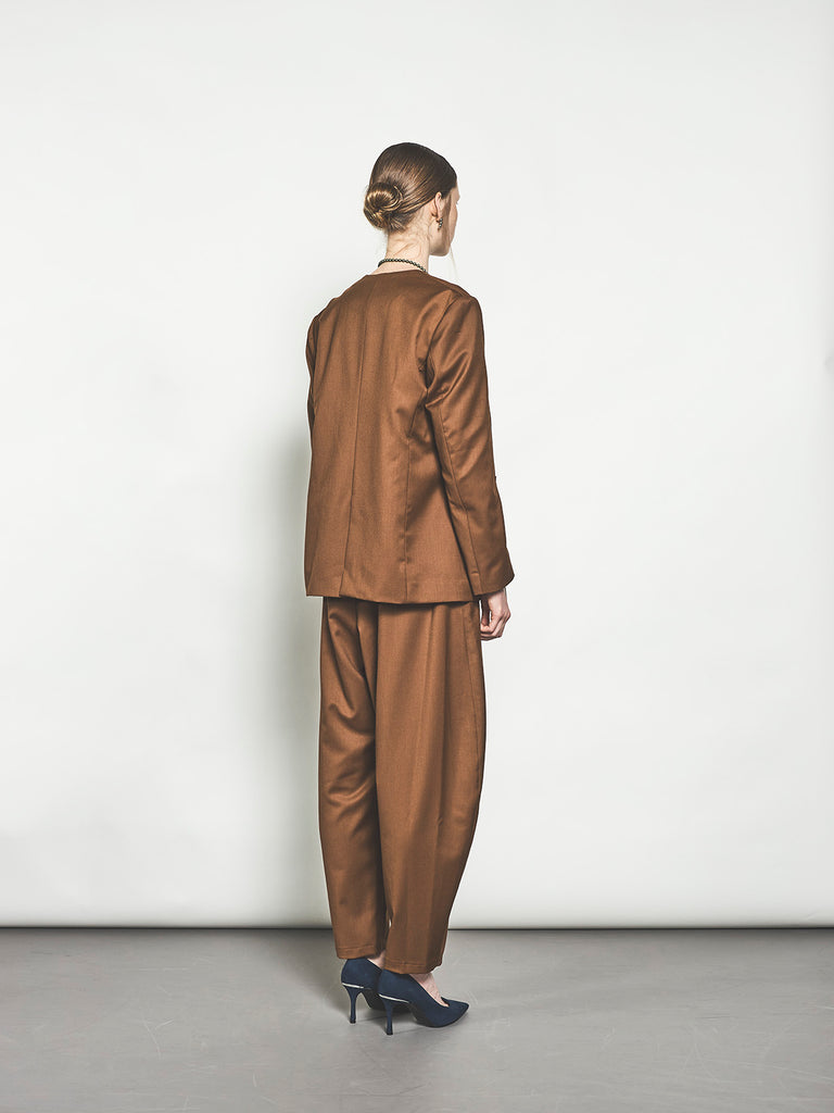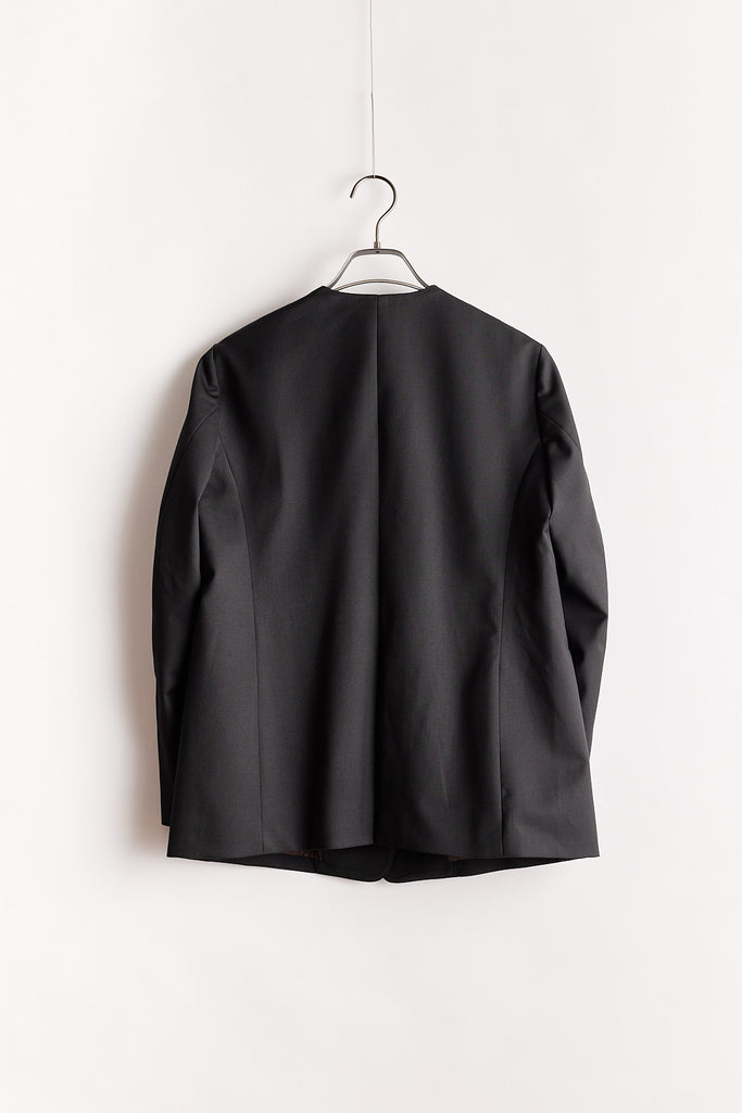 深めのVあきがシャープな印象、程よくシェイプされたウエストラインで女性らしいバランスで仕上げた ノーカラージャケット。カラーレスなデザインがインナーを選ばず様々なスタイリングを楽しめます。トレンド感のあるウエストの大きめダブルポケットがポイント。セットアップのパンツと合わせれば、オフィスからオケージョンまで幅広く活躍するアイテムですパンツだけでなくワンピースとの合わせも素敵です。