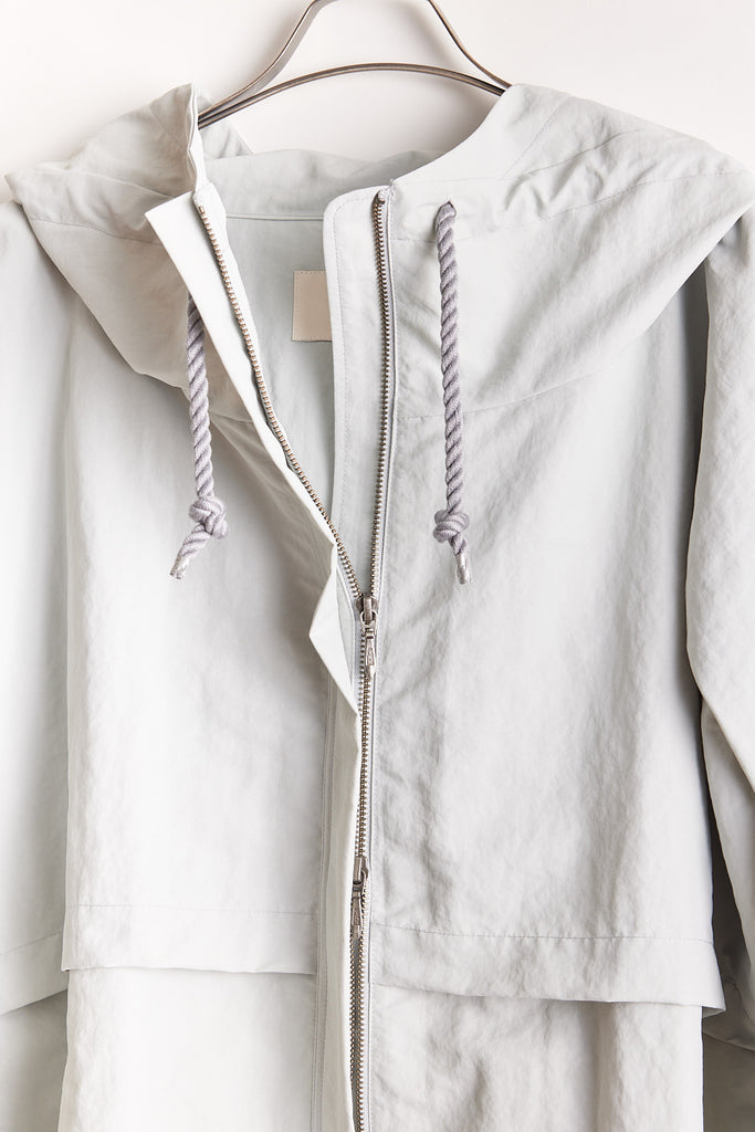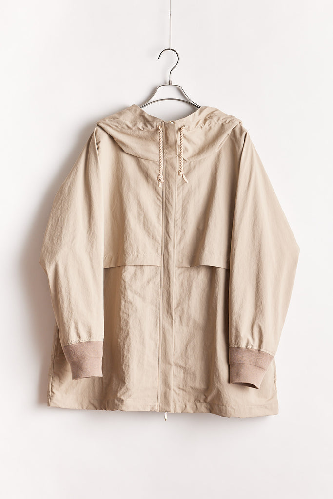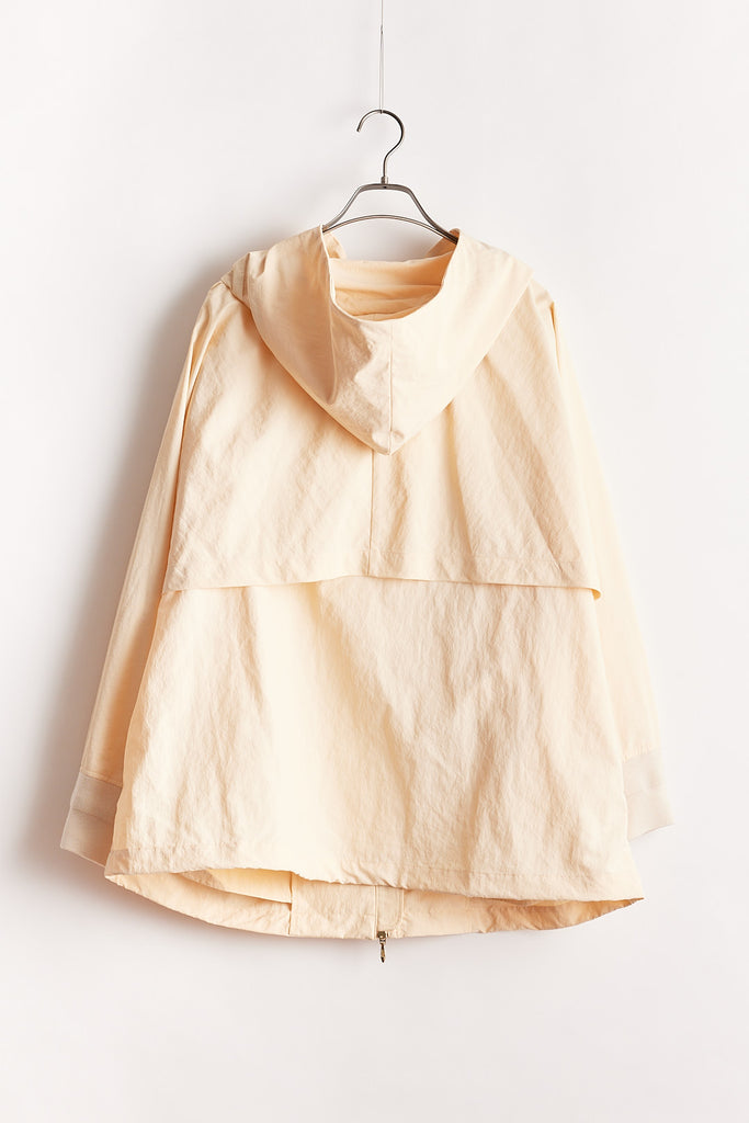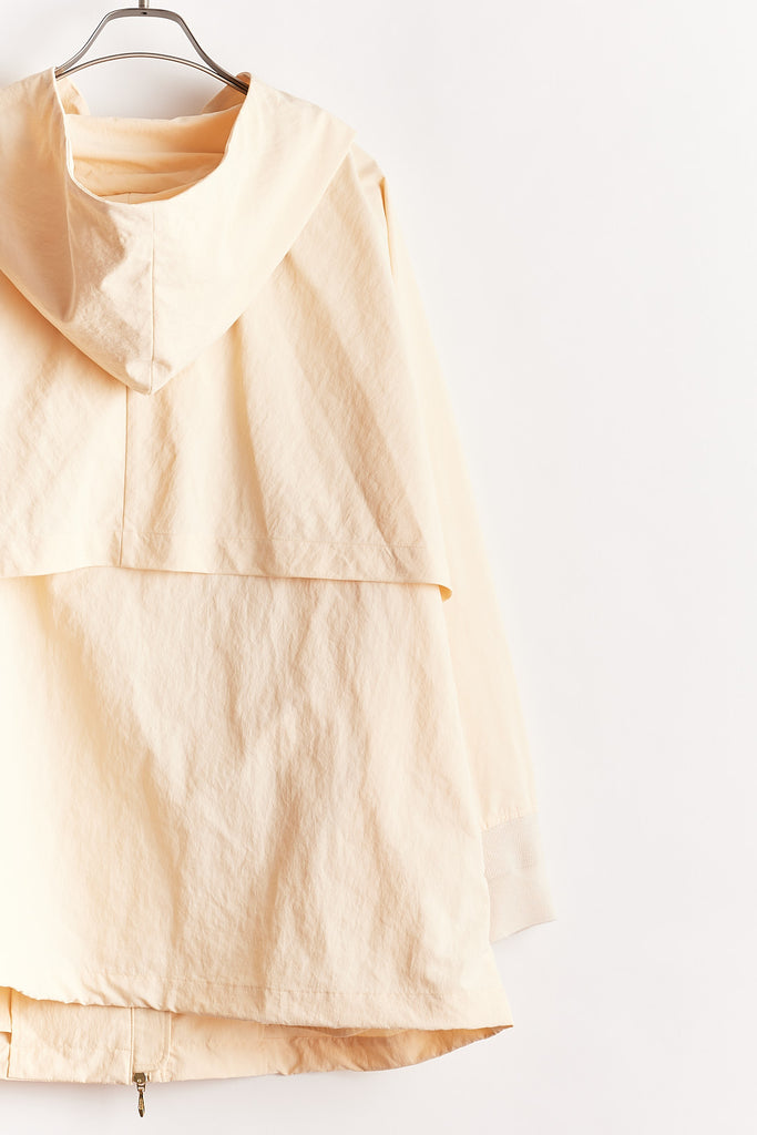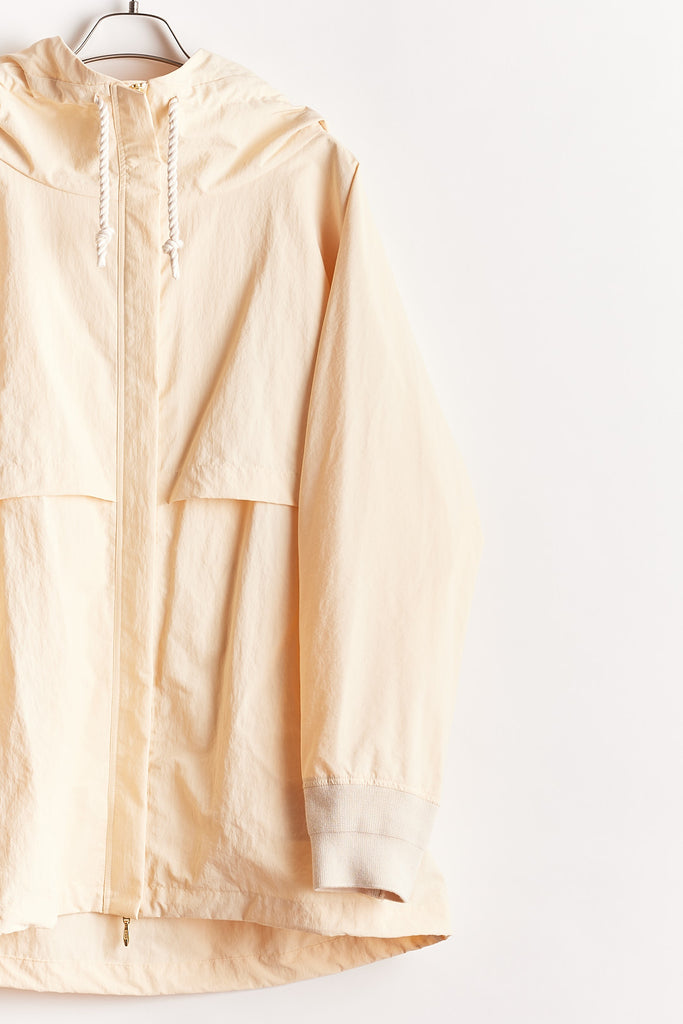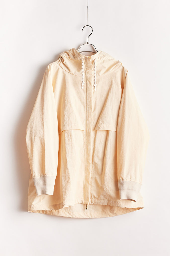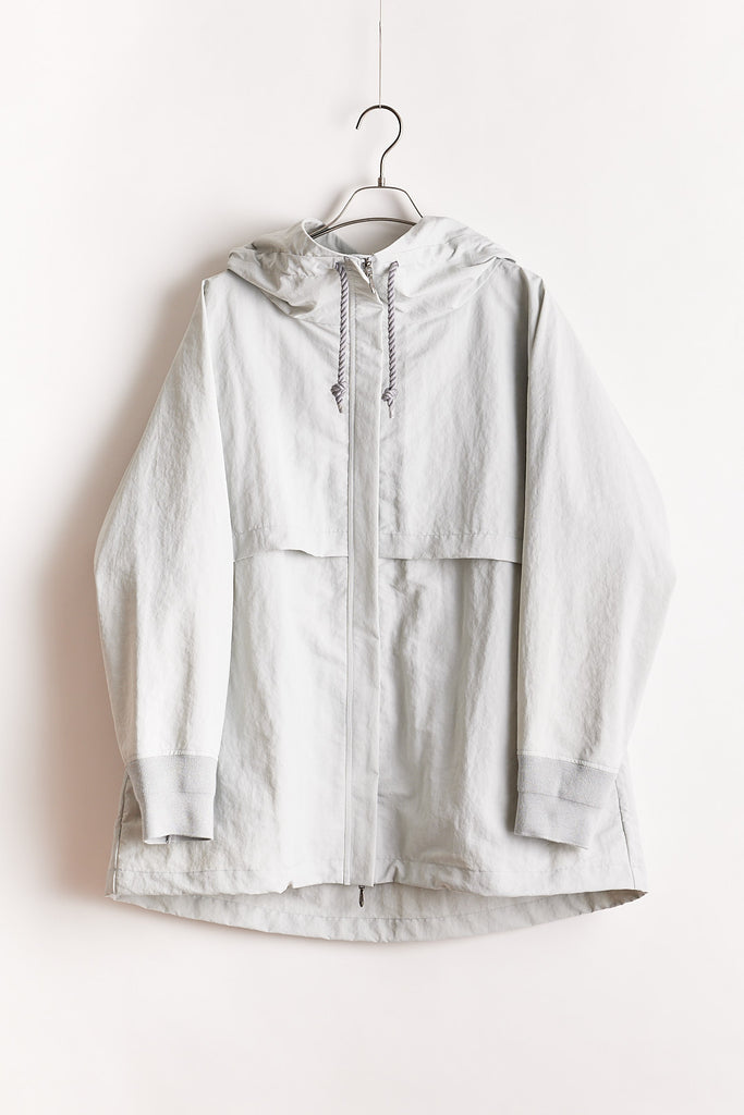 リサイクルナイロンを使用した、環境にやさしい撥水ブルゾン。軽量でコンパクトながらハリ感のある素材感で、フード付きのデザインで実用性とスタイルを兼ね備えた万能アウターです。デイリーに使いやすいタウンユースなライトアウターとして軽快にデニムやワイドパンツと合わせ、Tシャツの上にさらっと羽織るだけでサマになります。