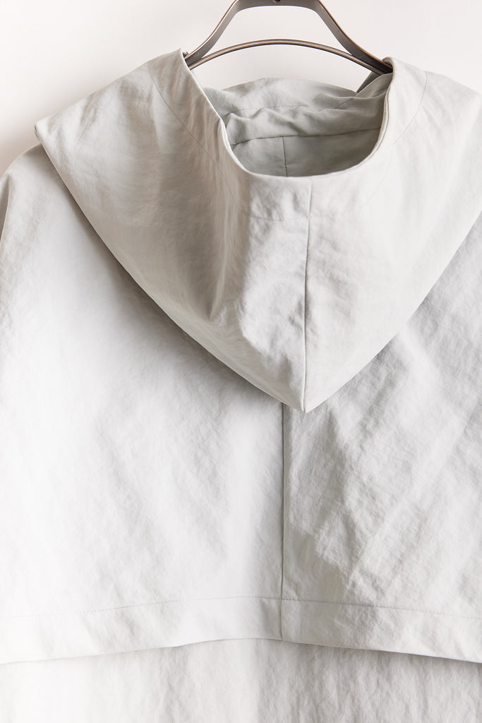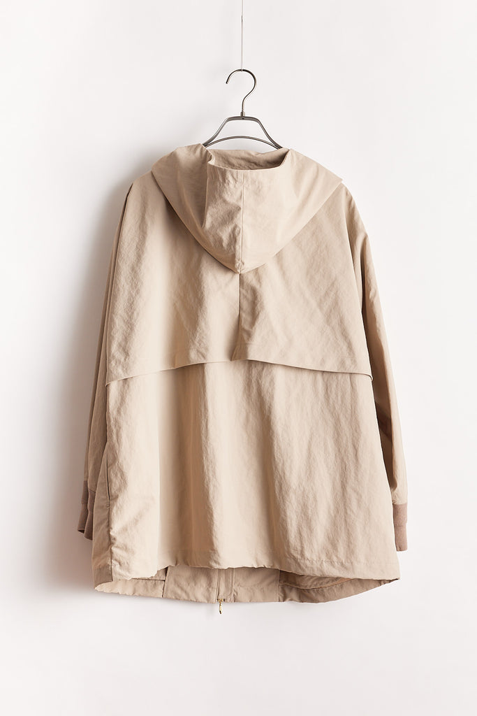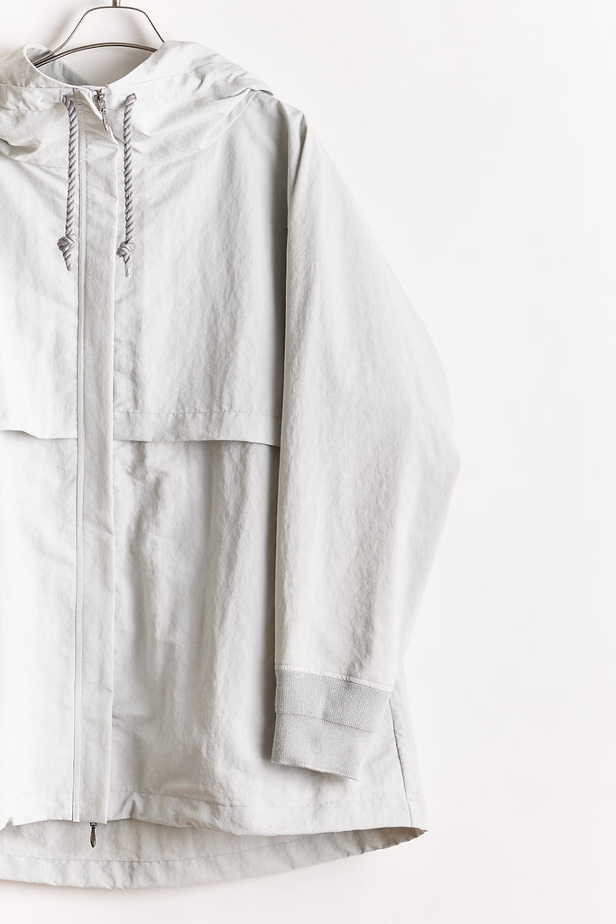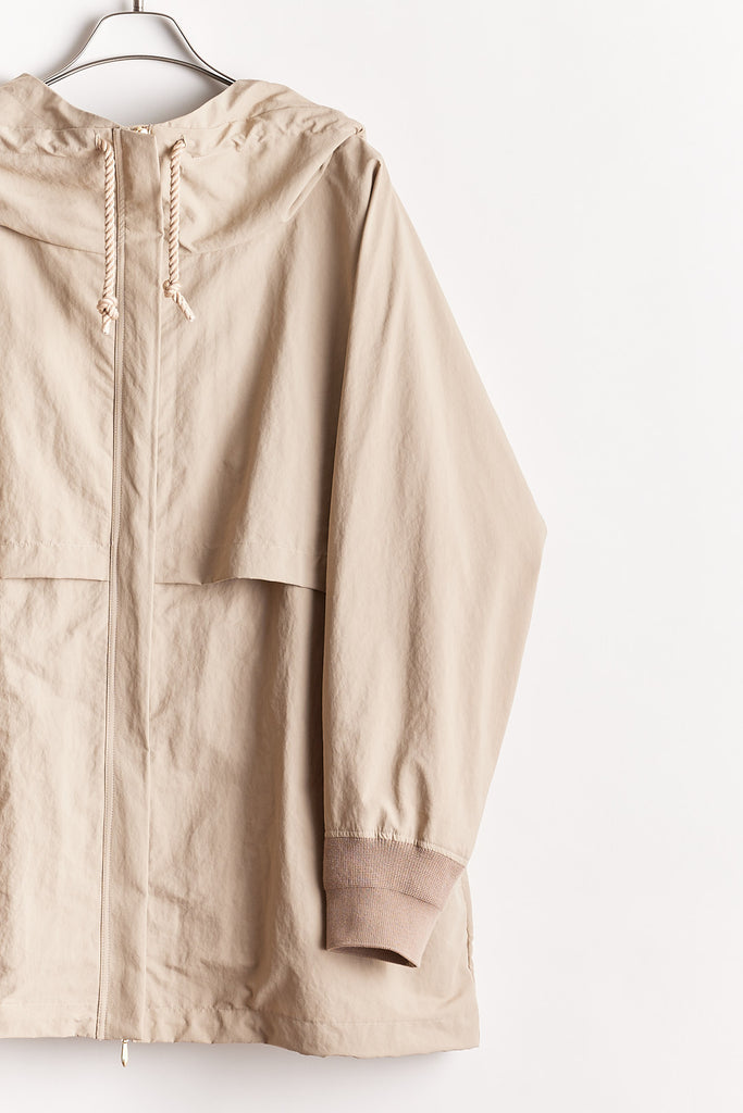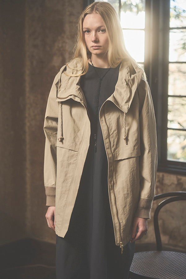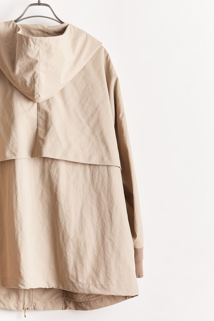 リサイクルナイロンを使用した、環境にやさしい撥水ブルゾン。軽量でコンパクトながらハリ感のある素材感で、フード付きのデザインで実用性とスタイルを兼ね備えた万能アウターです。デイリーに使いやすいタウンユースなライトアウターとして軽快にデニムやワイドパンツと合わせ、Tシャツの上にさらっと羽織るだけでサマになります。