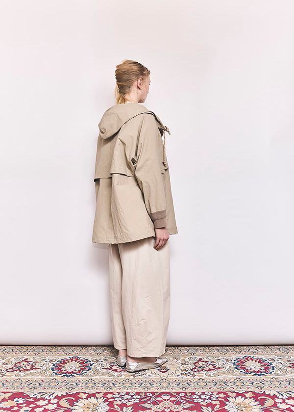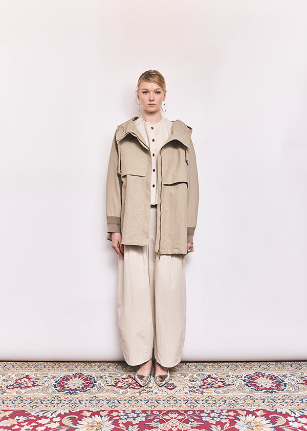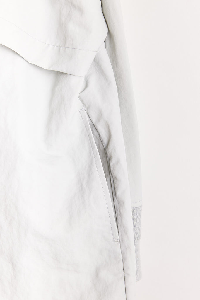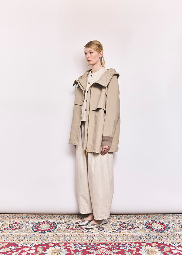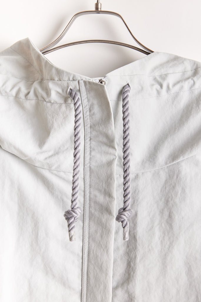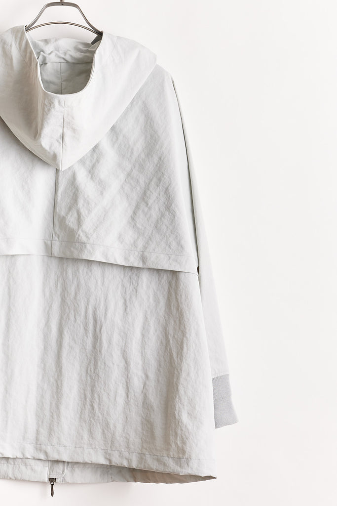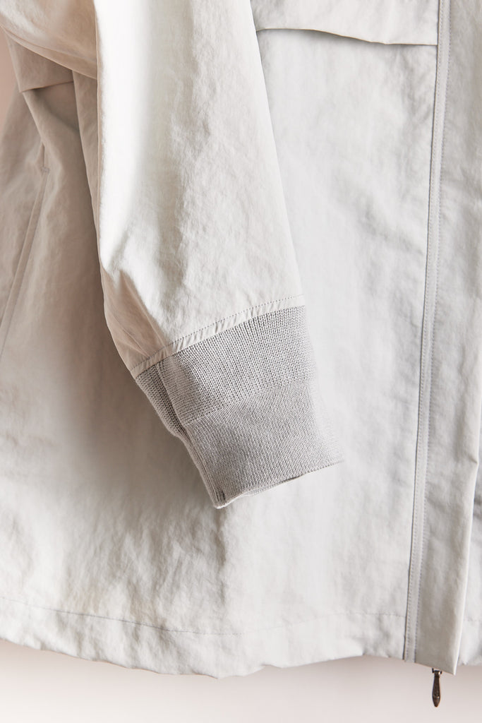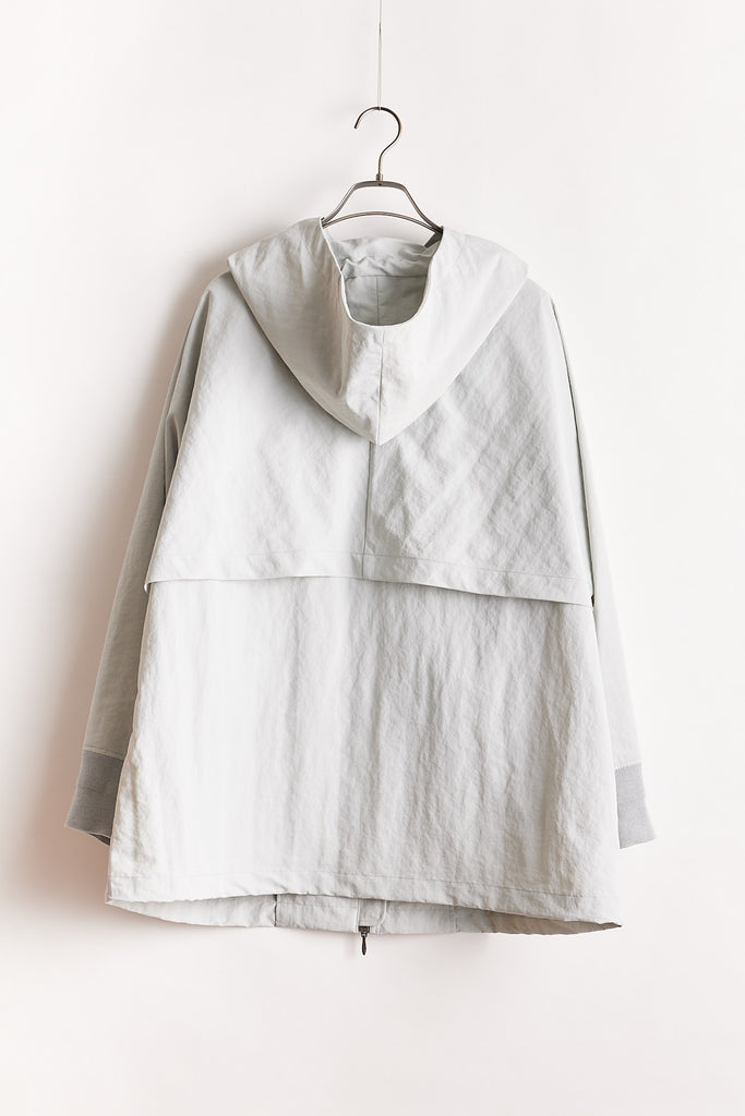 リサイクルナイロンを使用した、環境にやさしい撥水ブルゾン。軽量でコンパクトながらハリ感のある素材感で、フード付きのデザインで実用性とスタイルを兼ね備えた万能アウターです。デイリーに使いやすいタウンユースなライトアウターとして軽快にデニムやワイドパンツと合わせ、Tシャツの上にさらっと羽織るだけでサマになります。