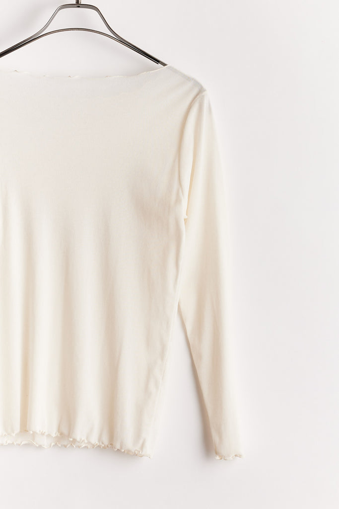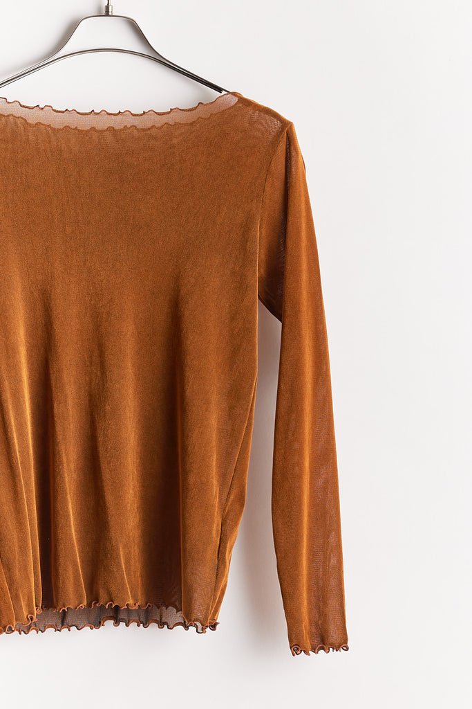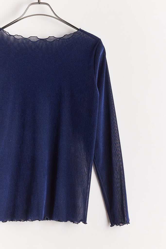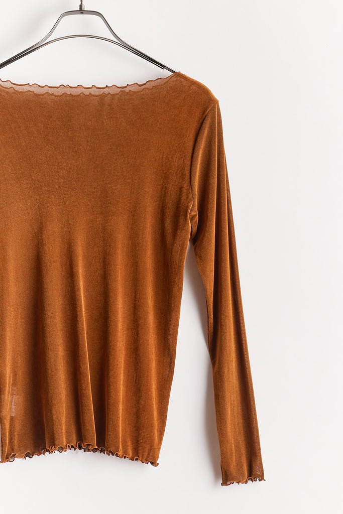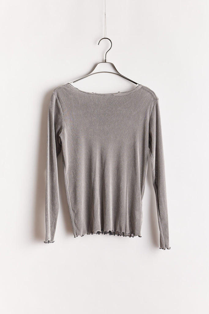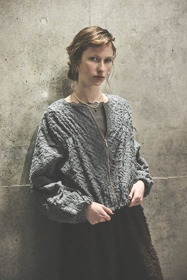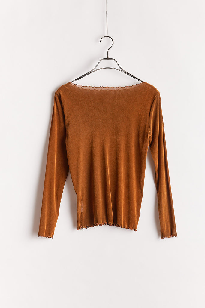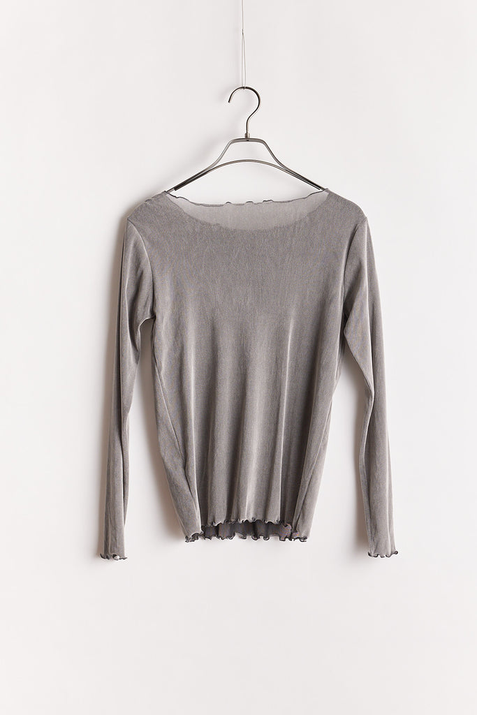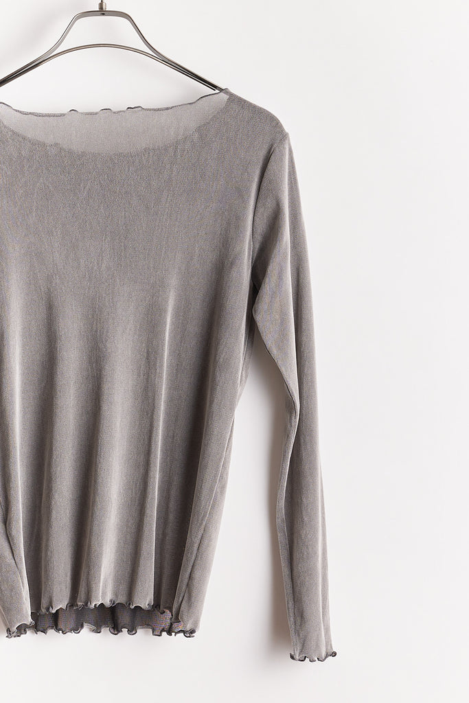 レイヤードスタイルやインナーとして着こなしにニュアンスをプラスしてくれるカットソー 。ナイロンのチュールに全面フロッキー加工をした少し特殊な素材でベロアのように重たくなく、やや透け感と、上品な毛並みと光沢がモダンな印象です。程よくコンパクトなサイズ感で、薄手で伸縮性もあるので着やすい一枚。シャツやジャケットのインナーとしても使いやすい着まわしアイテム。
