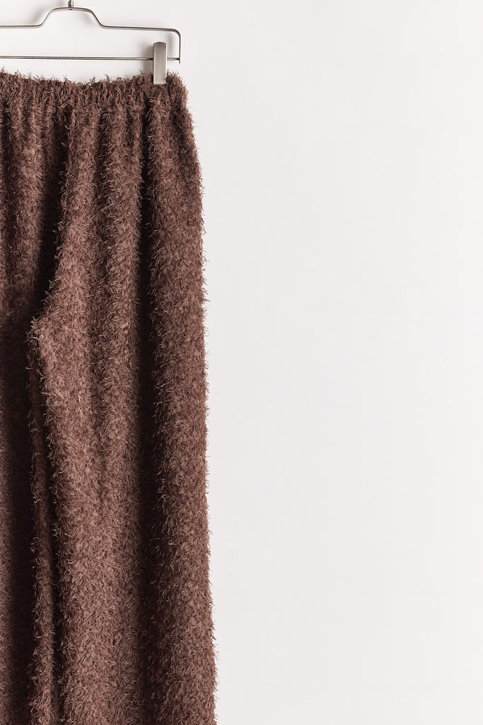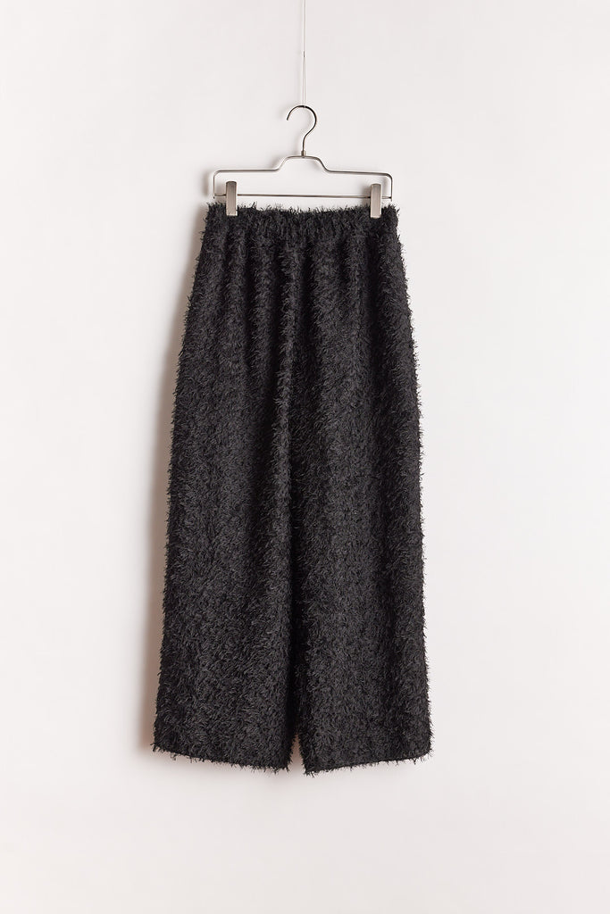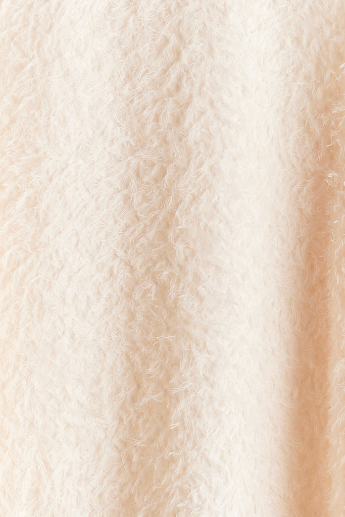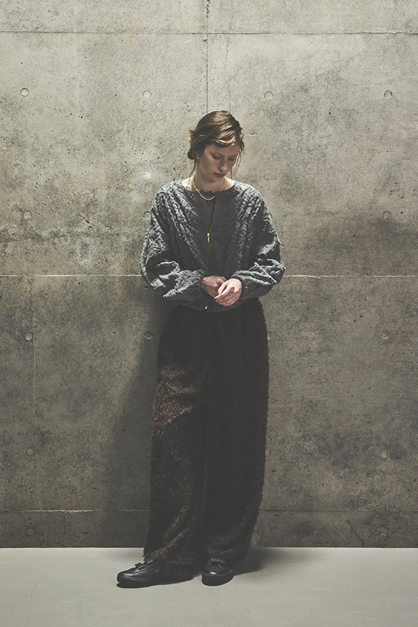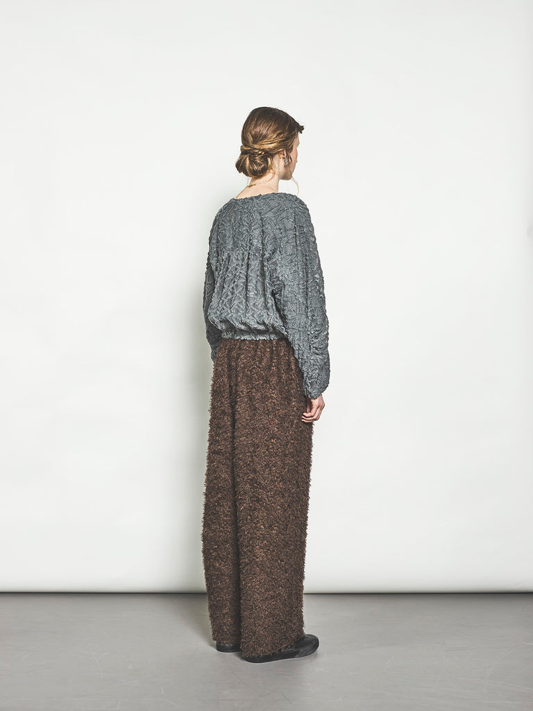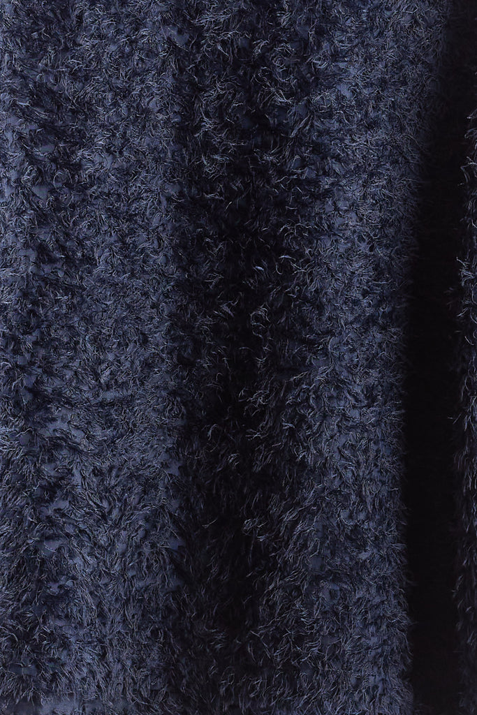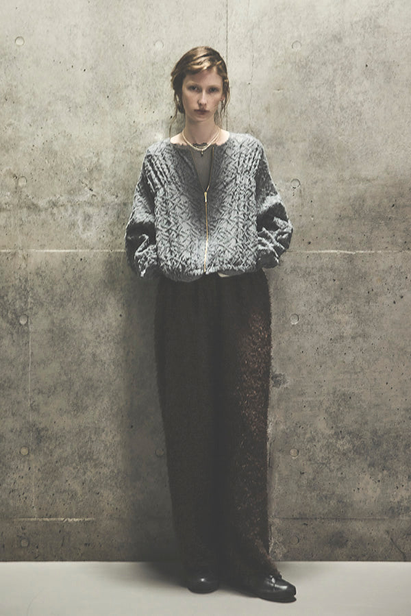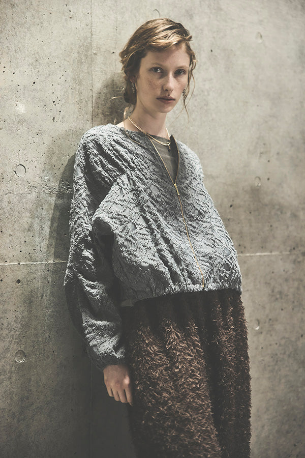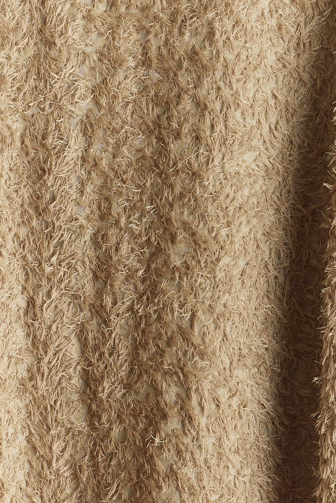 インパクトあるランダムな毛足のカットジャガード です。 涼しさを保ちながら秋らしい毛足感を楽しめ、かつ、華やかな雰囲気を演出してくれる万能素材。シアー感を残しつつ物性をキープできるようベースの密度とフリンジの長さにこだわりました。
