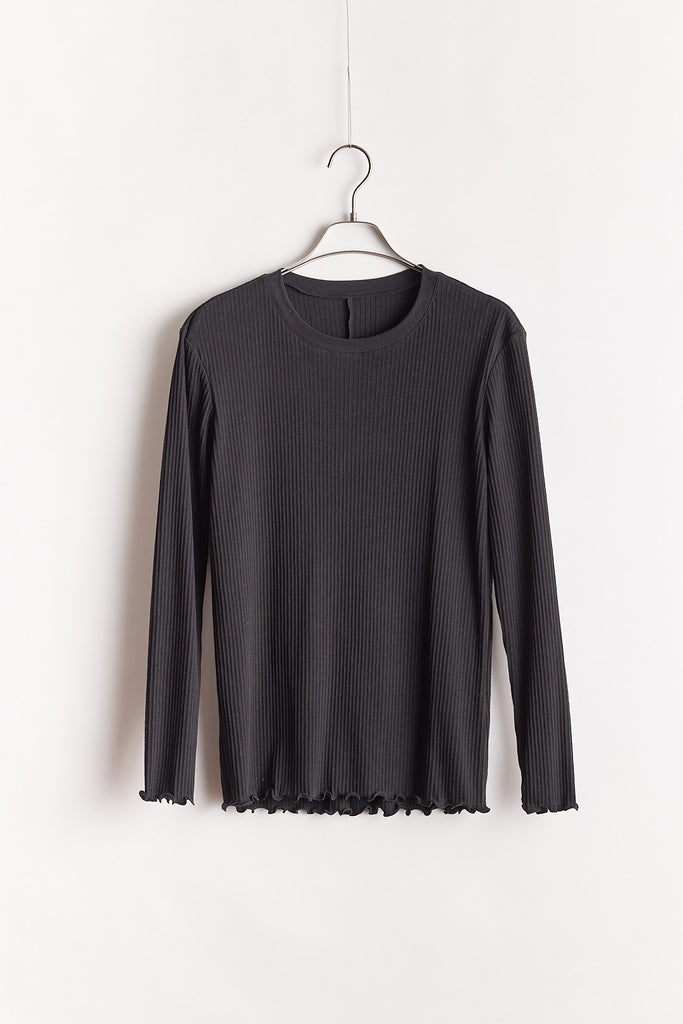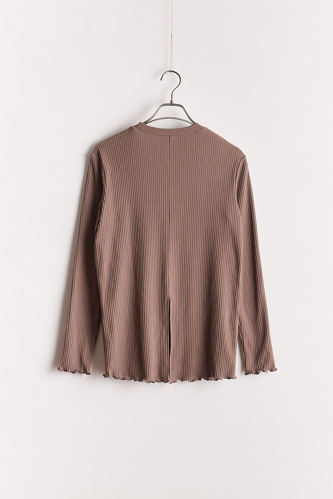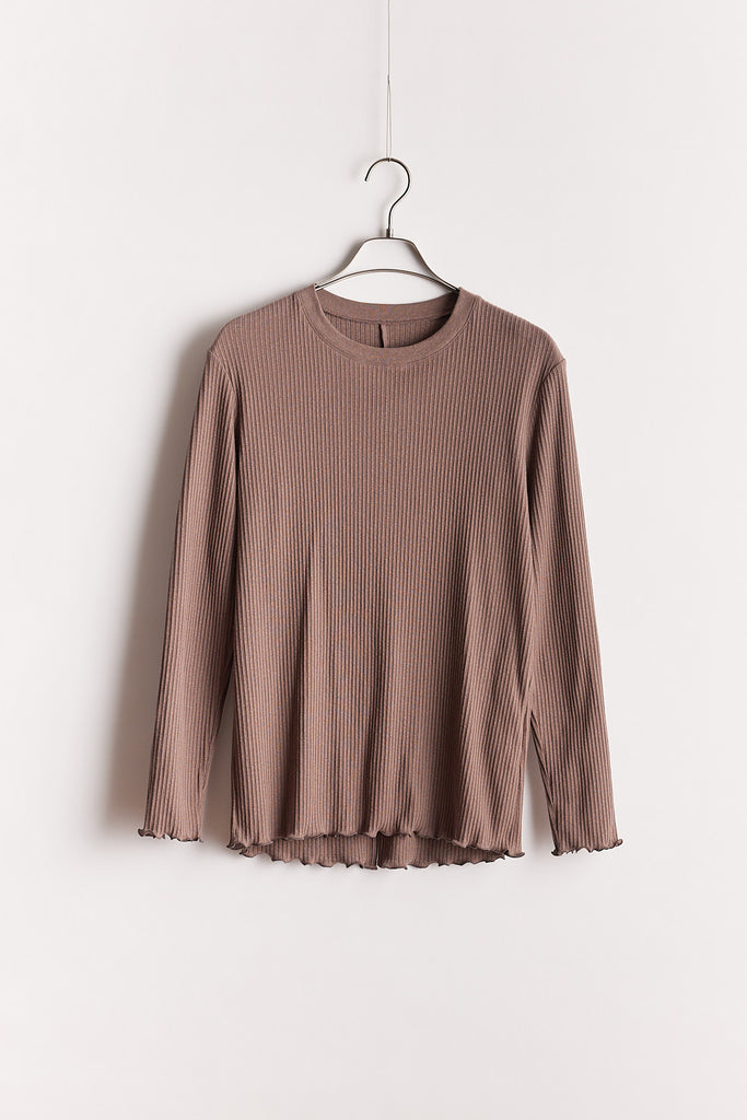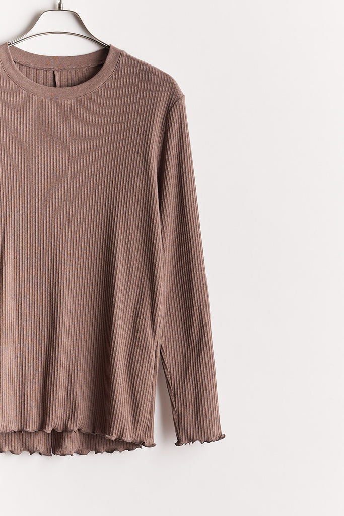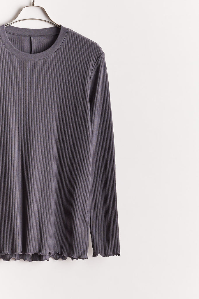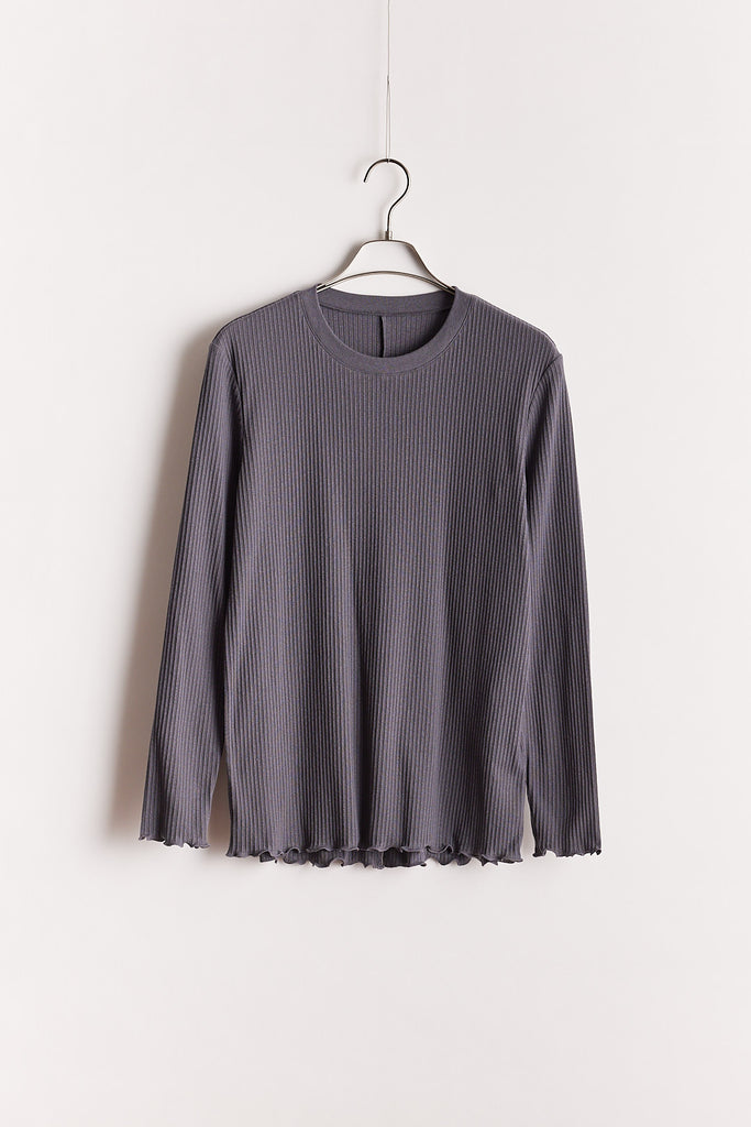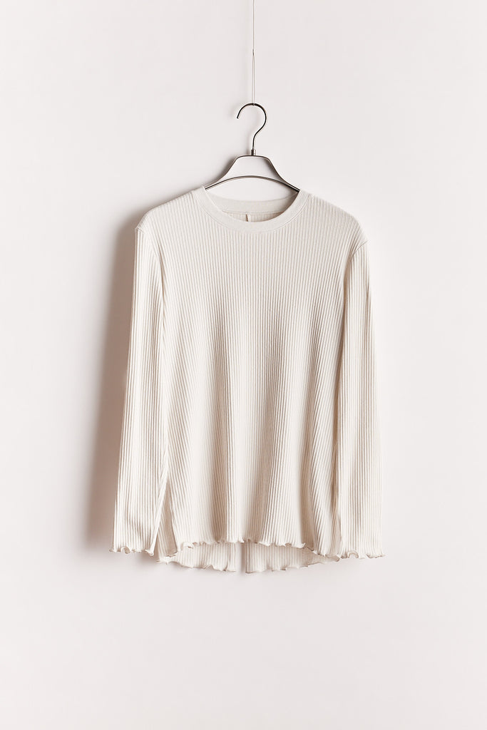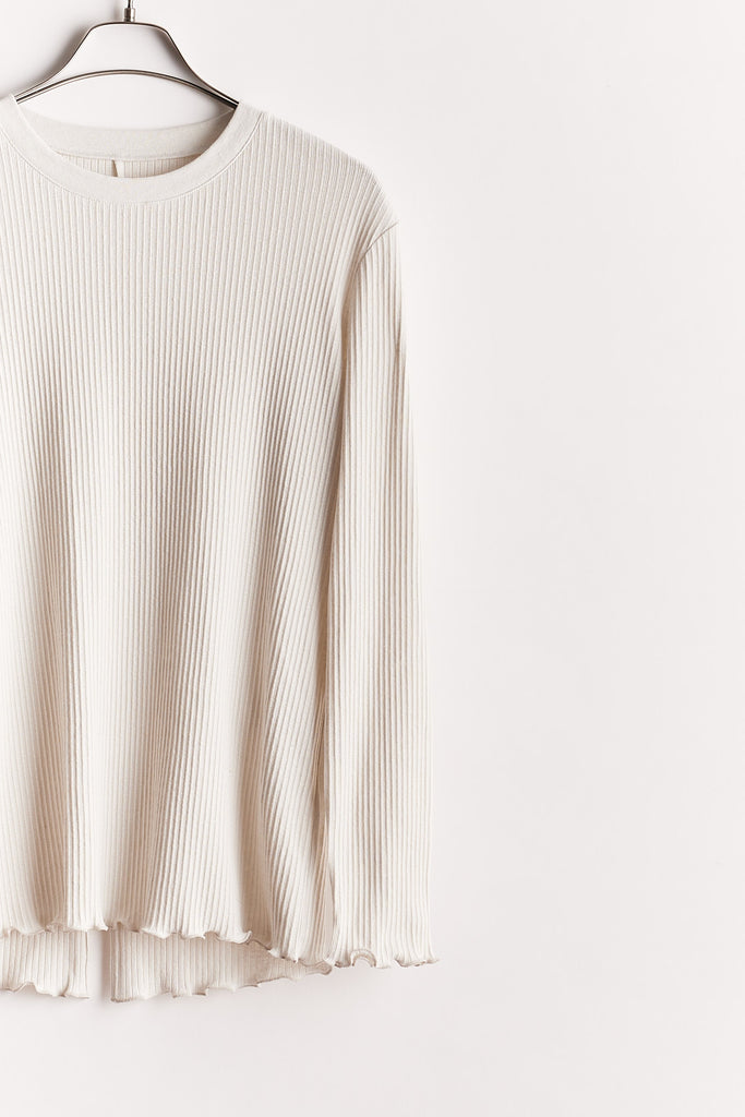トレンド感溢れるナチュラルな透け感が特徴。スラブ糸を使用しムラ感を出しランダムに変形させたヴィンテージライクなリブです。