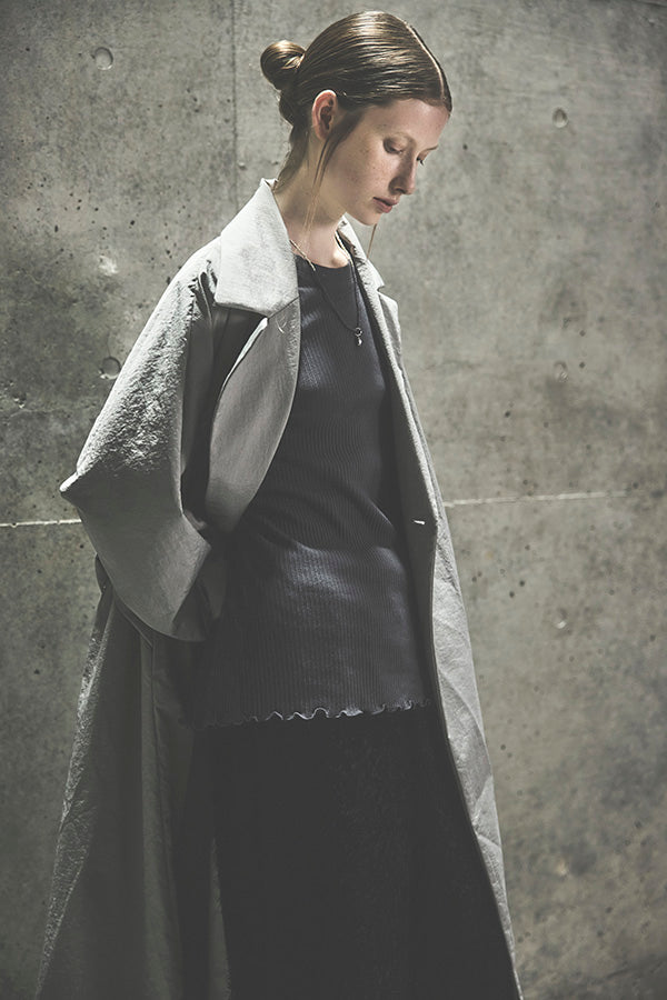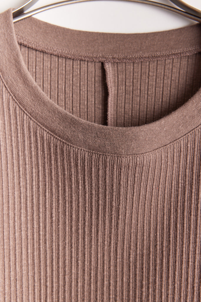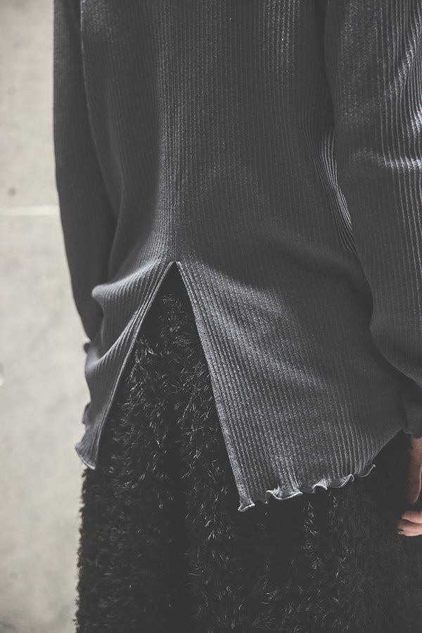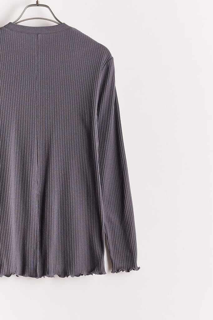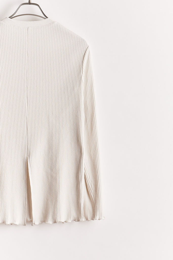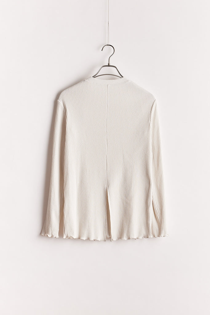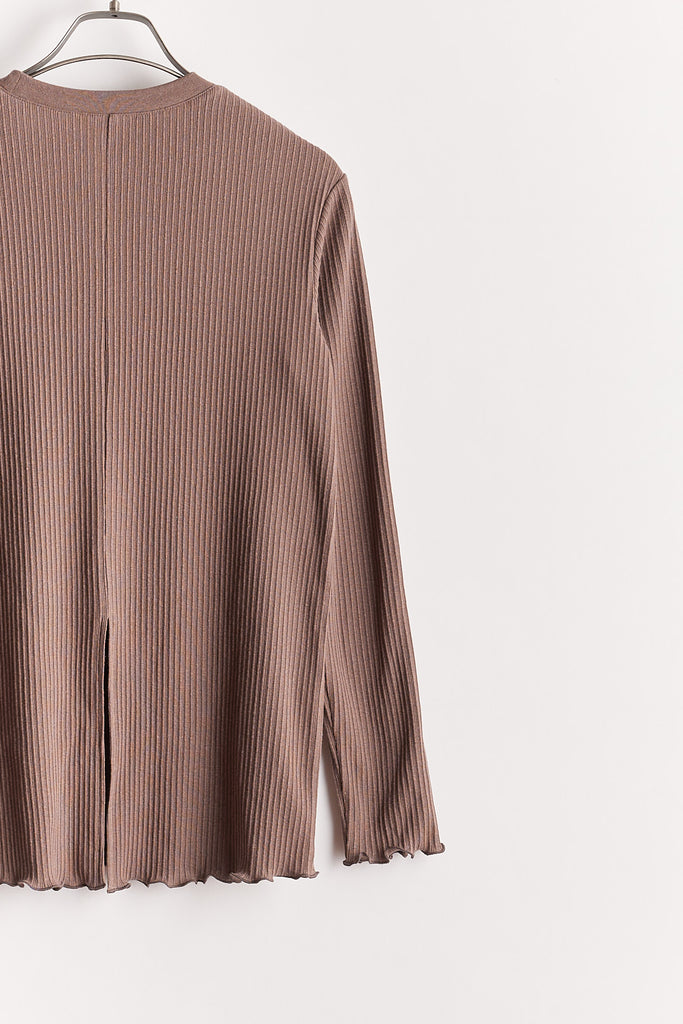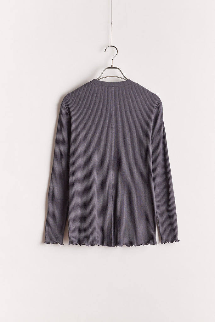 トレンド感溢れるナチュラルな透け感が特徴。スラブ糸を使用しムラ感を出しランダムに変形させたヴィンテージライクなリブです。