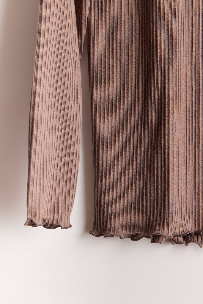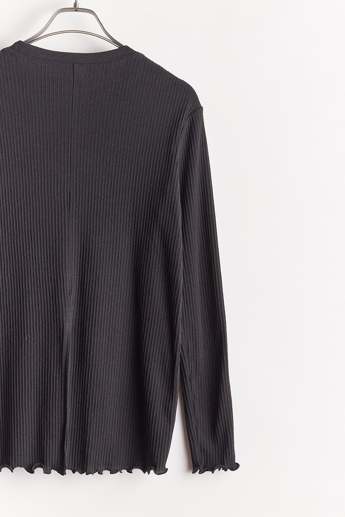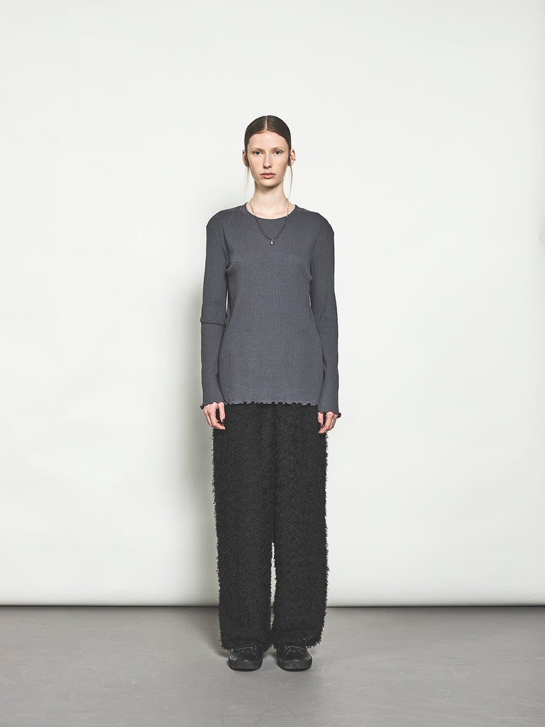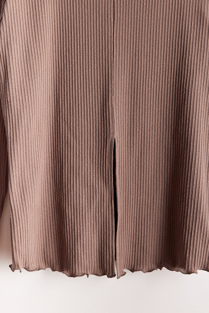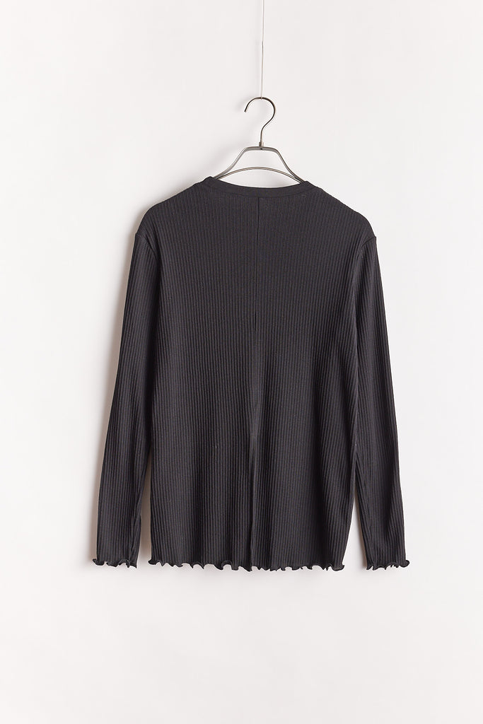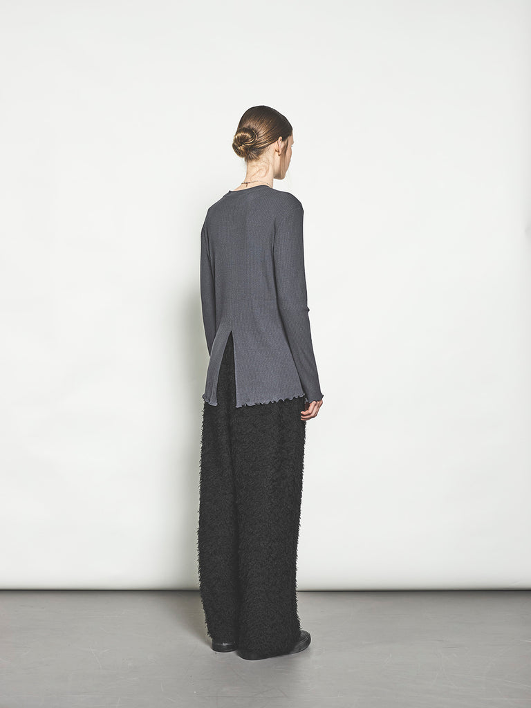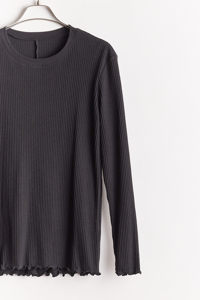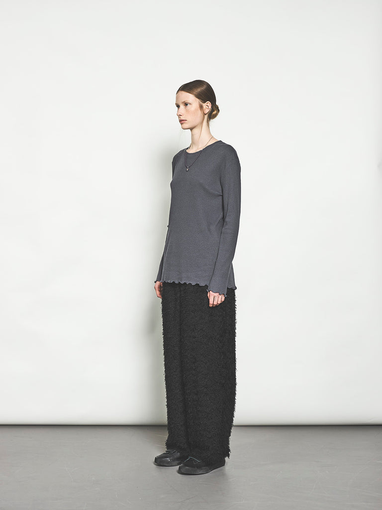 トレンド感溢れるナチュラルな透け感が特徴。スラブ糸を使用しムラ感を出しランダムに変形させたヴィンテージライクなリブです。
