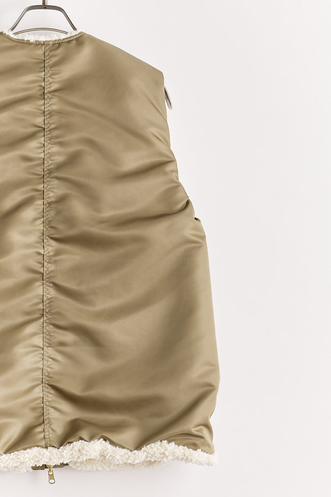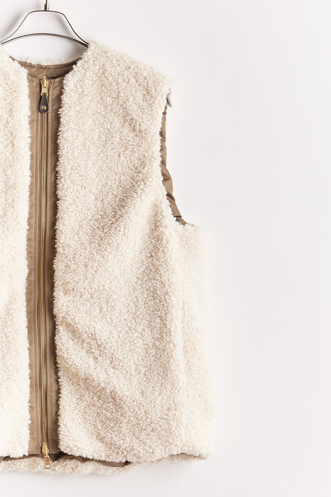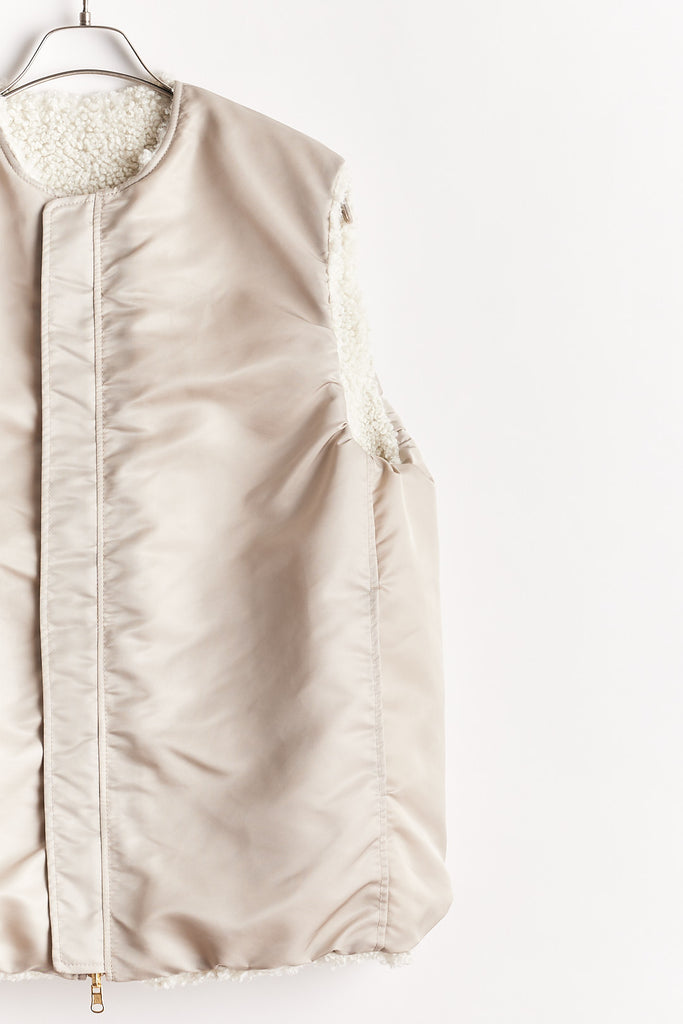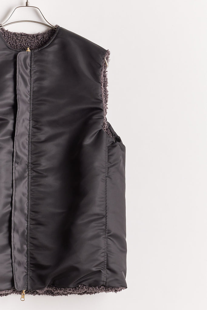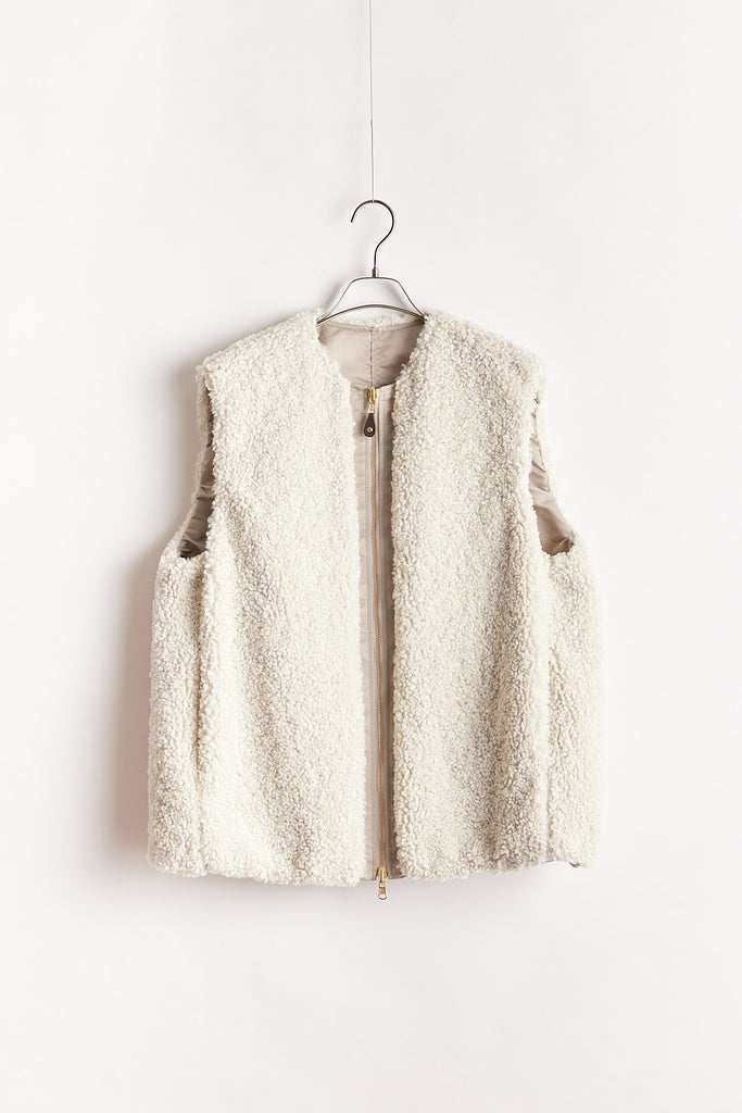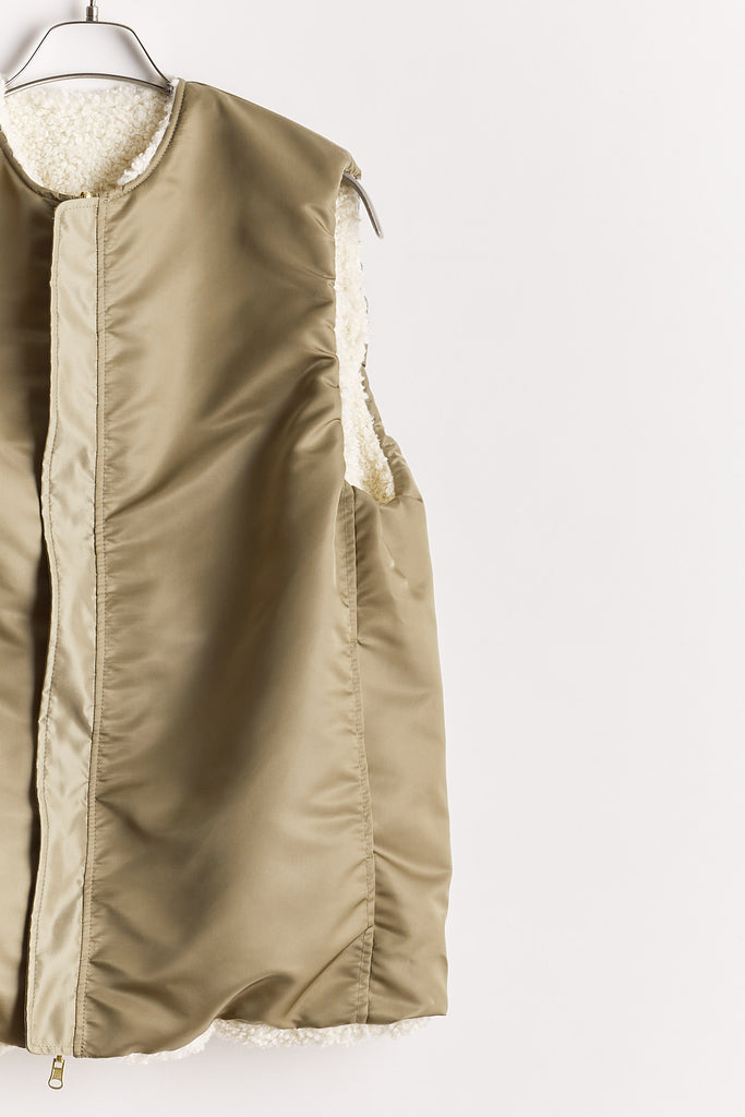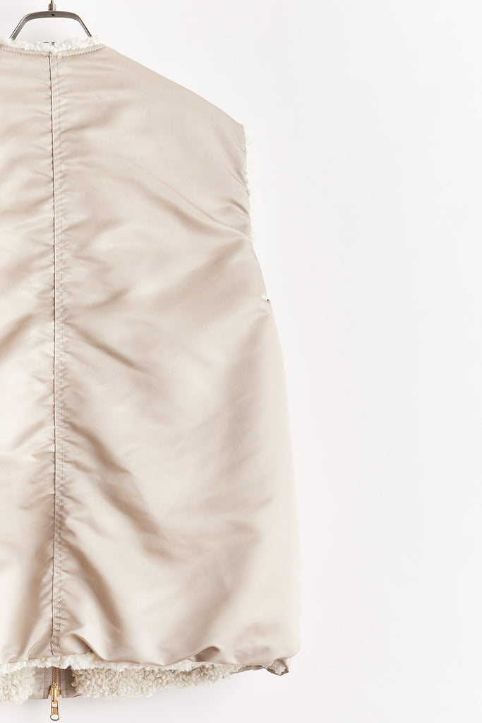 ほんのりと光沢感がある上質なフェイクファーとベーシックな無地が楽しめるリバーシブル仕様のベスト。 ファスナーを開けるとMA-1風の持ち出しが覗くデザインポイントになっています。 表裏で雰囲気が異なる為リバーシブルでの着こなしをより楽しんでいただける1枚になっています。アームホールを深く下げ、アウターの上からもを羽織っていただきやすいサイズ感です。 カジュアルにもシックな着こなしも演出できるロングベストです。大人のカジュアルスタイルに溶け込む日常気にもぴったりな一着に仕上げました。モード感漂うレザーライクなプリーツ スカートを合わせて軽やかなコーディネイトがおすすめ。。