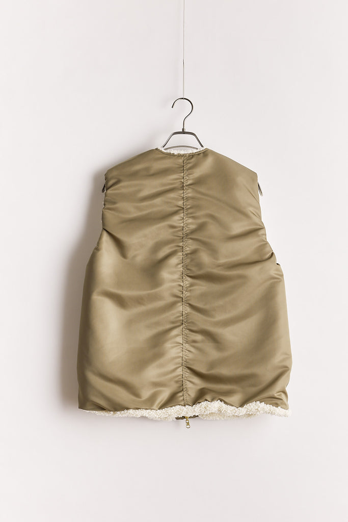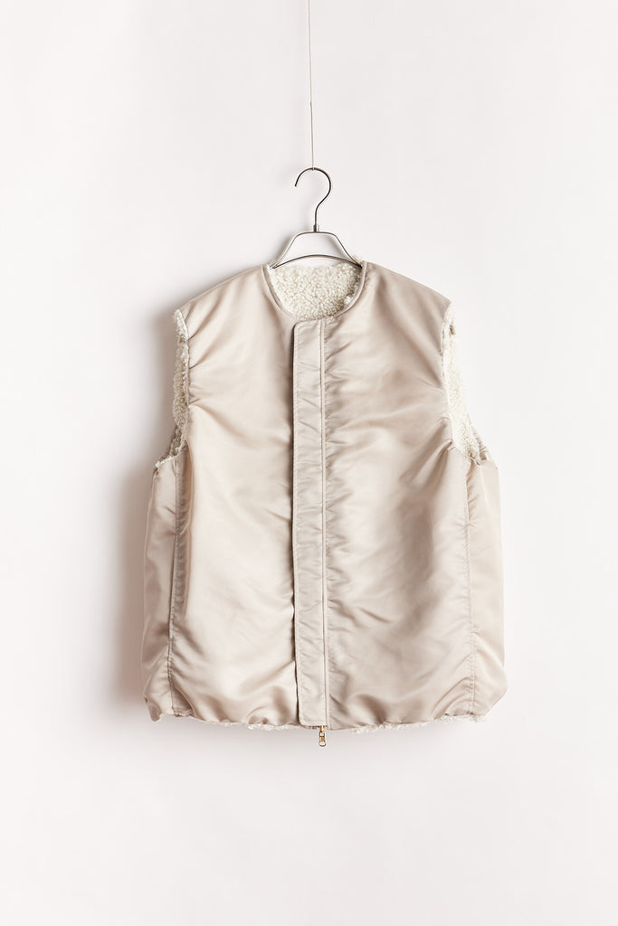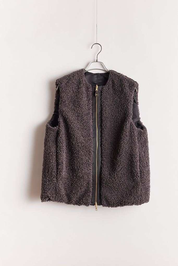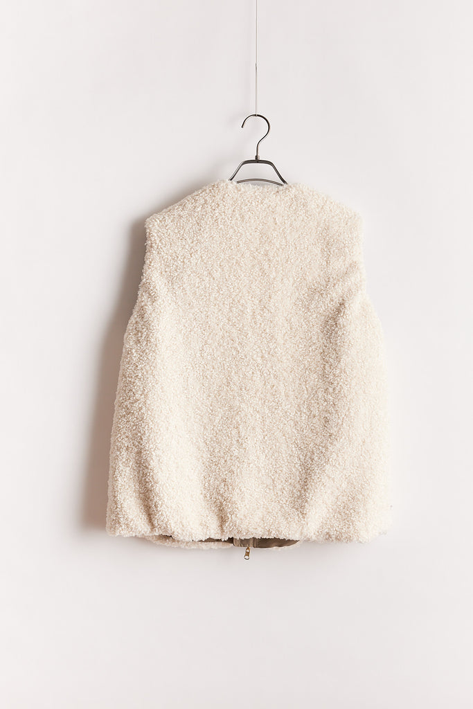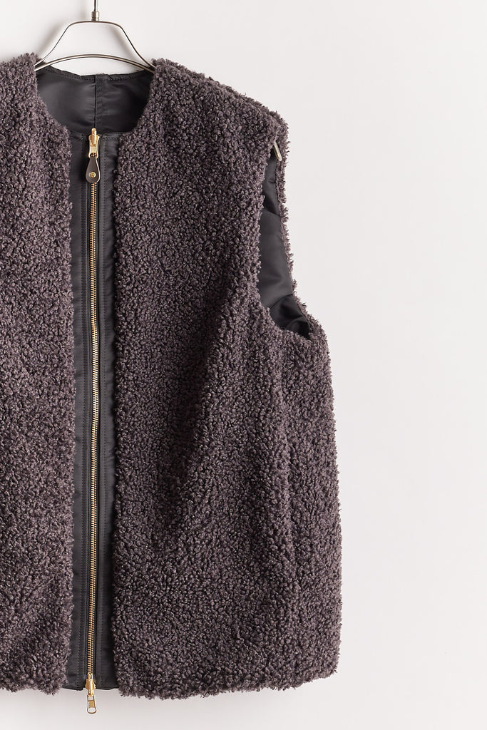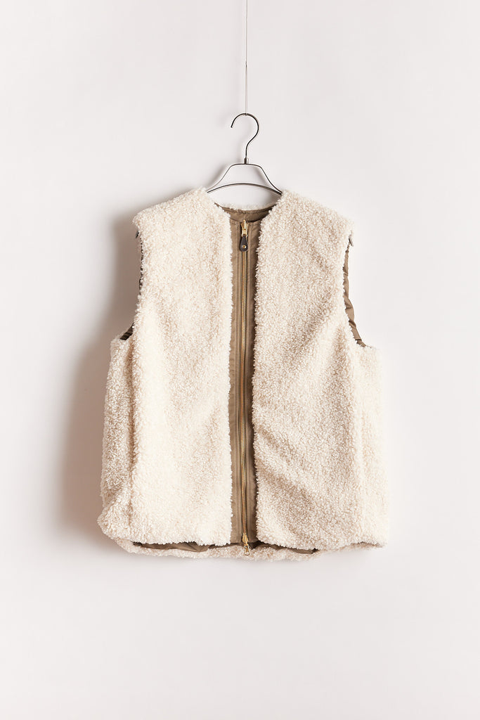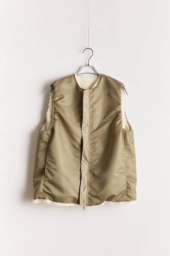 ほんのりと光沢感がある上質なフェイクファーとベーシックな無地が楽しめるリバーシブル仕様のベスト。 ファスナーを開けるとMA-1風の持ち出しが覗くデザインポイントになっています。 表裏で雰囲気が異なる為リバーシブルでの着こなしをより楽しんでいただける1枚になっています。アームホールを深く下げ、アウターの上からもを羽織っていただきやすいサイズ感です。 カジュアルにもシックな着こなしも演出できるロングベストです。大人のカジュアルスタイルに溶け込む日常気にもぴったりな一着に仕上げました。モード感漂うレザーライクなプリーツ スカートを合わせて軽やかなコーディネイトがおすすめ。。