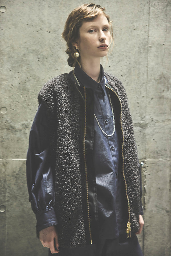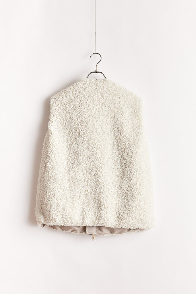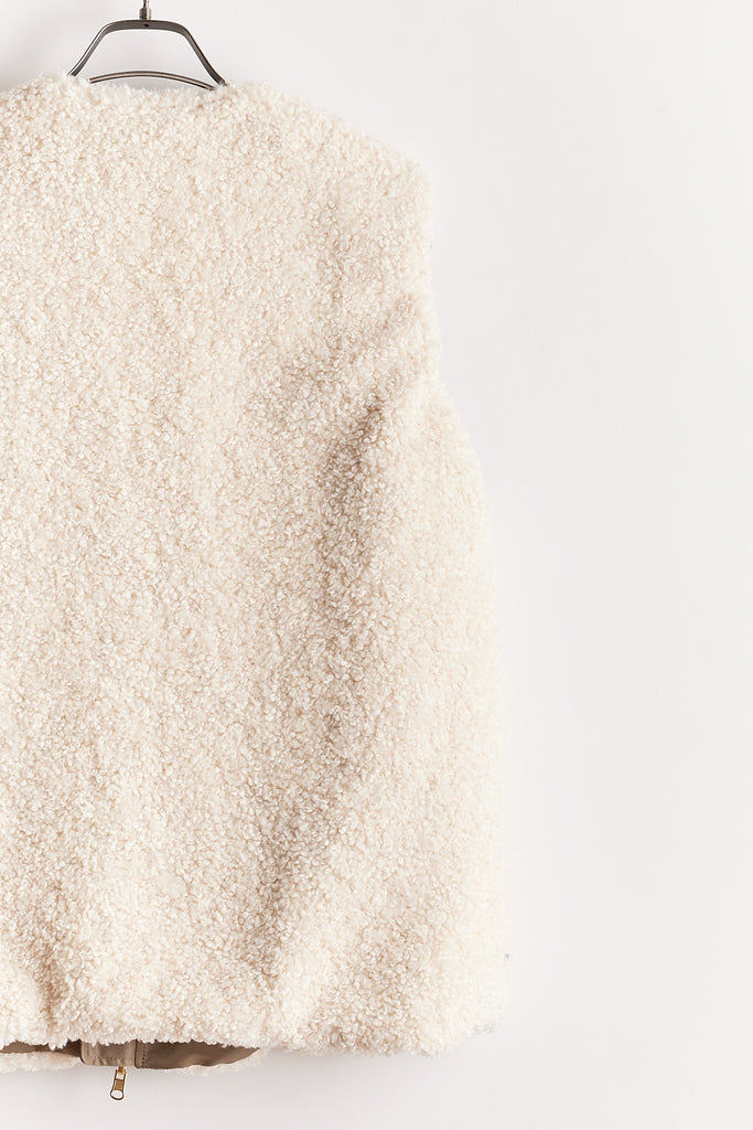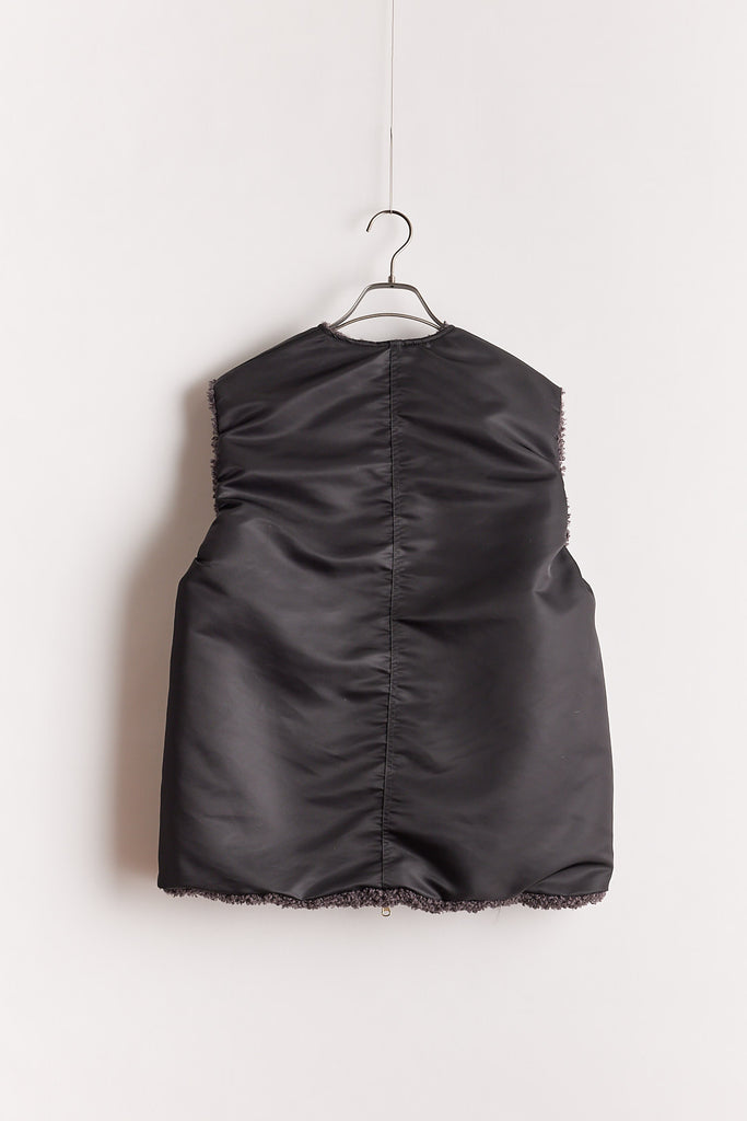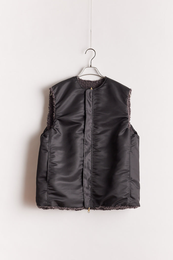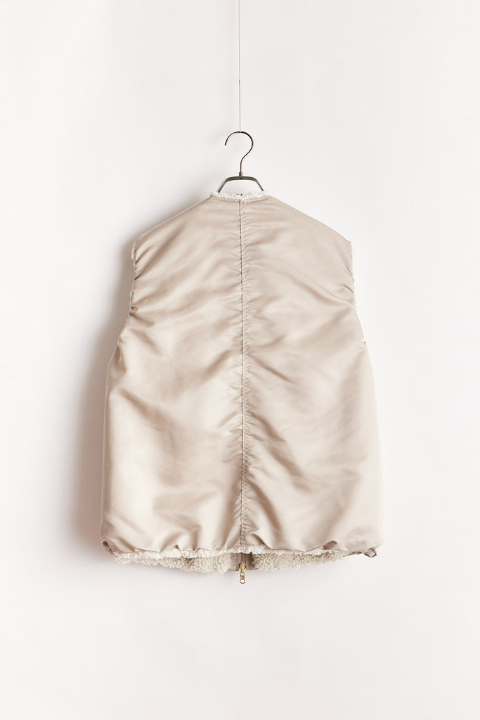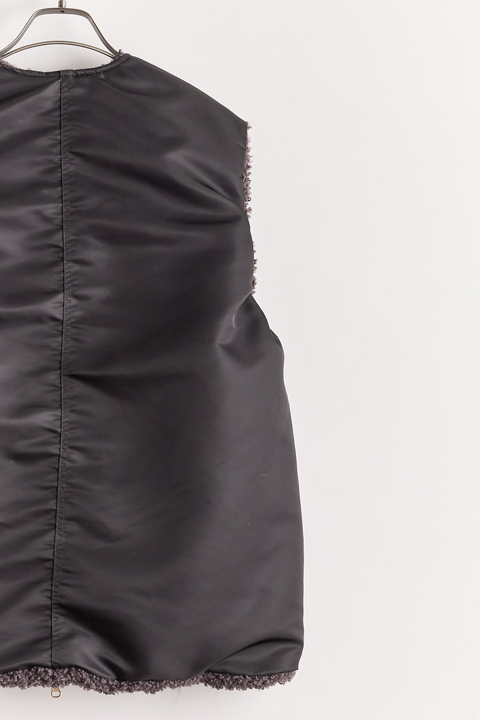 ほんのりと光沢感がある上質なフェイクファーとベーシックな無地が楽しめるリバーシブル仕様のベスト。 ファスナーを開けるとMA-1風の持ち出しが覗くデザインポイントになっています。 表裏で雰囲気が異なる為リバーシブルでの着こなしをより楽しんでいただける1枚になっています。アームホールを深く下げ、アウターの上からもを羽織っていただきやすいサイズ感です。 カジュアルにもシックな着こなしも演出できるロングベストです。大人のカジュアルスタイルに溶け込む日常気にもぴったりな一着に仕上げました。モード感漂うレザーライクなプリーツ スカートを合わせて軽やかなコーディネイトがおすすめ。。