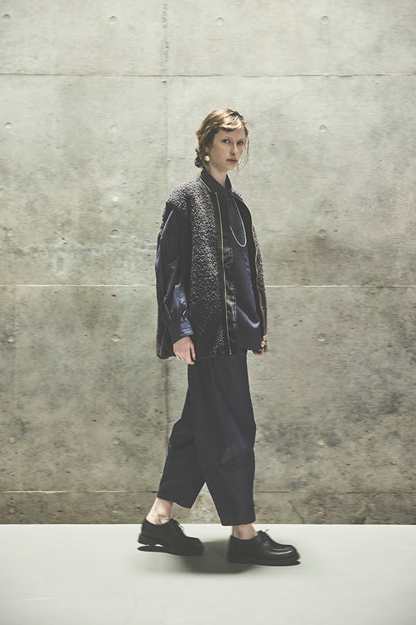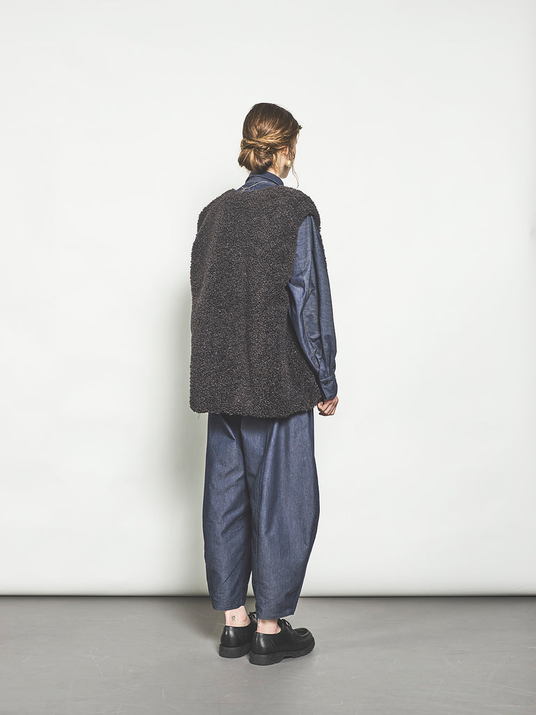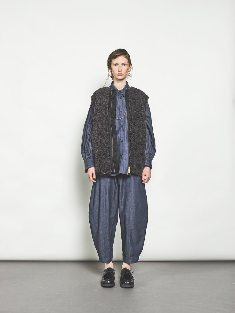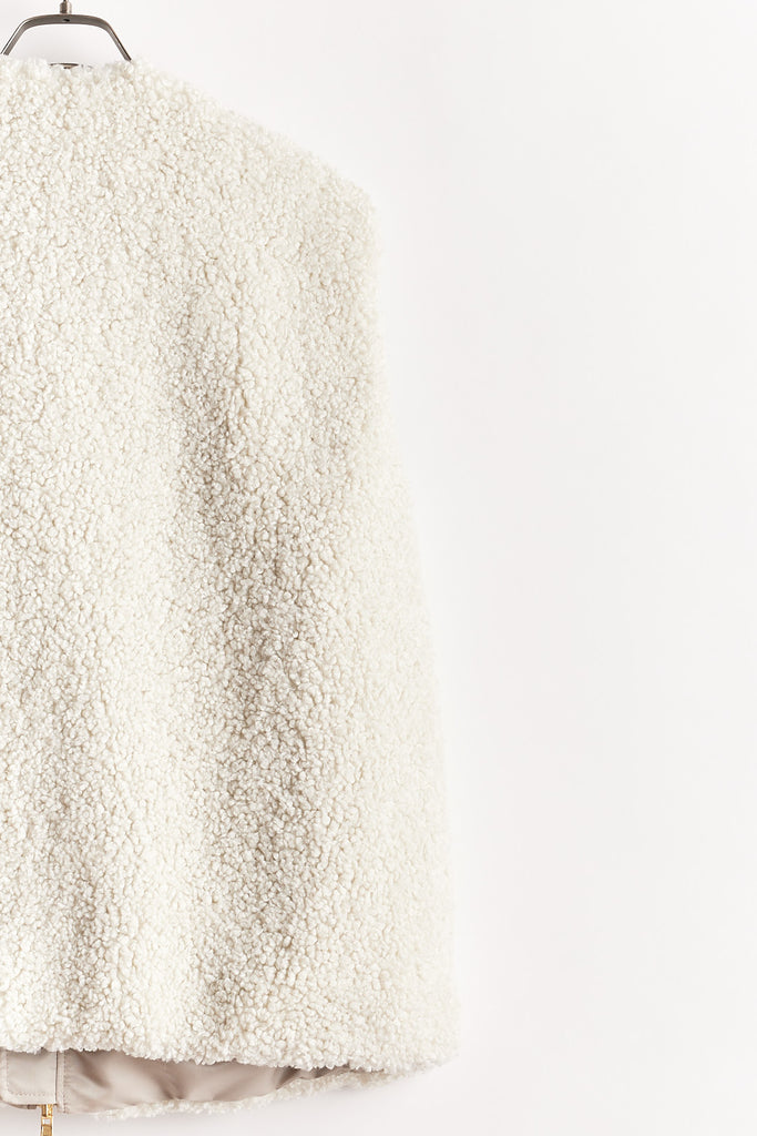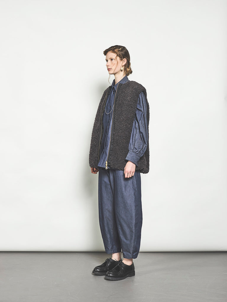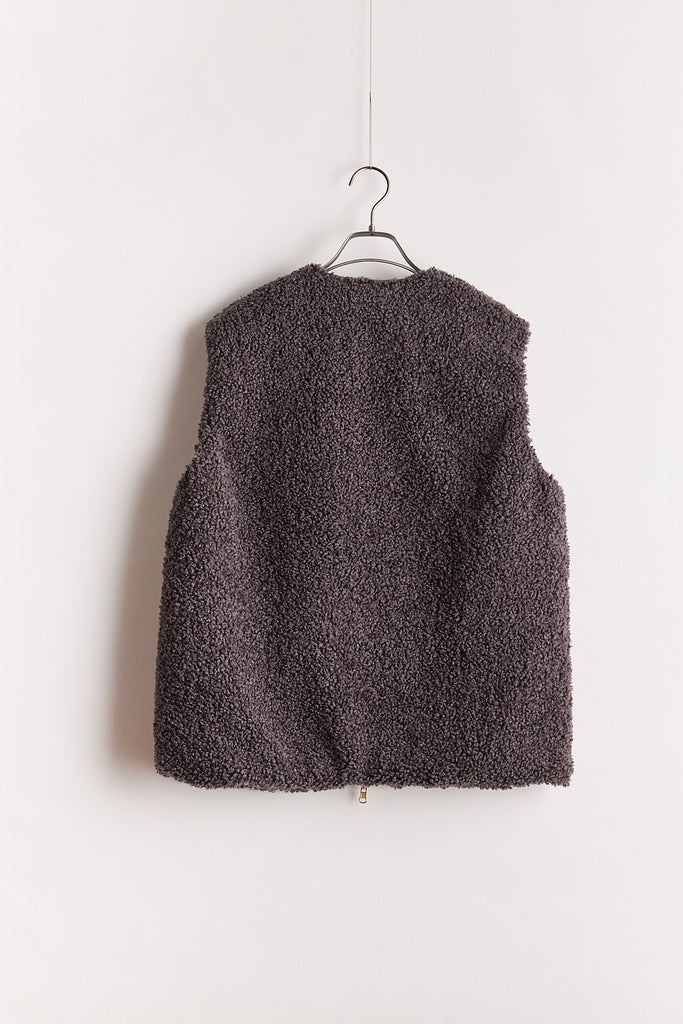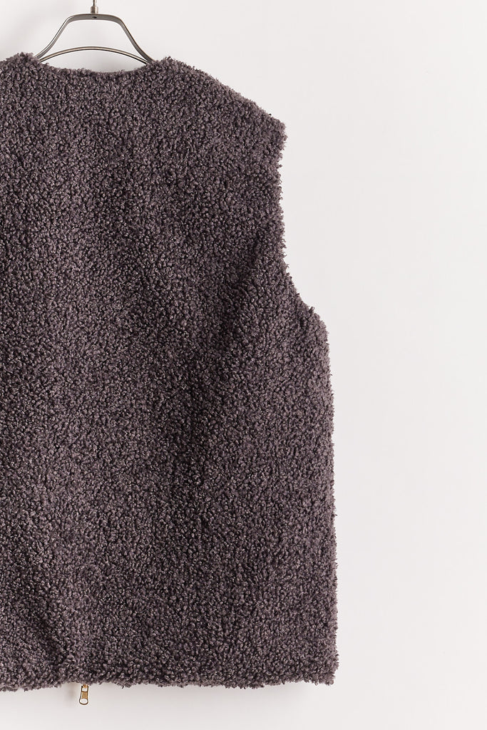 ほんのりと光沢感がある上質なフェイクファーとベーシックな無地が楽しめるリバーシブル仕様のベスト。 ファスナーを開けるとMA-1風の持ち出しが覗くデザインポイントになっています。 表裏で雰囲気が異なる為リバーシブルでの着こなしをより楽しんでいただける1枚になっています。アームホールを深く下げ、アウターの上からもを羽織っていただきやすいサイズ感です。 カジュアルにもシックな着こなしも演出できるロングベストです。大人のカジュアルスタイルに溶け込む日常気にもぴったりな一着に仕上げました。モード感漂うレザーライクなプリーツ スカートを合わせて軽やかなコーディネイトがおすすめ。。