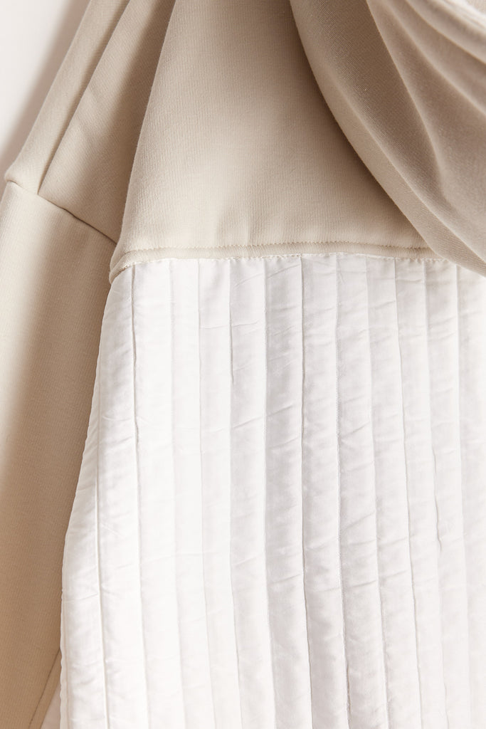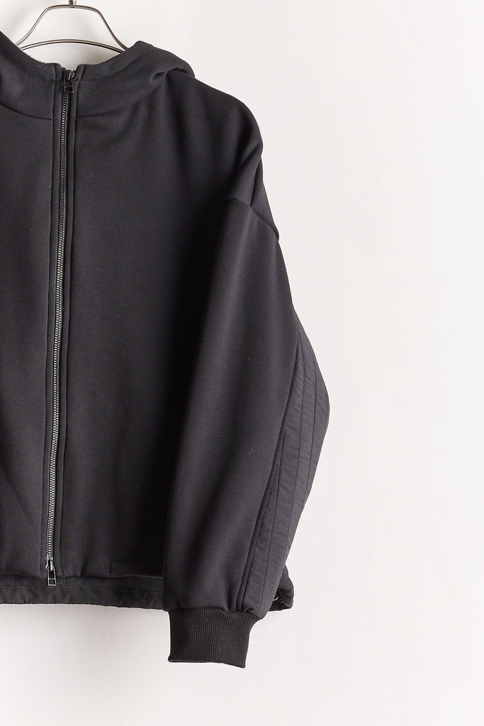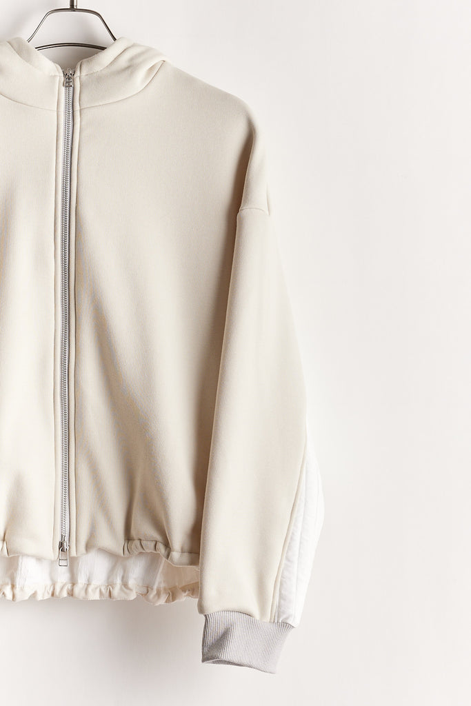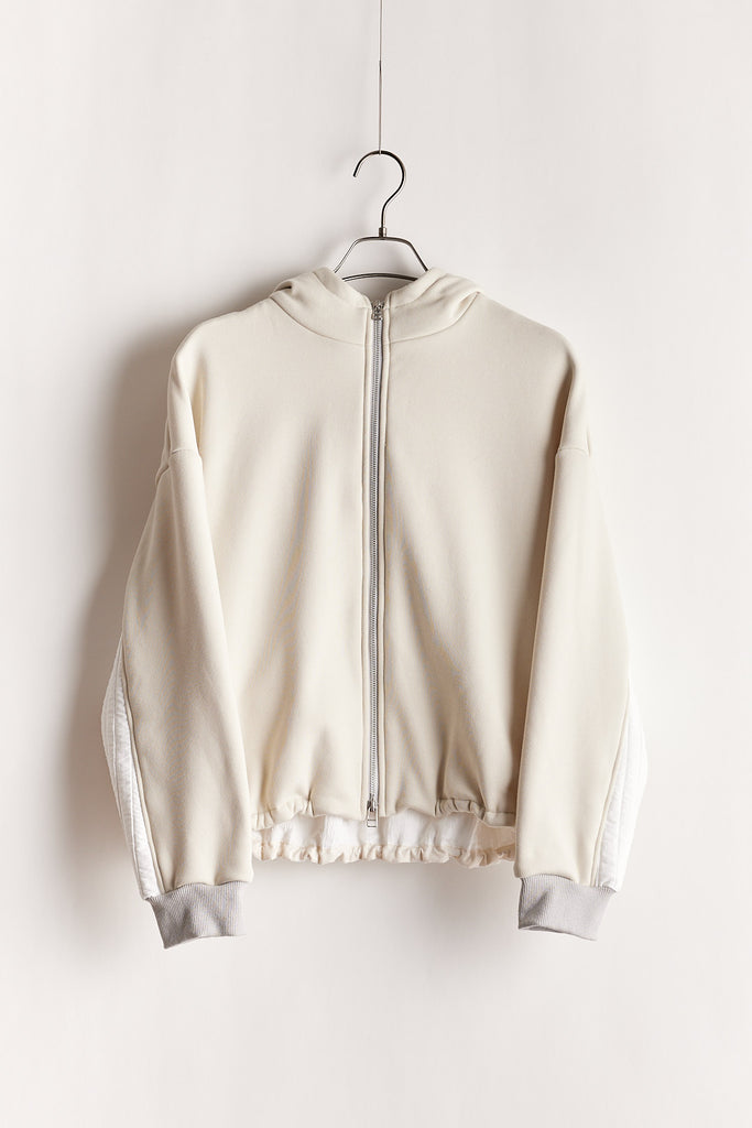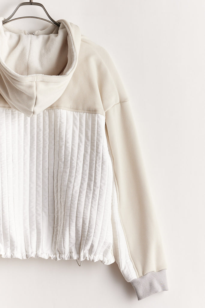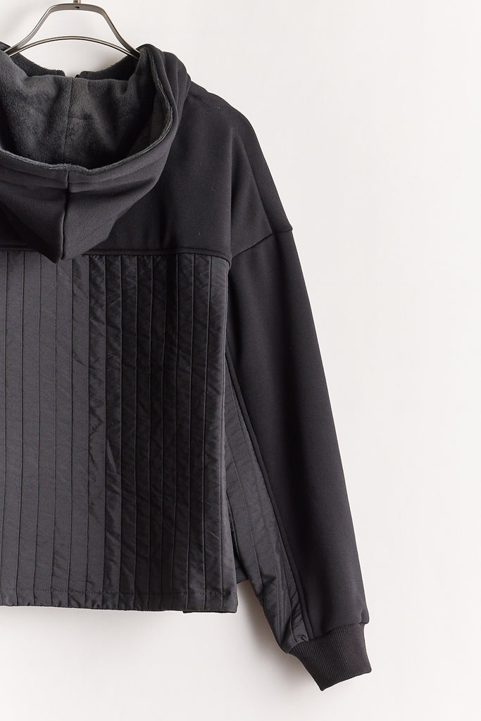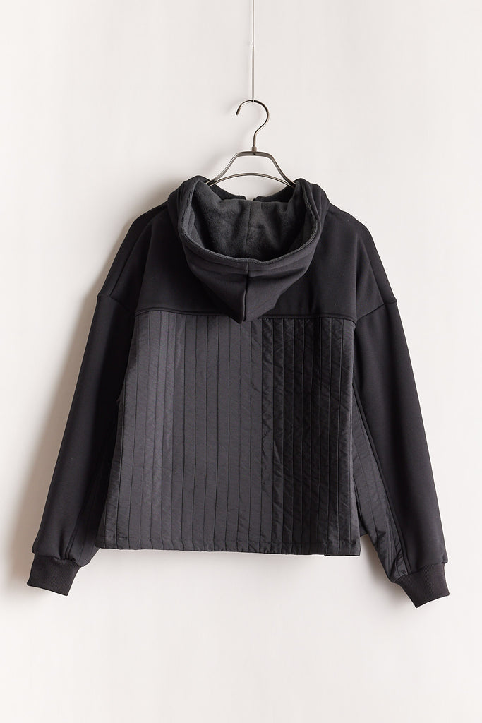 とにかく気持ちいい着心地の裏毛×後ろ身頃にキルティングを用いたコンビパーカー。スタンダードなパーカーのデザインに異素材を組み合わせることで、デザイン性のある商品になりました。シンプルなワンピースの上にバッと羽織ったり、カジュアルすぎないコーディネートのアクセントにして欲しい大人のためのリラックスパーカー。ややオーバーサイズで肩の力が抜けたリラックス感、裾はストッパーでシルエットがつくれます。袖口のリブ仕様でシックリいくデザインに。。