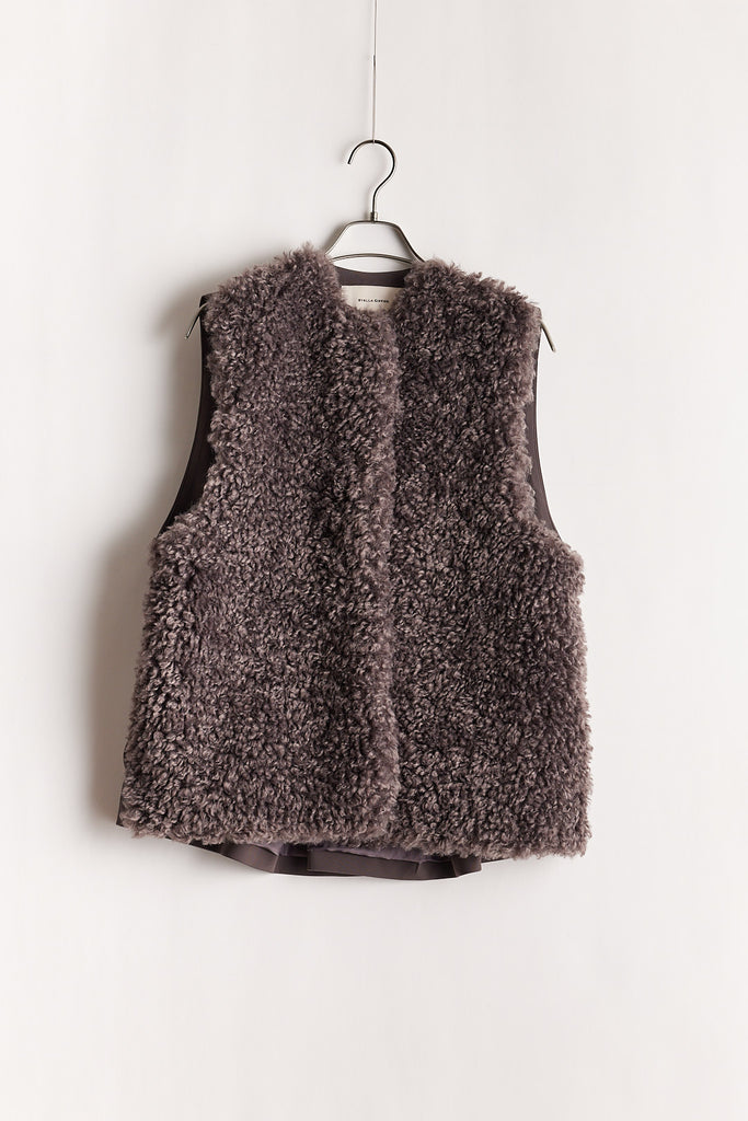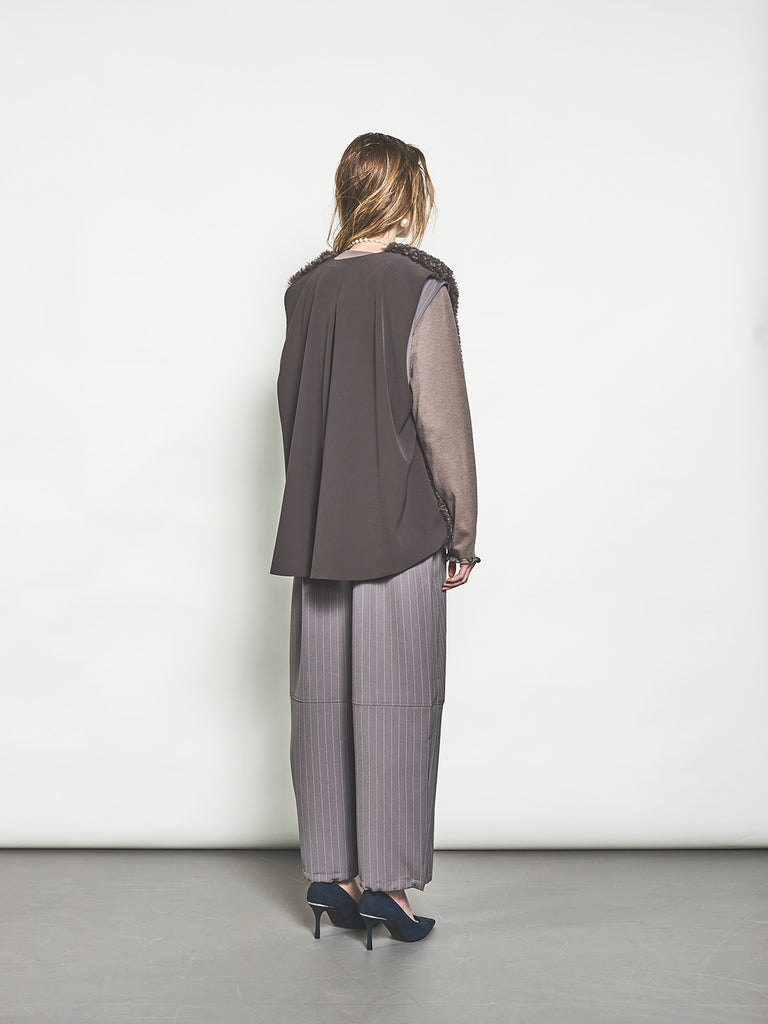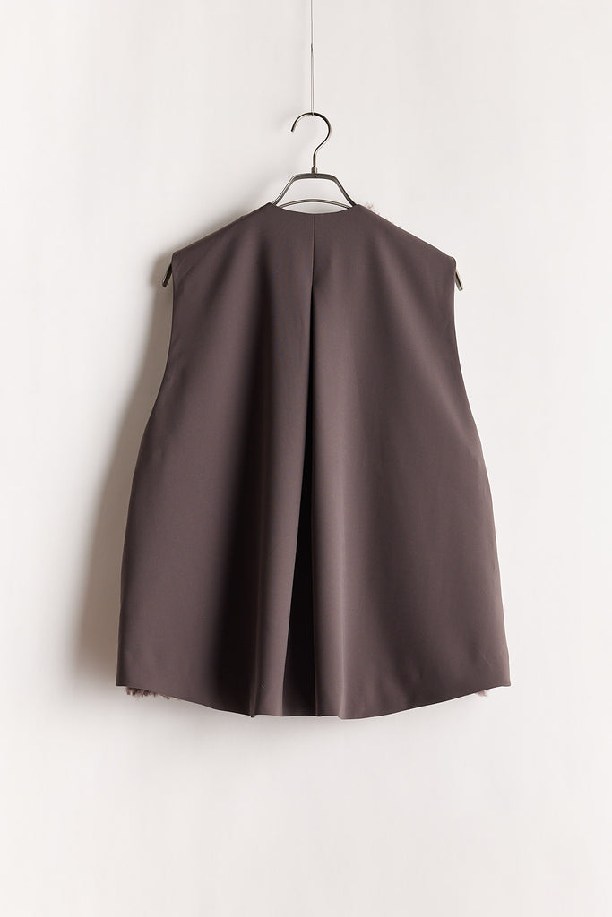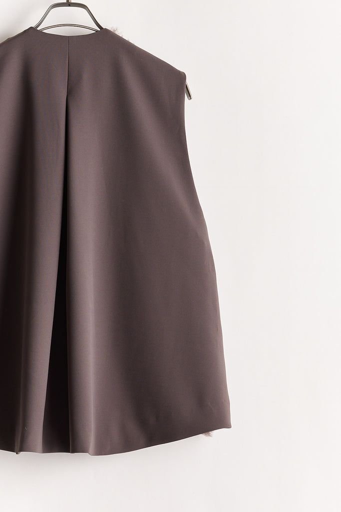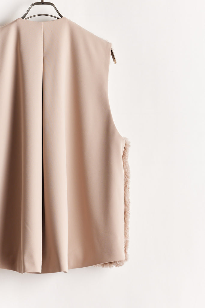 前身頃にフェイクファー×後ろ身頃にストレチの効いたTwillを使用したコンビベスト。すぐに季節感をプラスしてくれる主役級ベスト。ヒップも隠れる丈でややAラインのシルエット。インナーを選ばずにレーヤードしやすい型に仕上げました。裏地もついているのでニットやシャツの上にも滑りがよく着用可能。 コートのインにも着用できるので着用機会も多い一枚。後見頃に大きめのタックが入ったデザイン。。