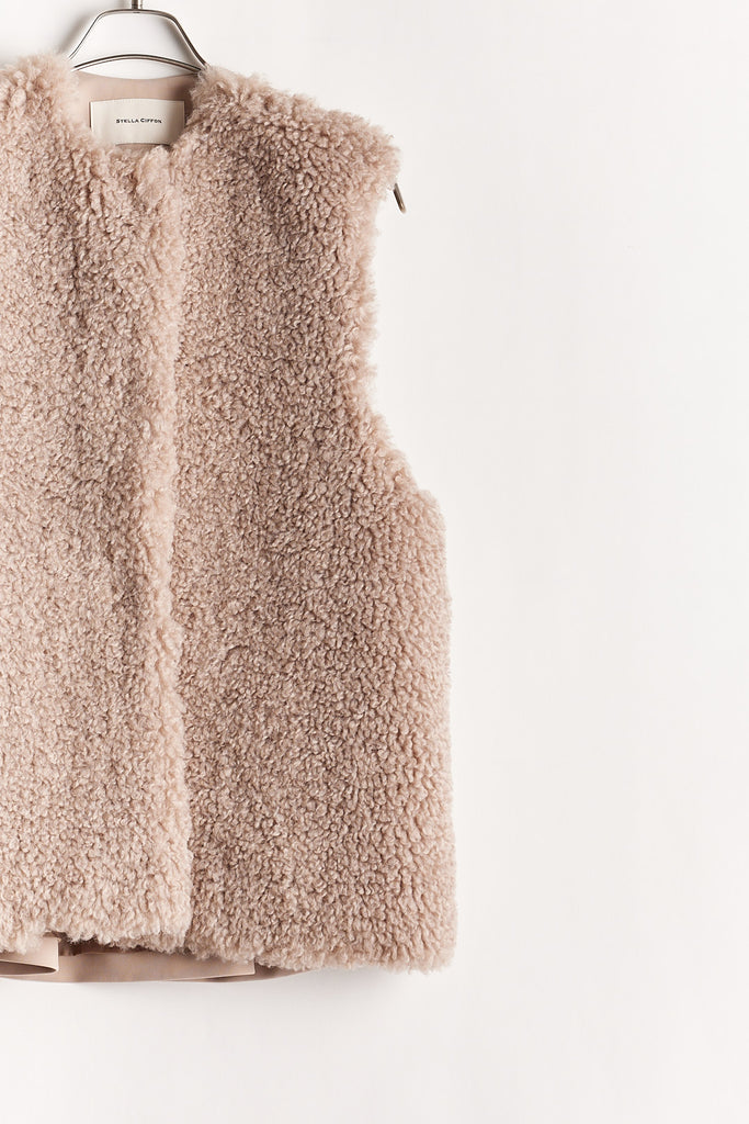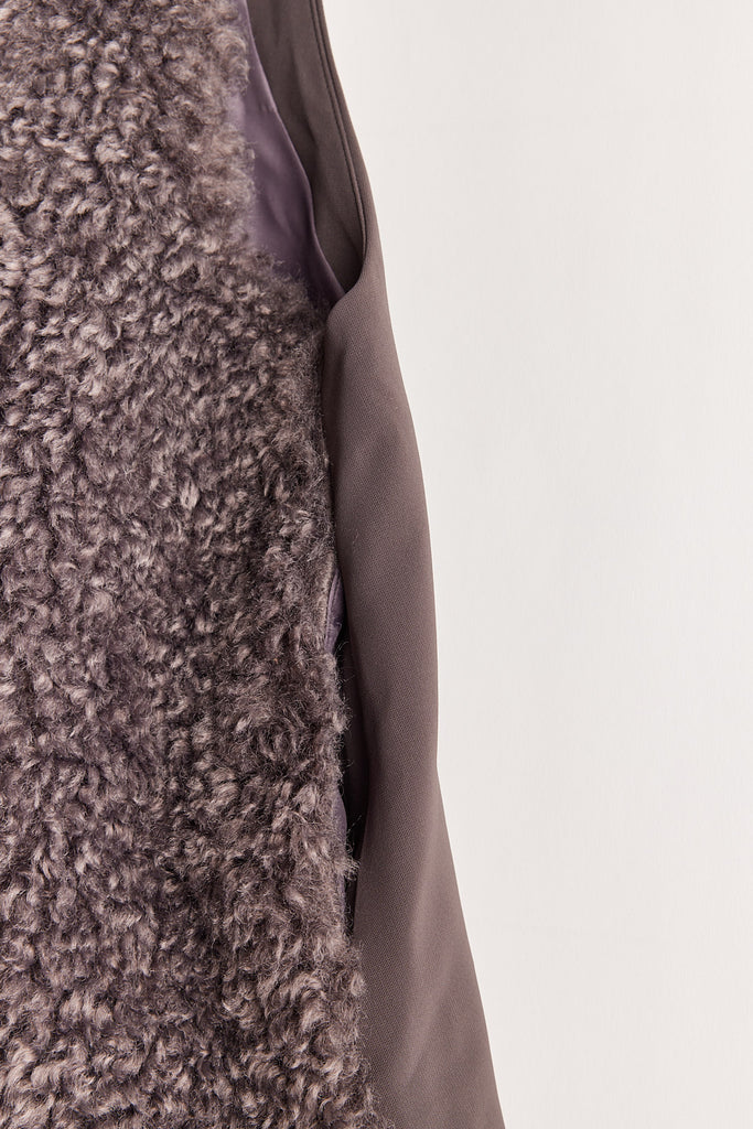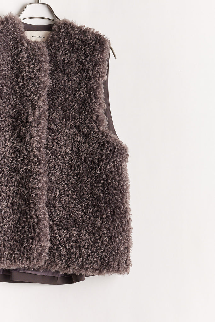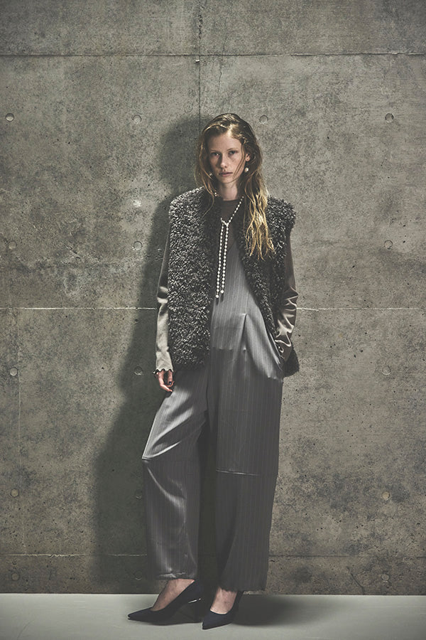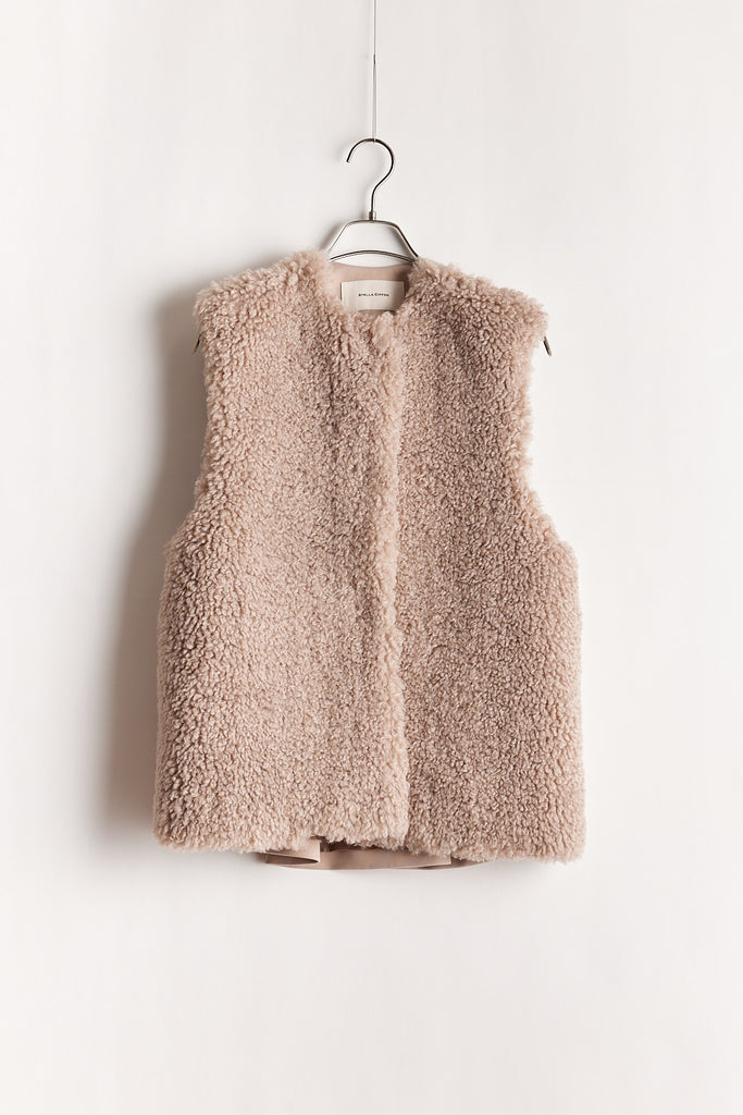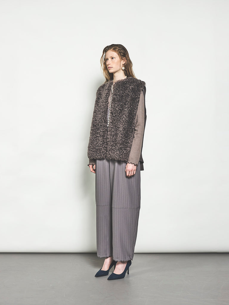 前身頃にフェイクファー×後ろ身頃にストレチの効いたTwillを使用したコンビベスト。すぐに季節感をプラスしてくれる主役級ベスト。ヒップも隠れる丈でややAラインのシルエット。インナーを選ばずにレーヤードしやすい型に仕上げました。裏地もついているのでニットやシャツの上にも滑りがよく着用可能。 コートのインにも着用できるので着用機会も多い一枚。後見頃に大きめのタックが入ったデザイン。。