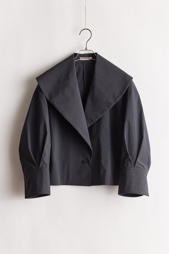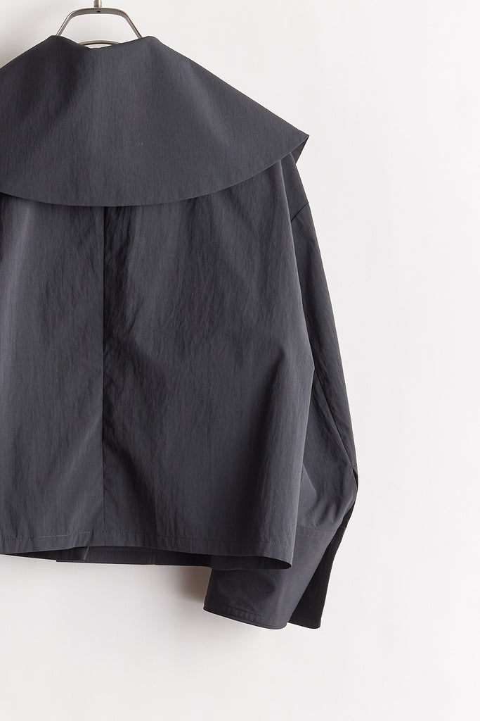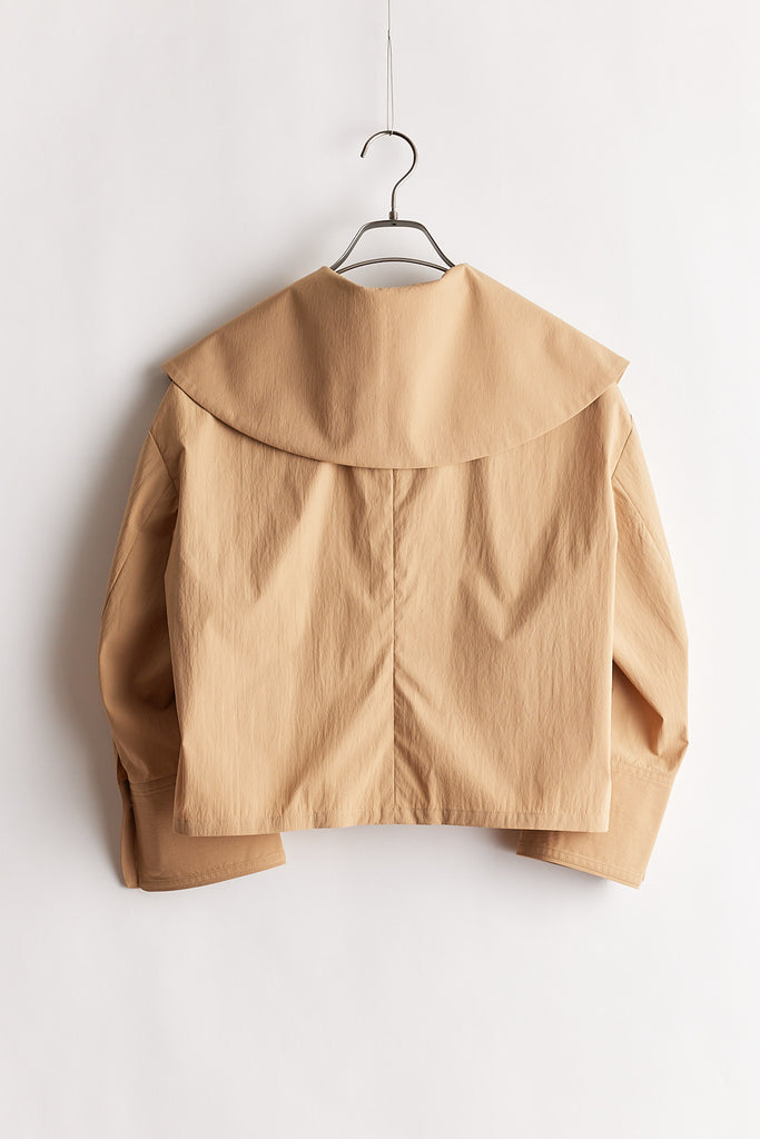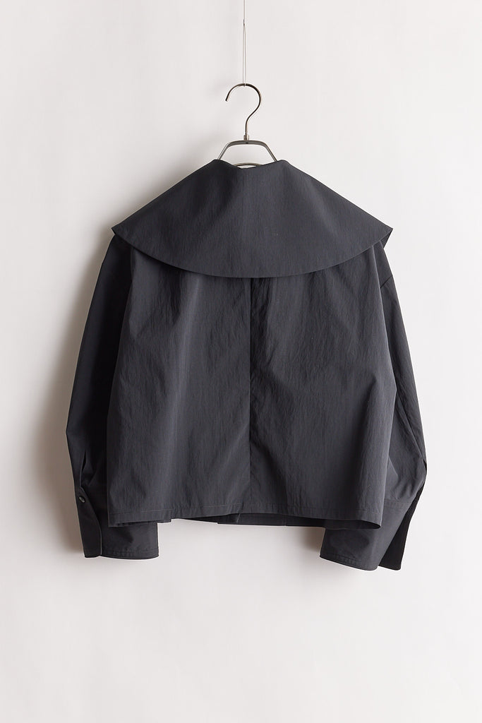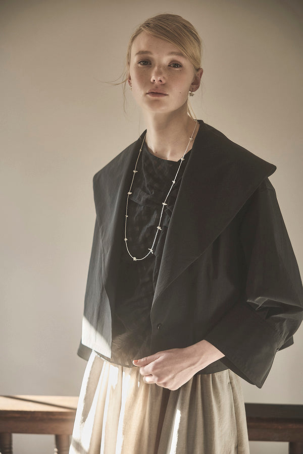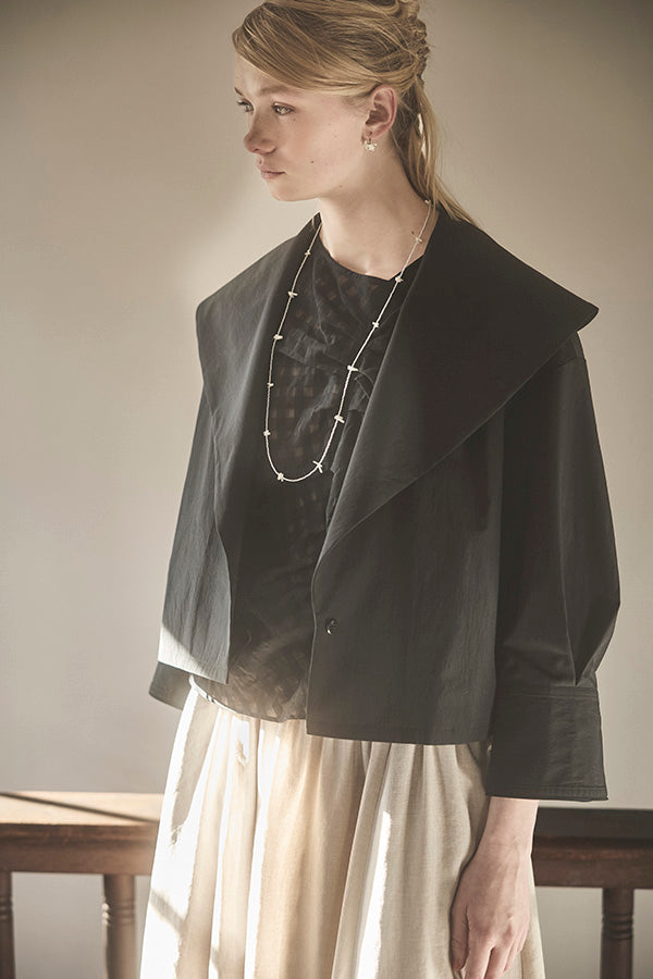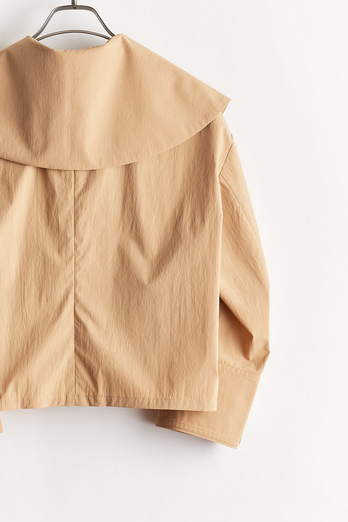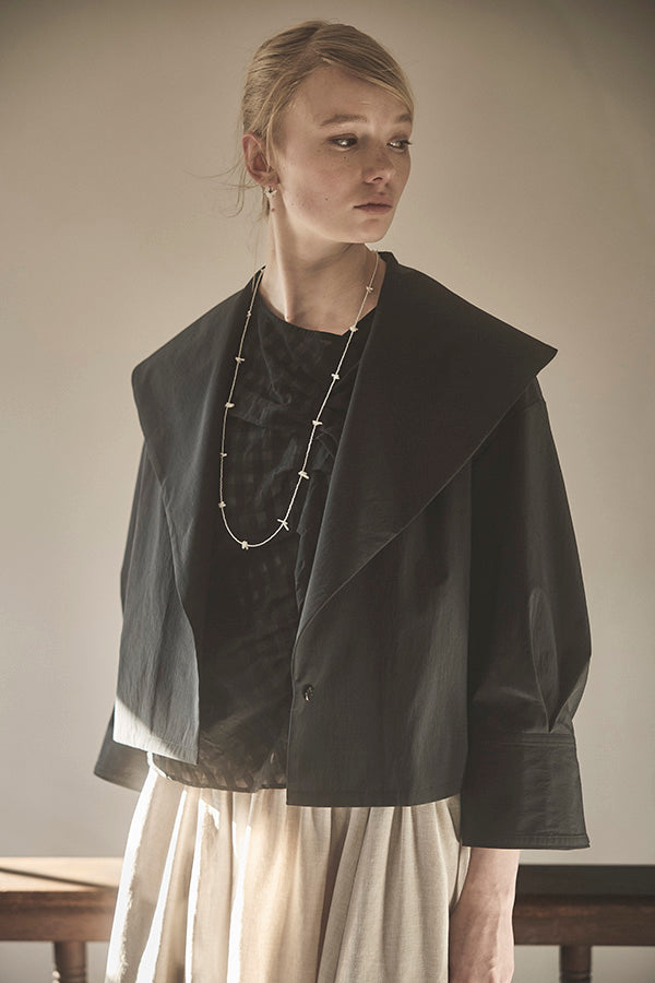 高密度に織り上げたタイプライター素材に、撥水加工を施したショートジャケット。適度なハリ感のある生地がシルエットを美しく保ち、軽やかで扱いやすい一着です。大きめの襟とコンパクトな丈感が特徴で、羽織るだけでバランスの取れたスタイリングに。カジュアルにもきれいめにも合わせやすく、季節の変わり目や天候が不安定な時期にも活躍します。デザイン性と実用性を兼ね備え、日常使いしやすい機能アウターとして存在感がある1枚。ワードローブに一枚あると心強いアイテムです。