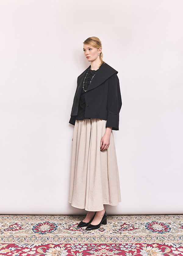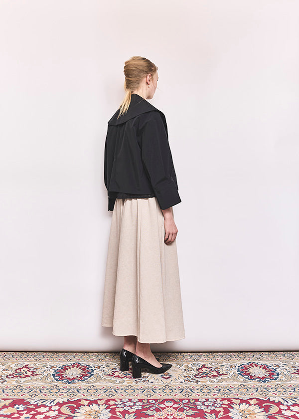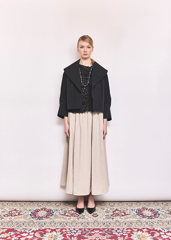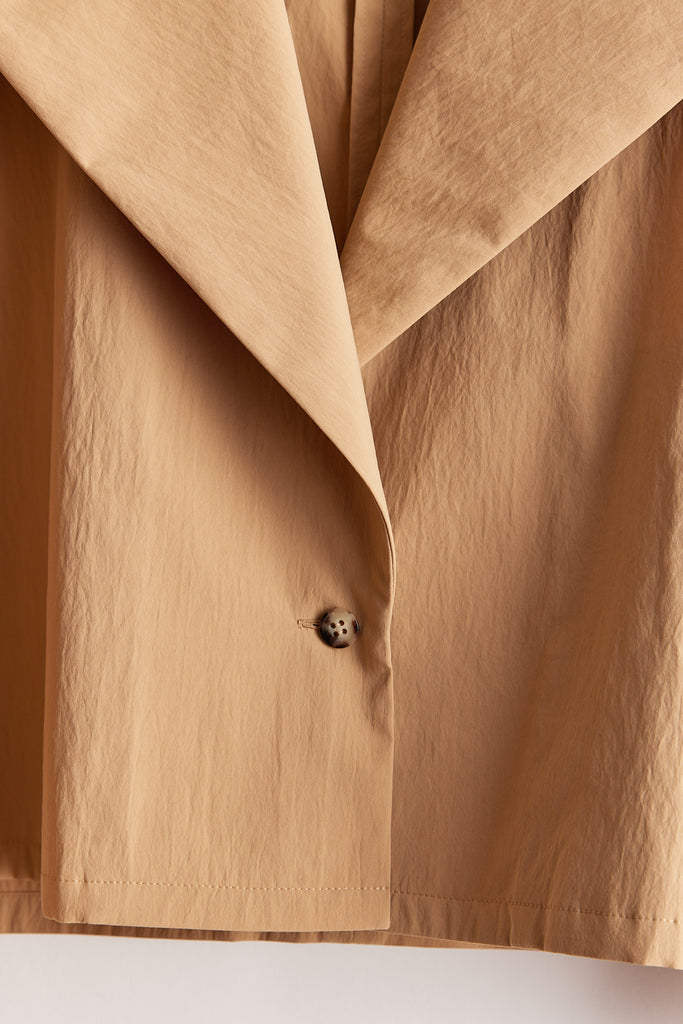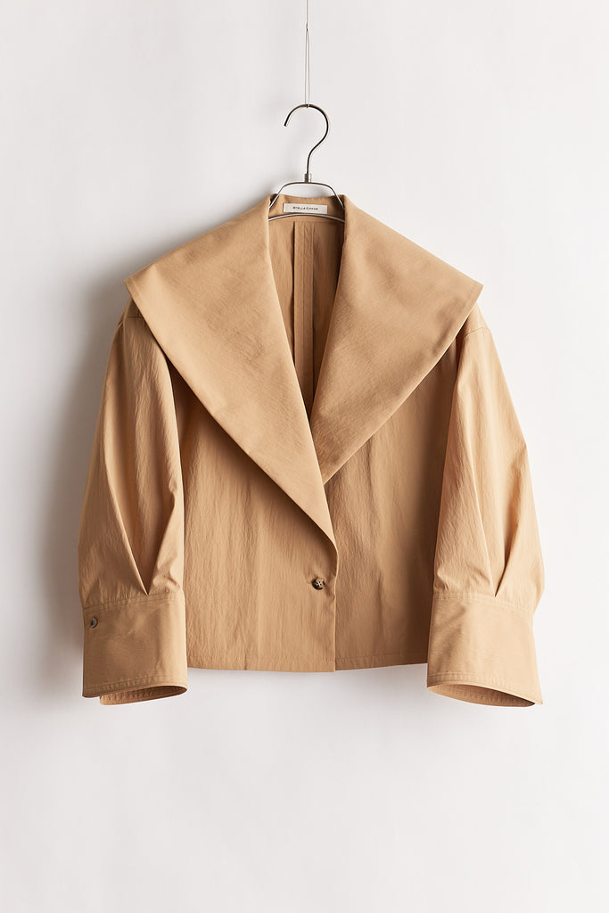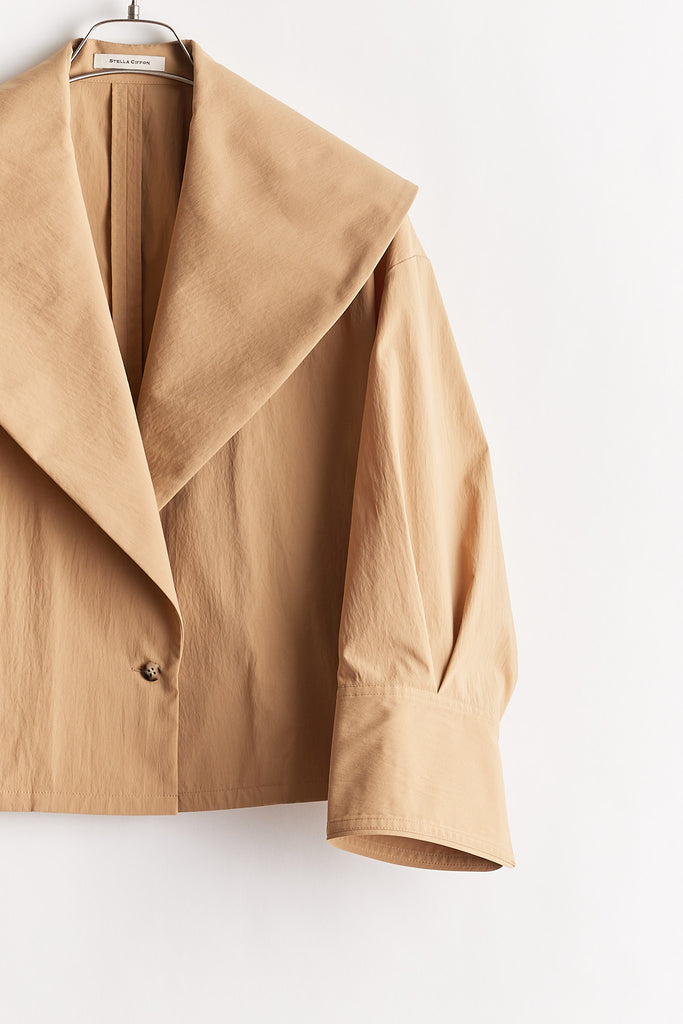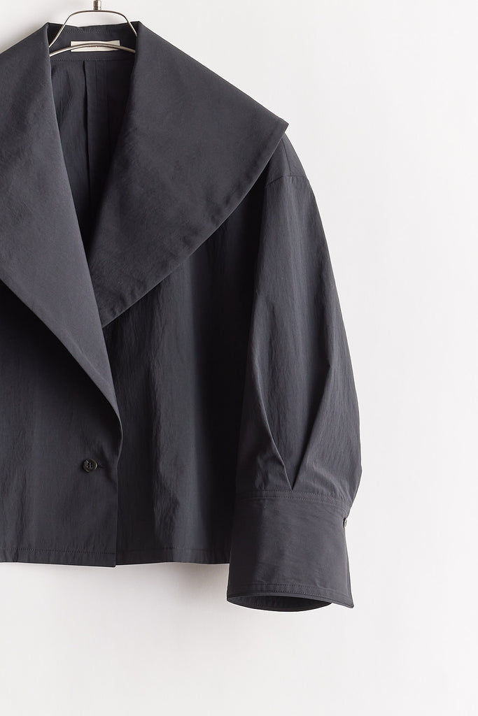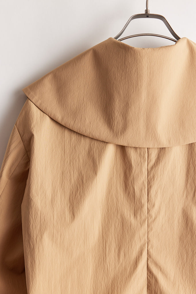 高密度に織り上げたタイプライター素材に、撥水加工を施したショートジャケット。適度なハリ感のある生地がシルエットを美しく保ち、軽やかで扱いやすい一着です。大きめの襟とコンパクトな丈感が特徴で、羽織るだけでバランスの取れたスタイリングに。カジュアルにもきれいめにも合わせやすく、季節の変わり目や天候が不安定な時期にも活躍します。デザイン性と実用性を兼ね備え、日常使いしやすい機能アウターとして存在感がある1枚。ワードローブに一枚あると心強いアイテムです。