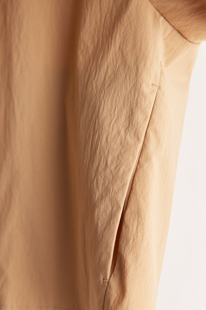 撥水スパンライクタイプライター(SY加工)フィラメント糸ながら、まるでコットン(スパン)のような質感を表現撥水加工済みで、雨や汚れに強いタイプライター特有のハリと軽さがあり、きれいめにもカジュアルにも対応可能セットアップからコートまで幅広く使えます。