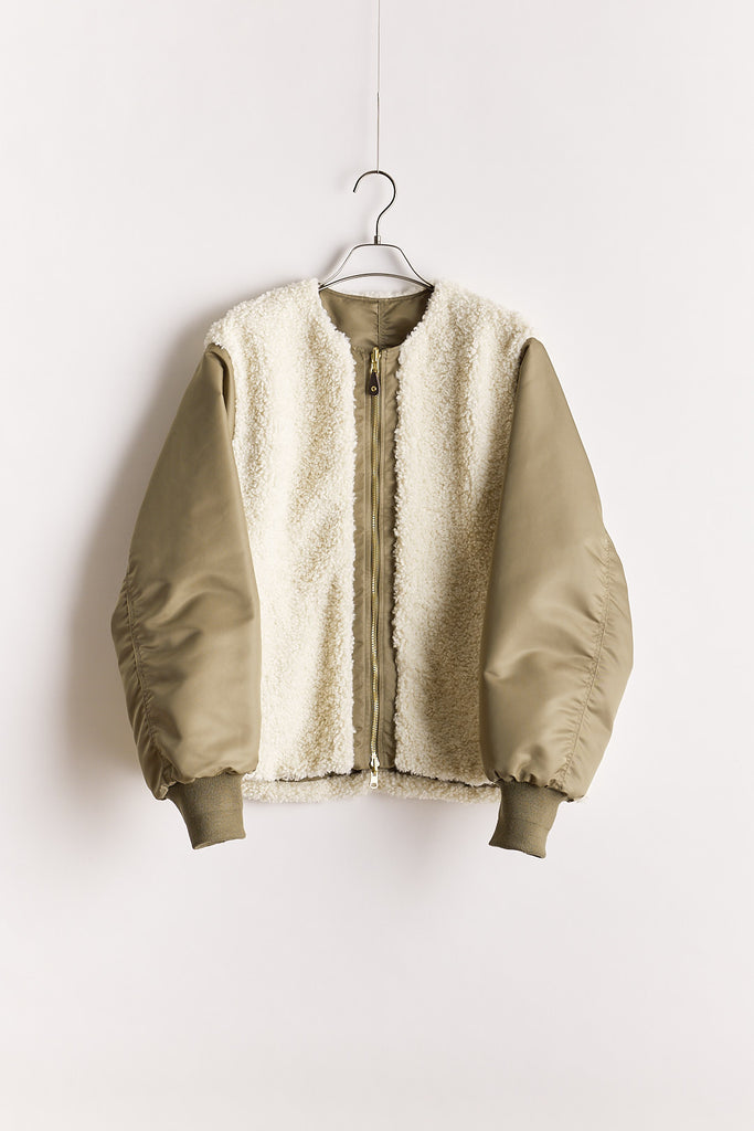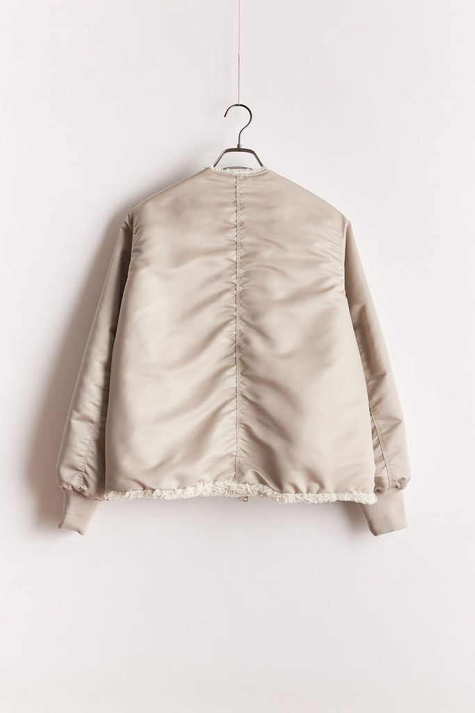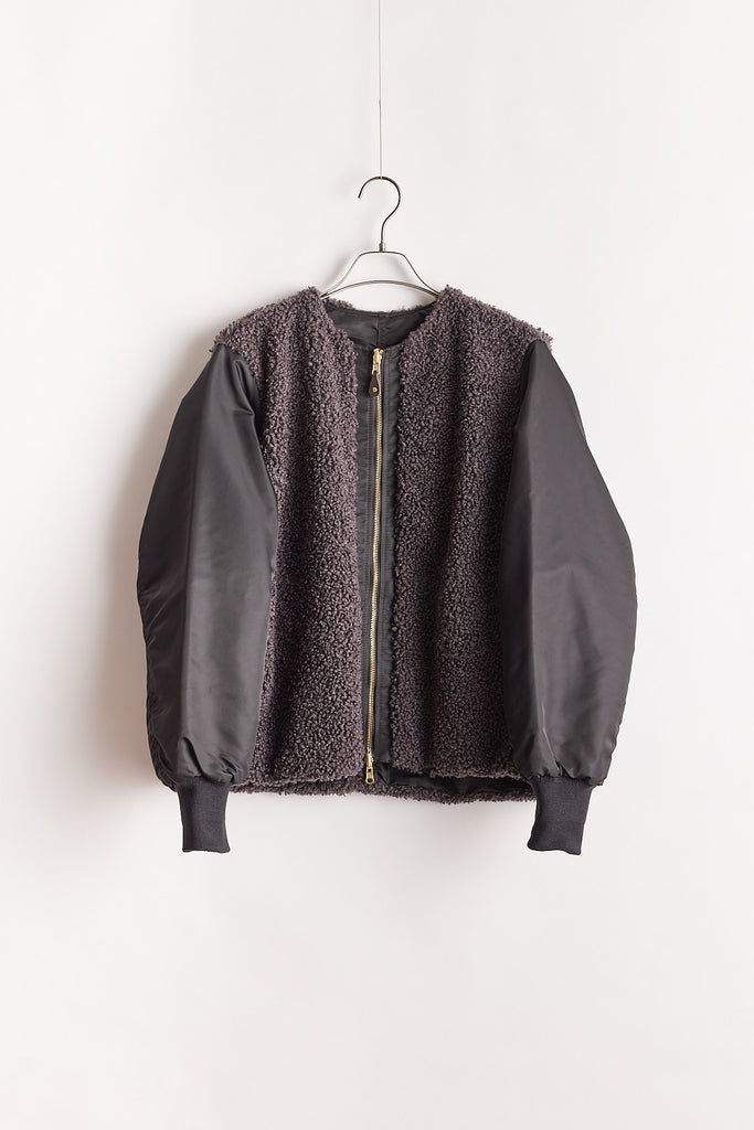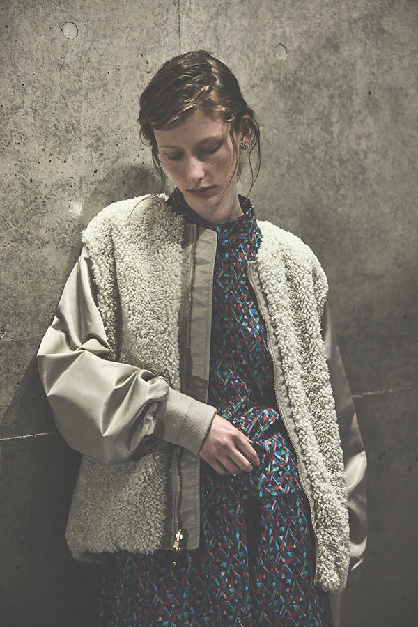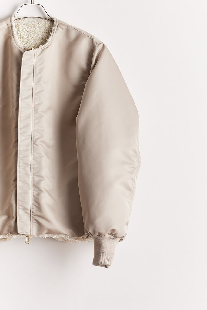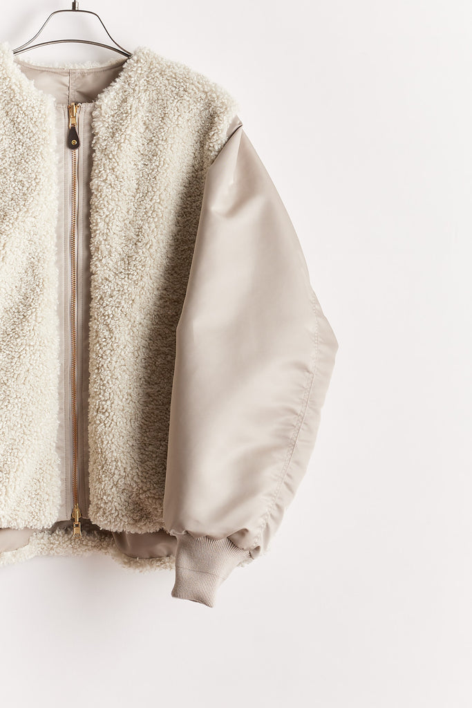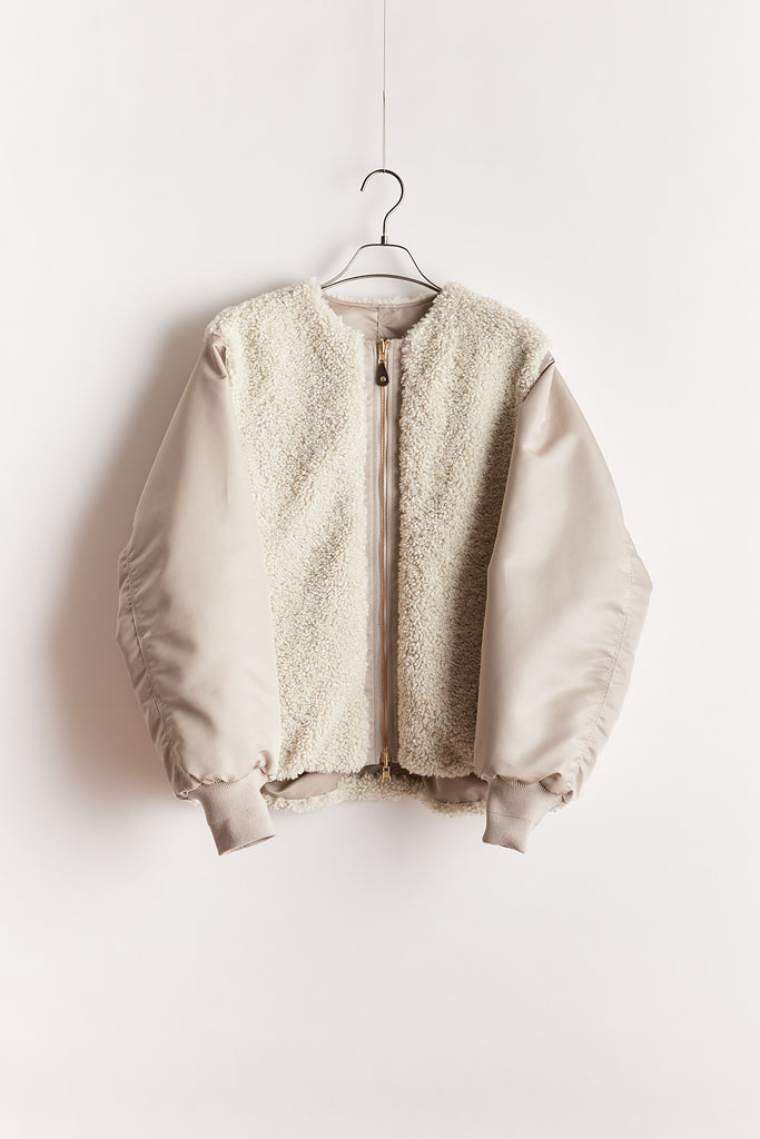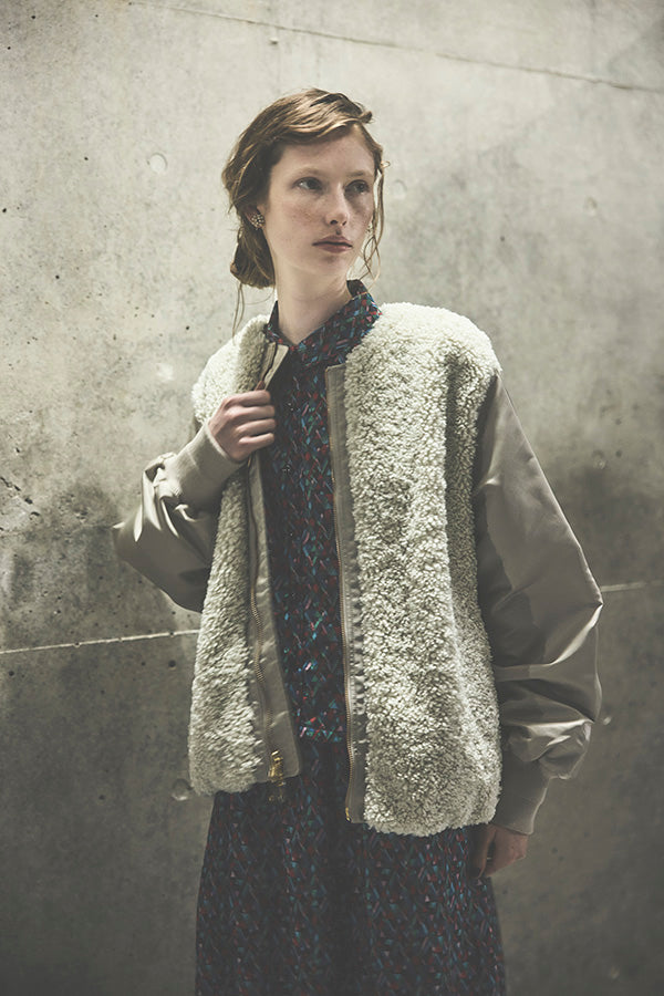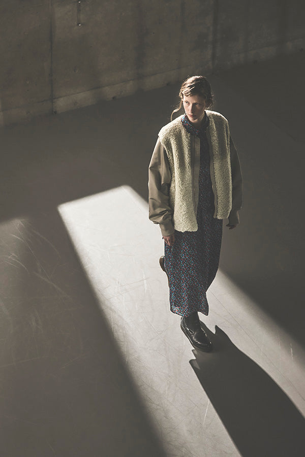 異素材の組み合わせが魅力的なフェイクファーコンビMA-1。ほんのりと光沢感がある上質なフェイクファーとベーシックな無地が楽しめるリバーシブル仕様。大人のカジュアルスタイルに溶け込む日常気にもぴったりな一着に仕上げました。適度なボリュームやゆったりとしたシルエットで仕上げつつも、着膨れしない所が拘りポイント。さっと羽織るだけで旬の着こなしをお楽しみいただけます。モード感漂うレザーライクなプリーツ スカートを合わせて軽やかなコーディネイトがおすすめ。