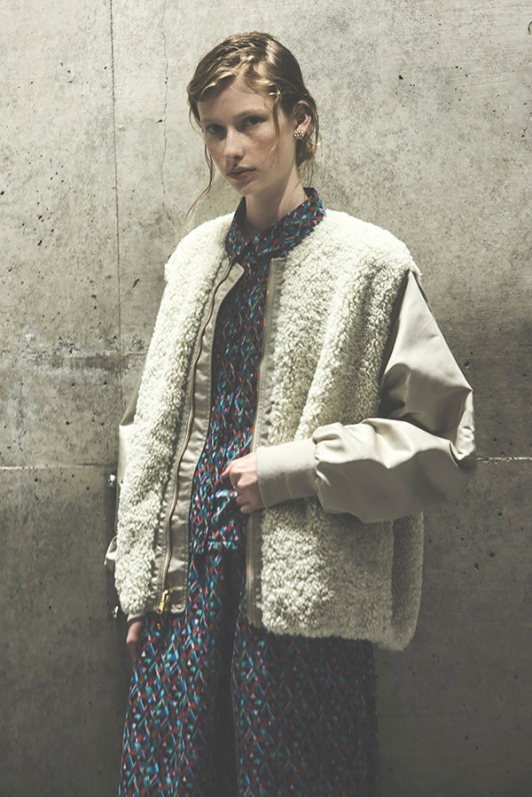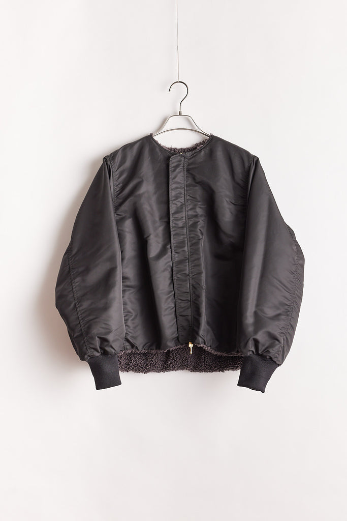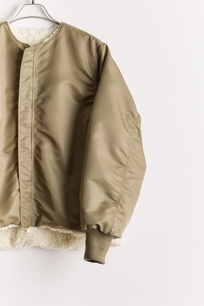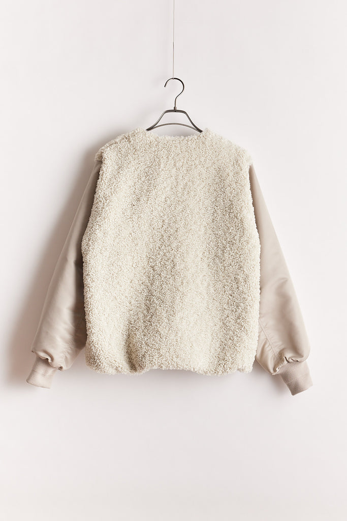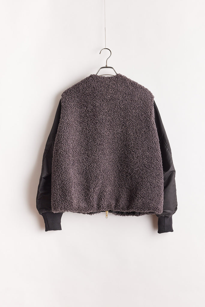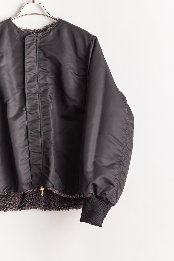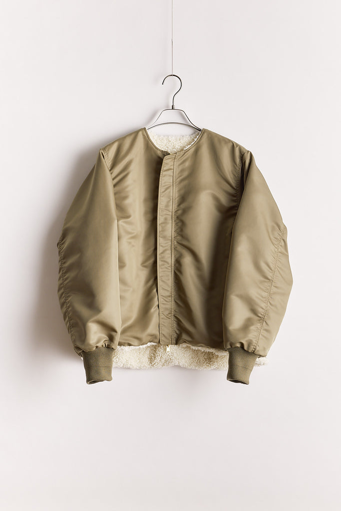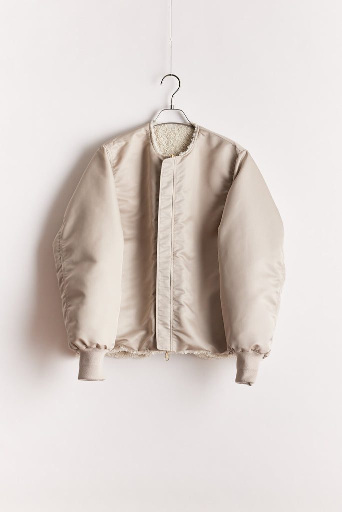 異素材の組み合わせが魅力的なフェイクファーコンビMA-1。ほんのりと光沢感がある上質なフェイクファーとベーシックな無地が楽しめるリバーシブル仕様。大人のカジュアルスタイルに溶け込む日常気にもぴったりな一着に仕上げました。適度なボリュームやゆったりとしたシルエットで仕上げつつも、着膨れしない所が拘りポイント。さっと羽織るだけで旬の着こなしをお楽しみいただけます。モード感漂うレザーライクなプリーツ スカートを合わせて軽やかなコーディネイトがおすすめ。