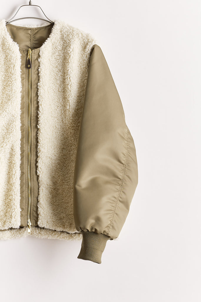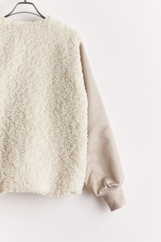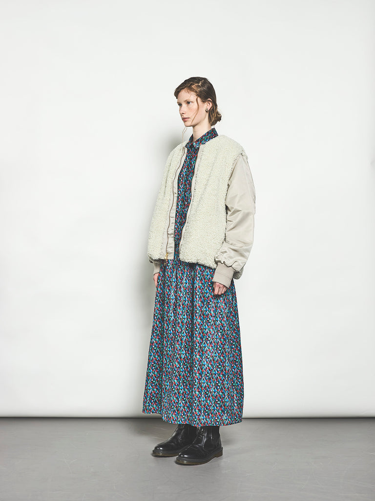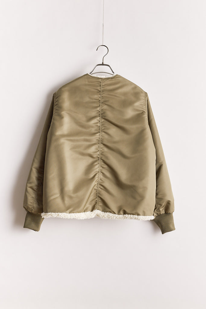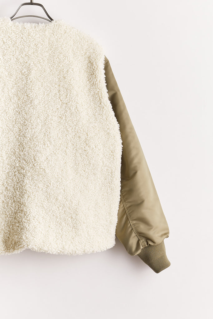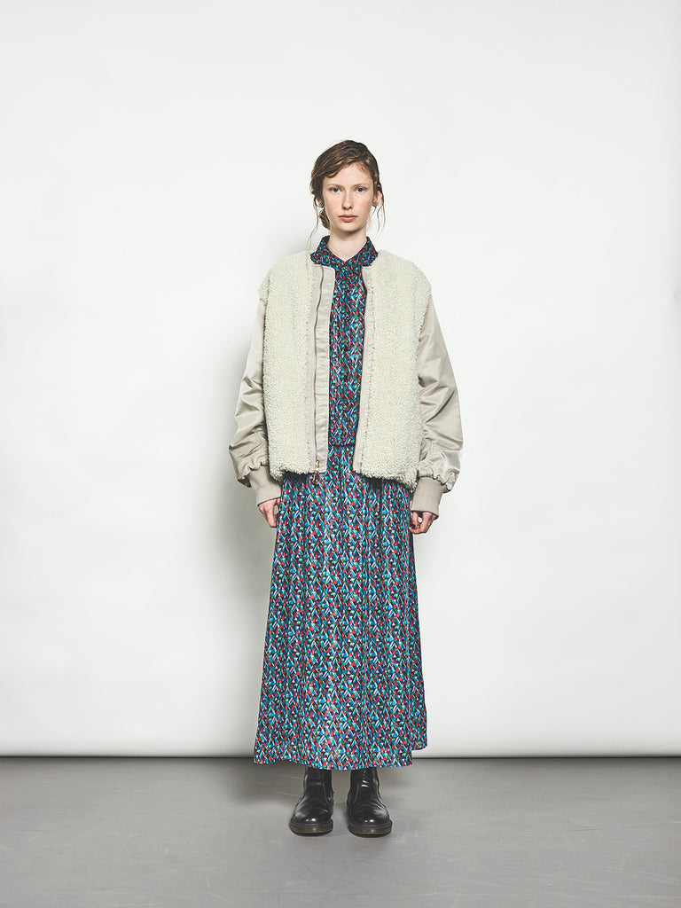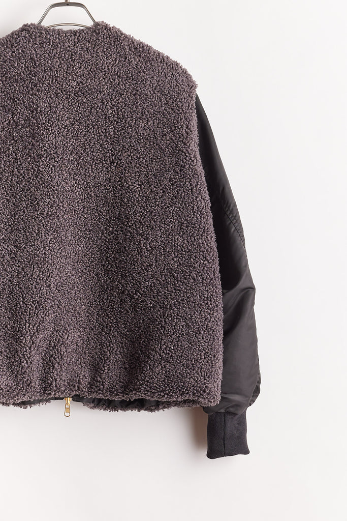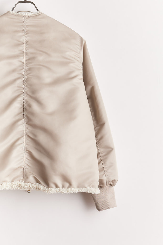 異素材の組み合わせが魅力的なフェイクファーコンビMA-1。ほんのりと光沢感がある上質なフェイクファーとベーシックな無地が楽しめるリバーシブル仕様。大人のカジュアルスタイルに溶け込む日常気にもぴったりな一着に仕上げました。適度なボリュームやゆったりとしたシルエットで仕上げつつも、着膨れしない所が拘りポイント。さっと羽織るだけで旬の着こなしをお楽しみいただけます。モード感漂うレザーライクなプリーツ スカートを合わせて軽やかなコーディネイトがおすすめ。