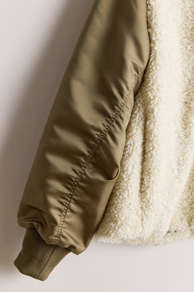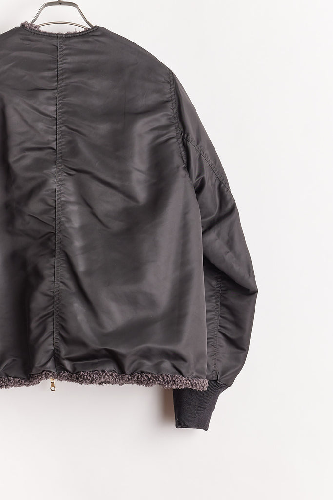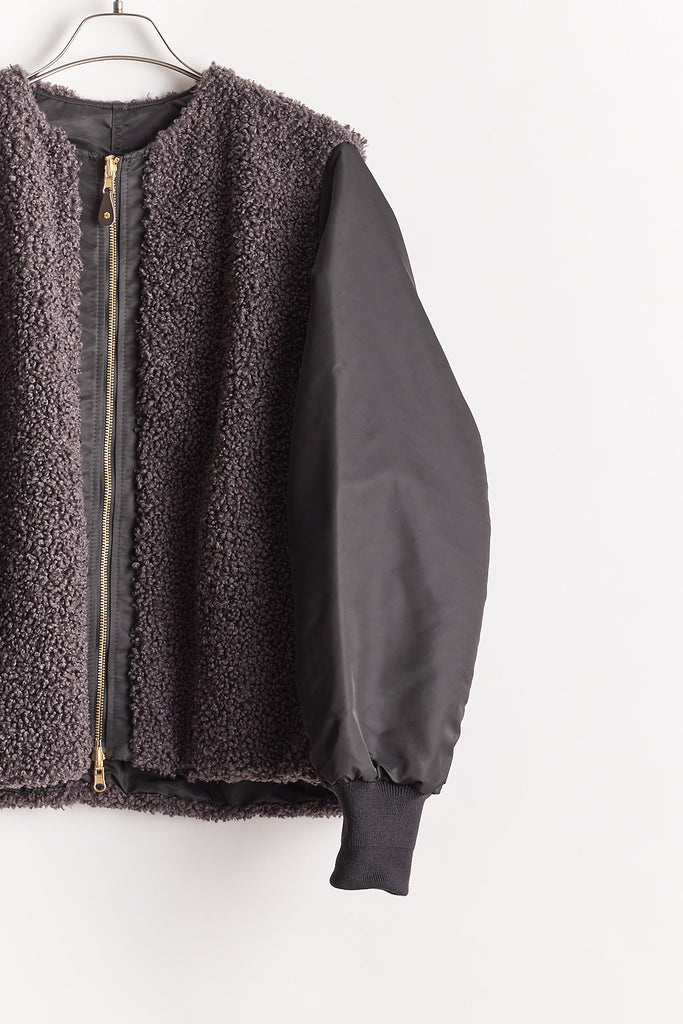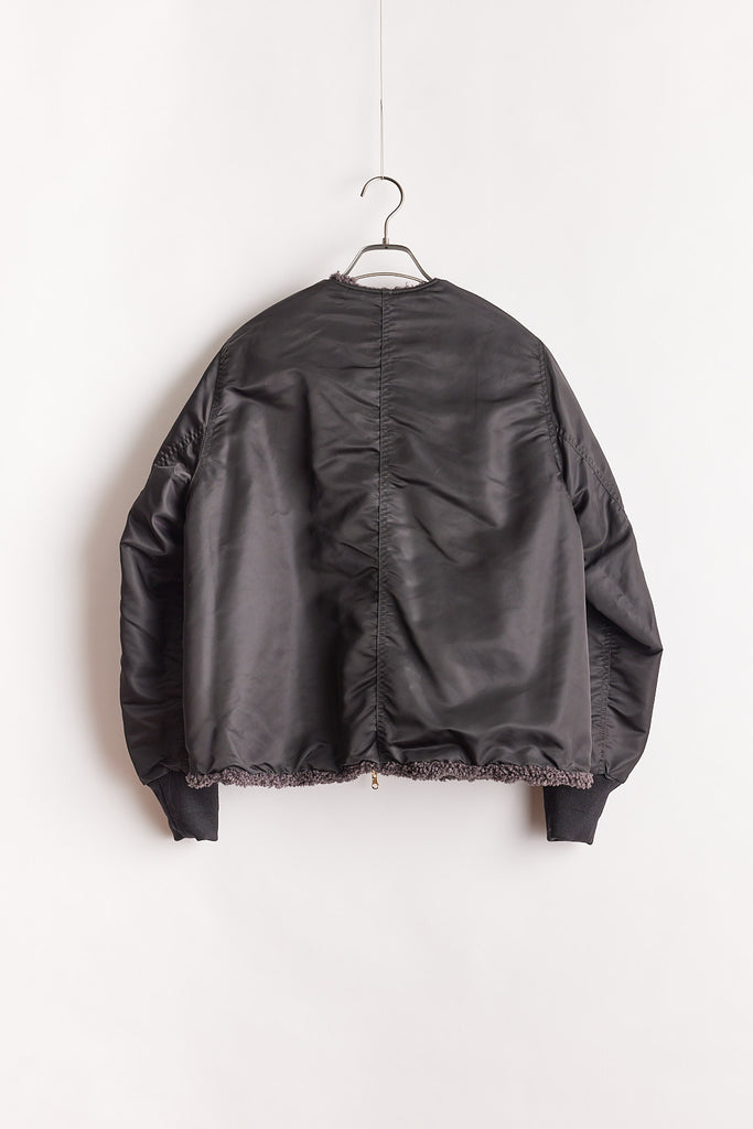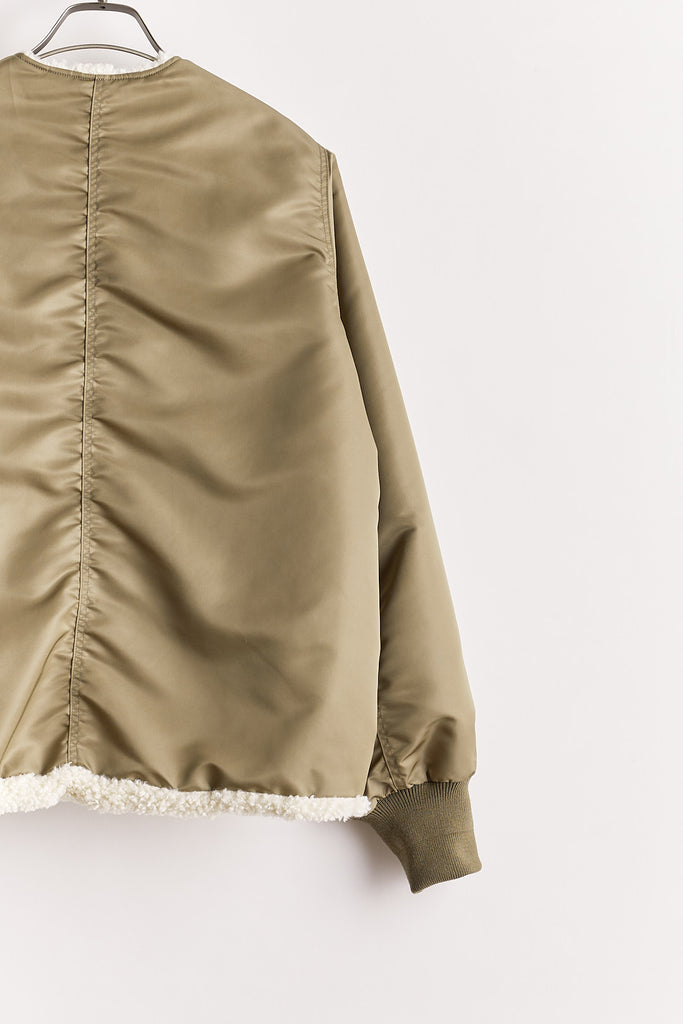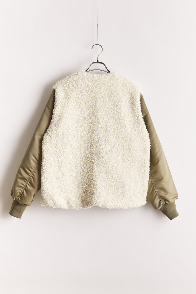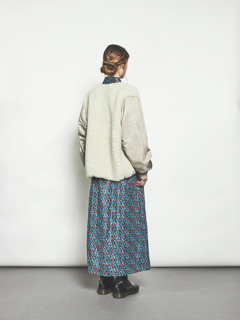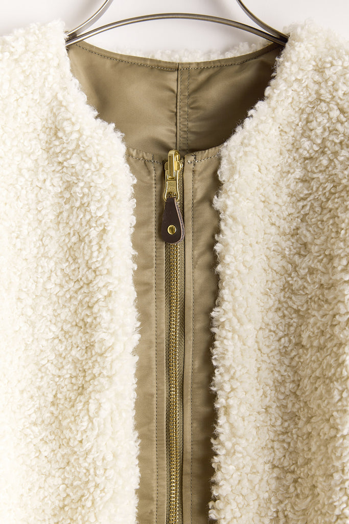 異素材の組み合わせが魅力的なフェイクファーコンビMA-1。ほんのりと光沢感がある上質なフェイクファーとベーシックな無地が楽しめるリバーシブル仕様。大人のカジュアルスタイルに溶け込む日常気にもぴったりな一着に仕上げました。適度なボリュームやゆったりとしたシルエットで仕上げつつも、着膨れしない所が拘りポイント。さっと羽織るだけで旬の着こなしをお楽しみいただけます。モード感漂うレザーライクなプリーツ スカートを合わせて軽やかなコーディネイトがおすすめ。