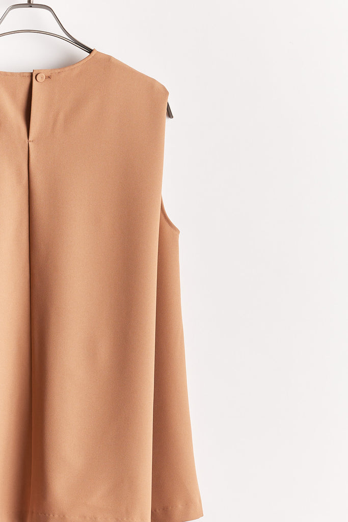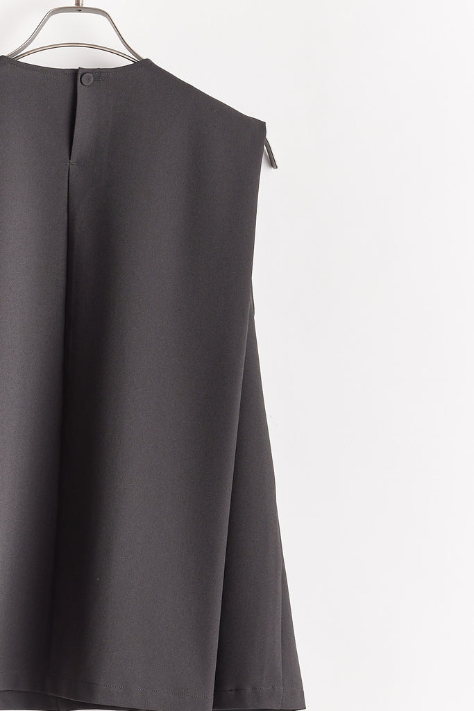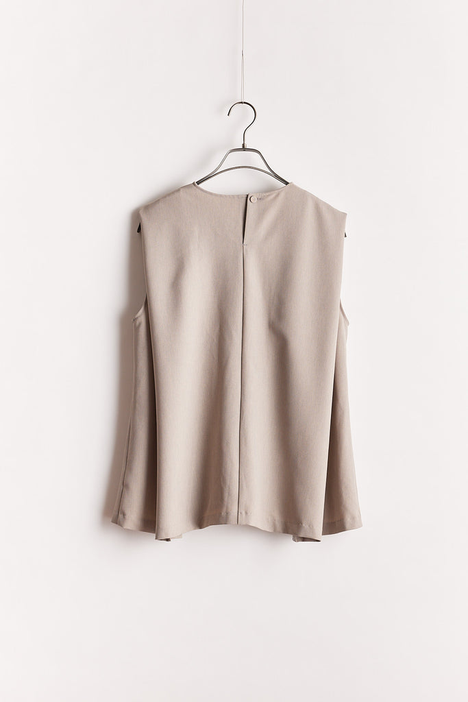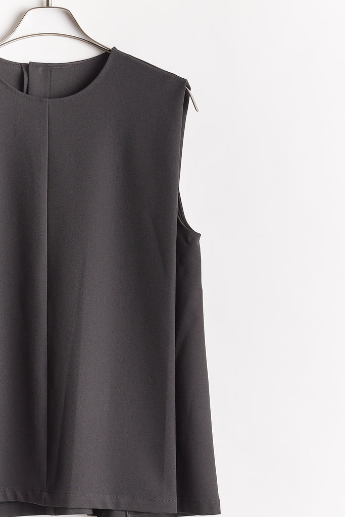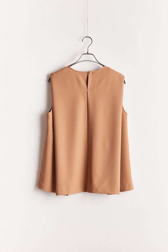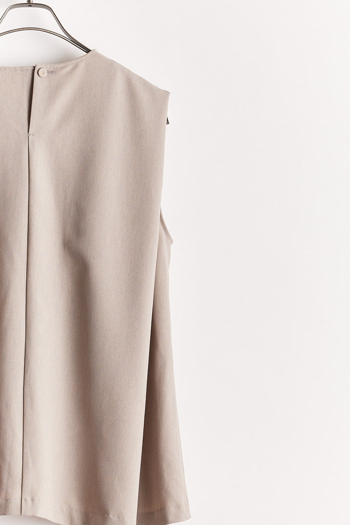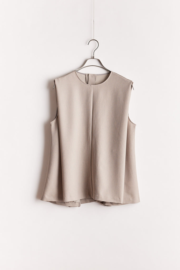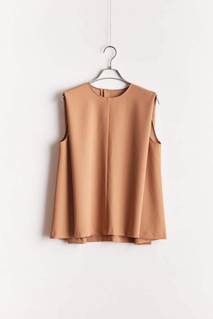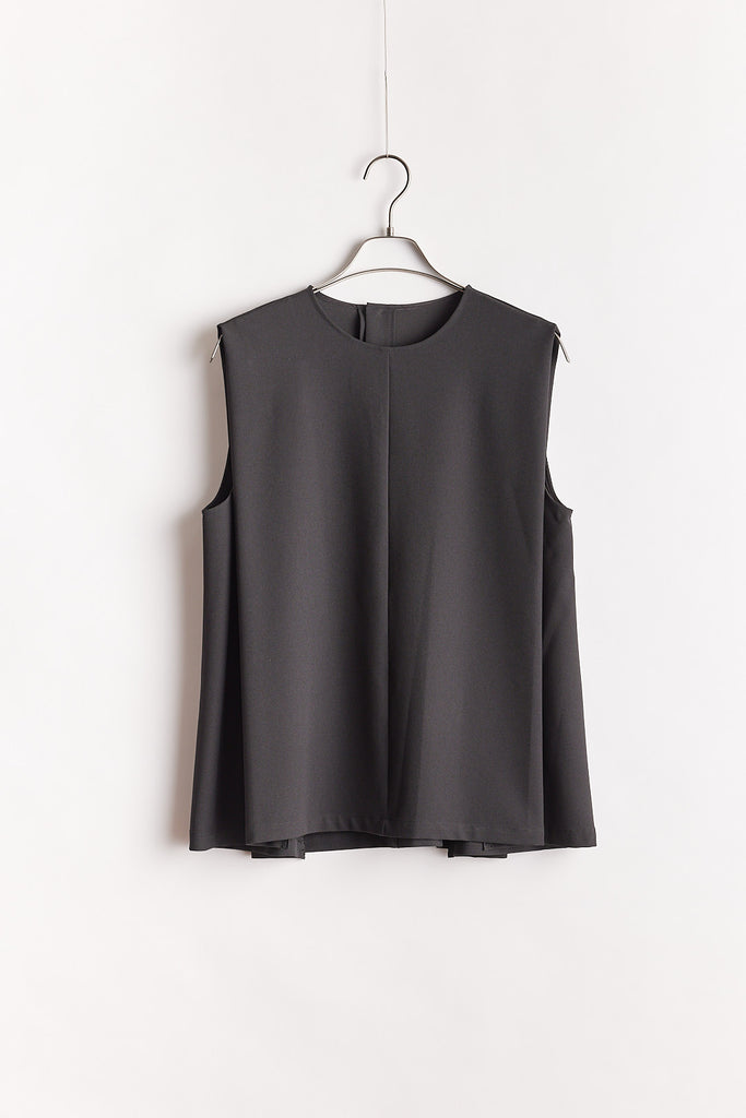 さらっとしたドライタッチな風合いとドレープ感があり程よいふくらみ感のあるスリーブレスブラウス。 きちんと見えるクルーネックに、両サイドに揺れるドレープ感とタックを取ったアームホールが エレガントな雰囲気を演出。少し長めの着丈と裾にかけて絶妙に広がるシルエットが品良く様になるから、 通勤や休日のお出掛けシーンなど幅広く活躍します。 同素材のパンツとSETUPがおすすめです。※裾の始末が三つ折りステッチに変更になります。