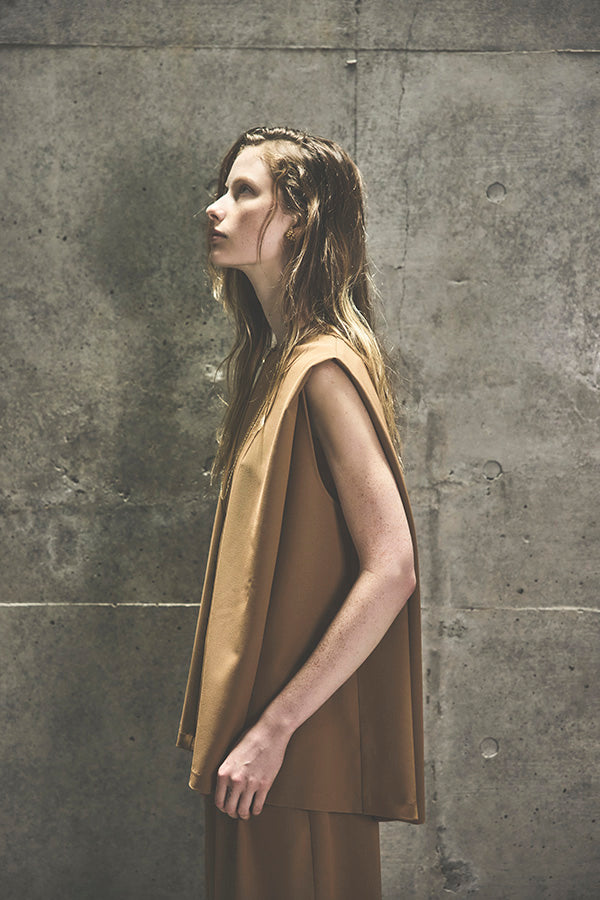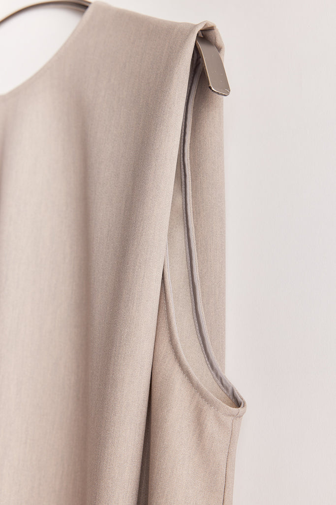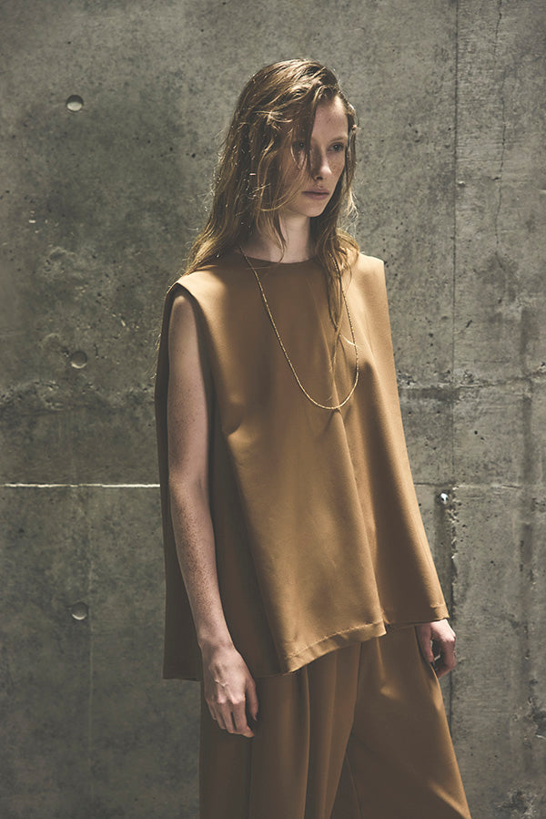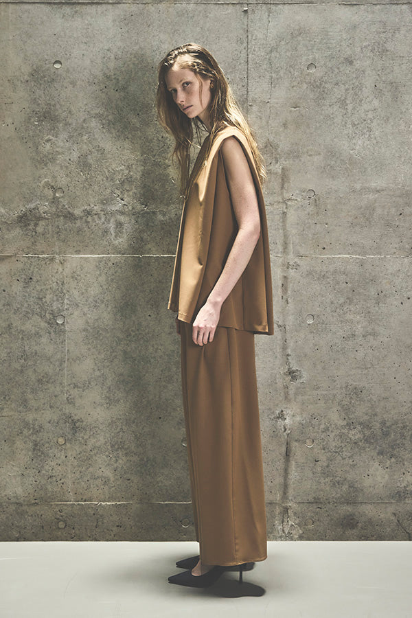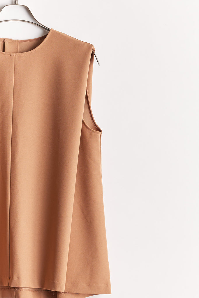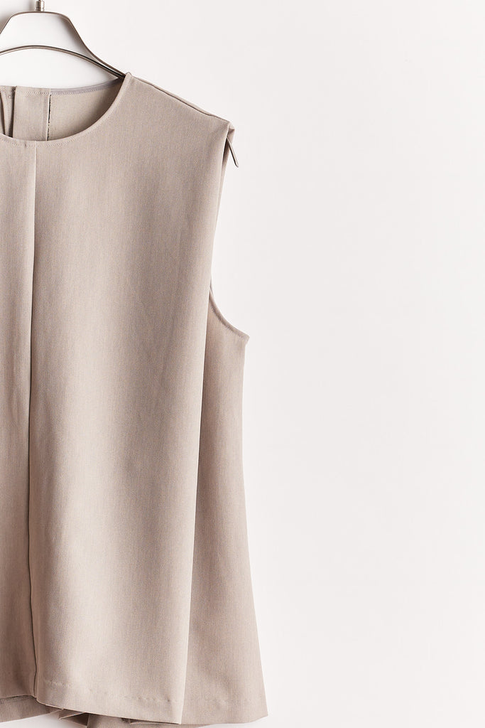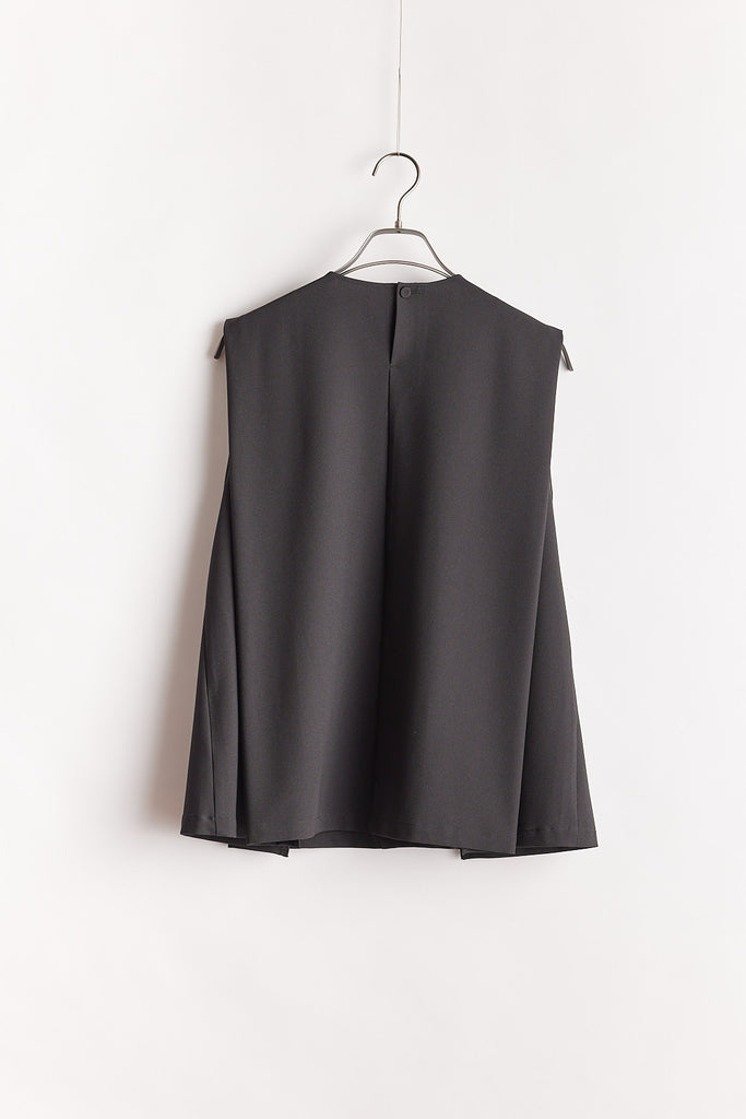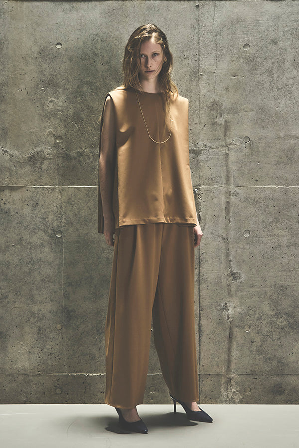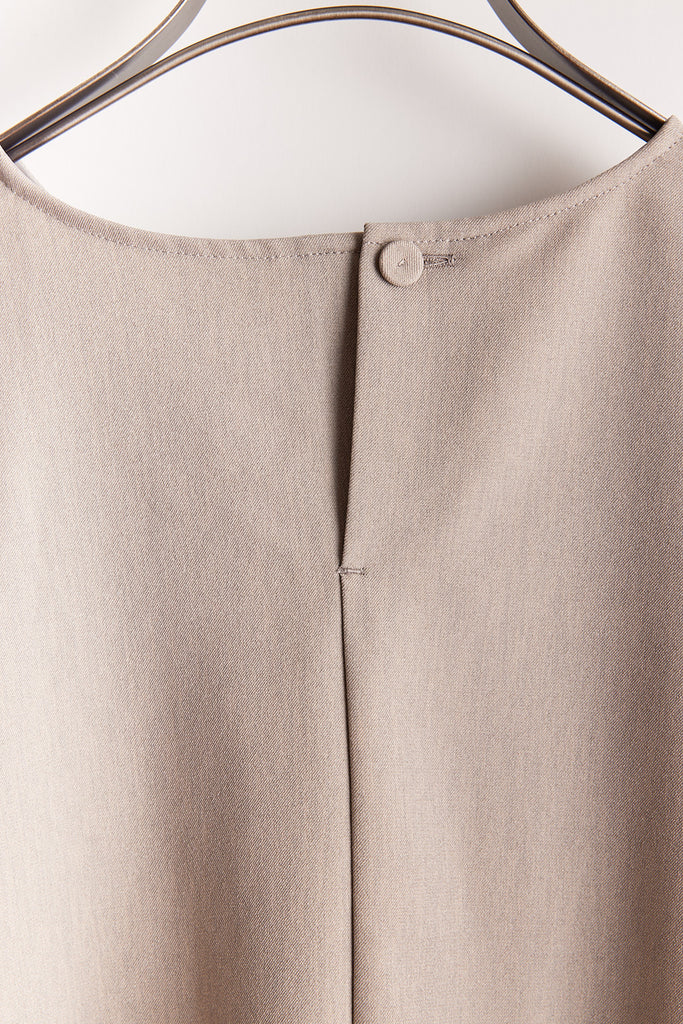 さらっとしたドライタッチな風合いとドレープ感があり程よいふくらみ感のあるスリーブレスブラウス。 きちんと見えるクルーネックに、両サイドに揺れるドレープ感とタックを取ったアームホールが エレガントな雰囲気を演出。少し長めの着丈と裾にかけて絶妙に広がるシルエットが品良く様になるから、 通勤や休日のお出掛けシーンなど幅広く活躍します。 同素材のパンツとSETUPがおすすめです。※裾の始末が三つ折りステッチに変更になります。
